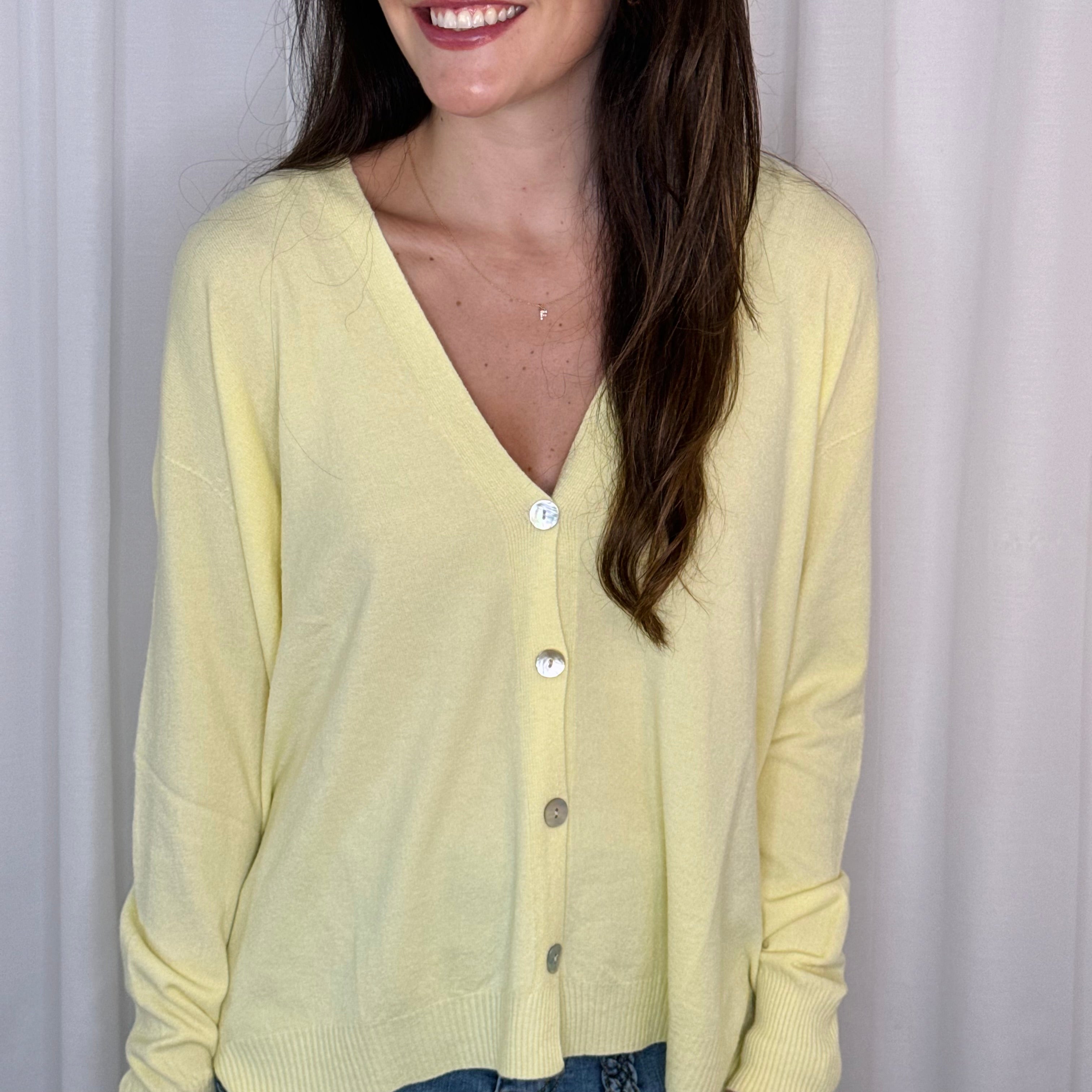 Cardigan malha confortável. Aperta com botões em madrepérola.