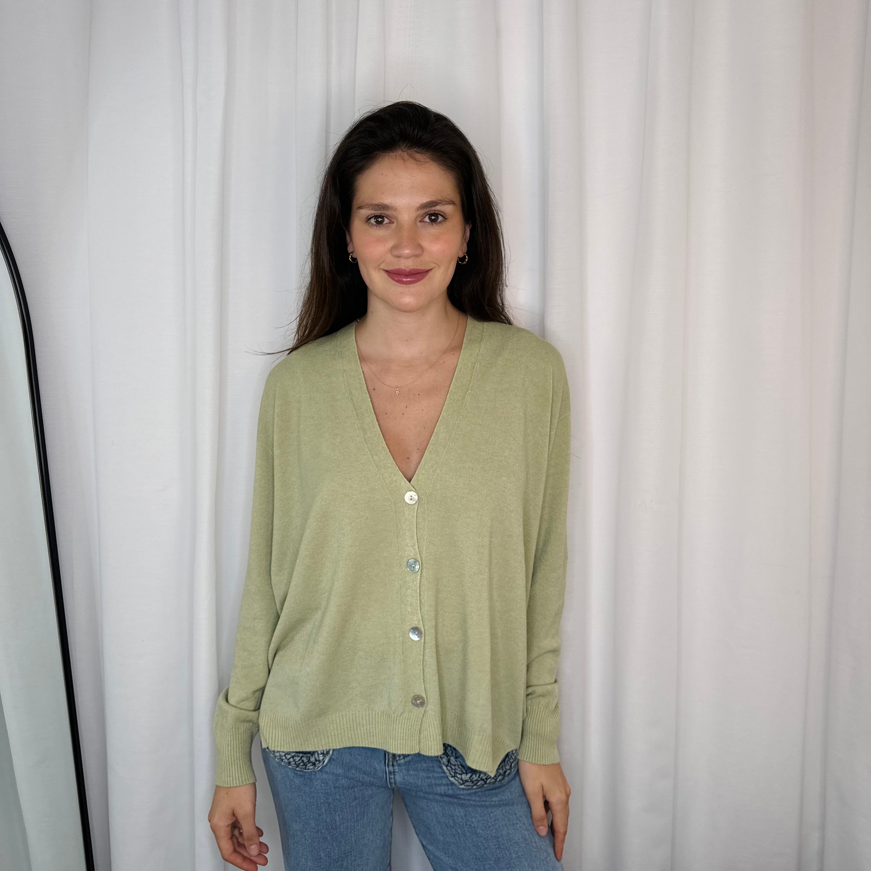 Cardigan malha confortável. Aperta com botões em madrepérola.