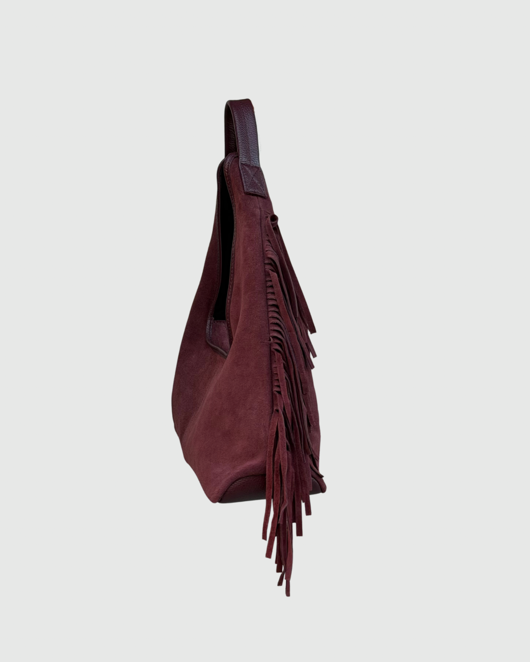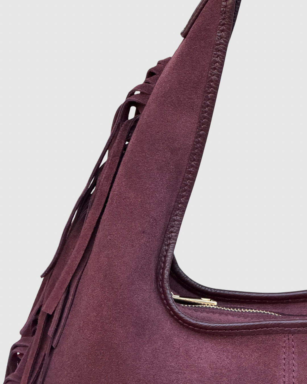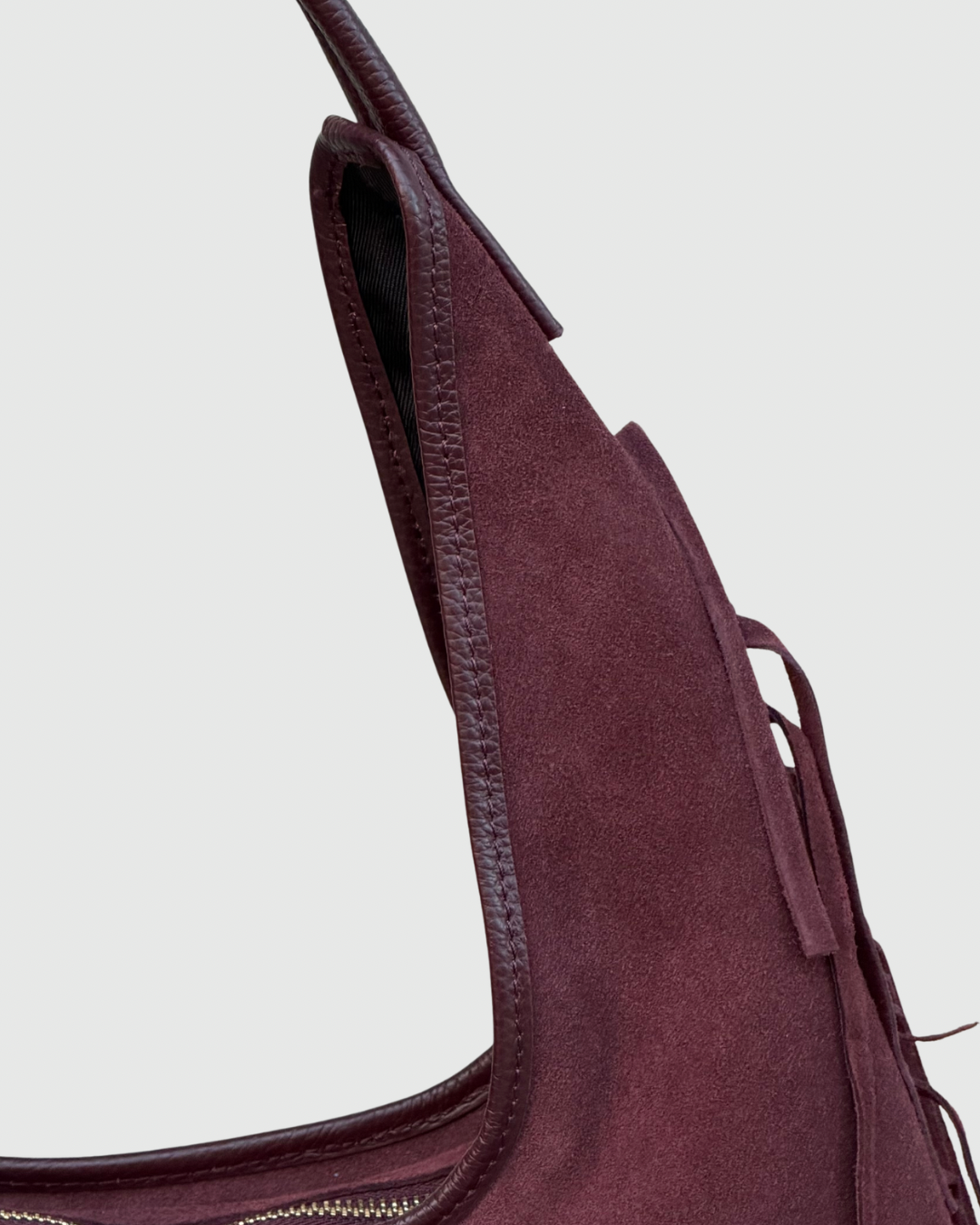 Carteira em pele camurça. Franjas nas laterais. Aperta com fecho.