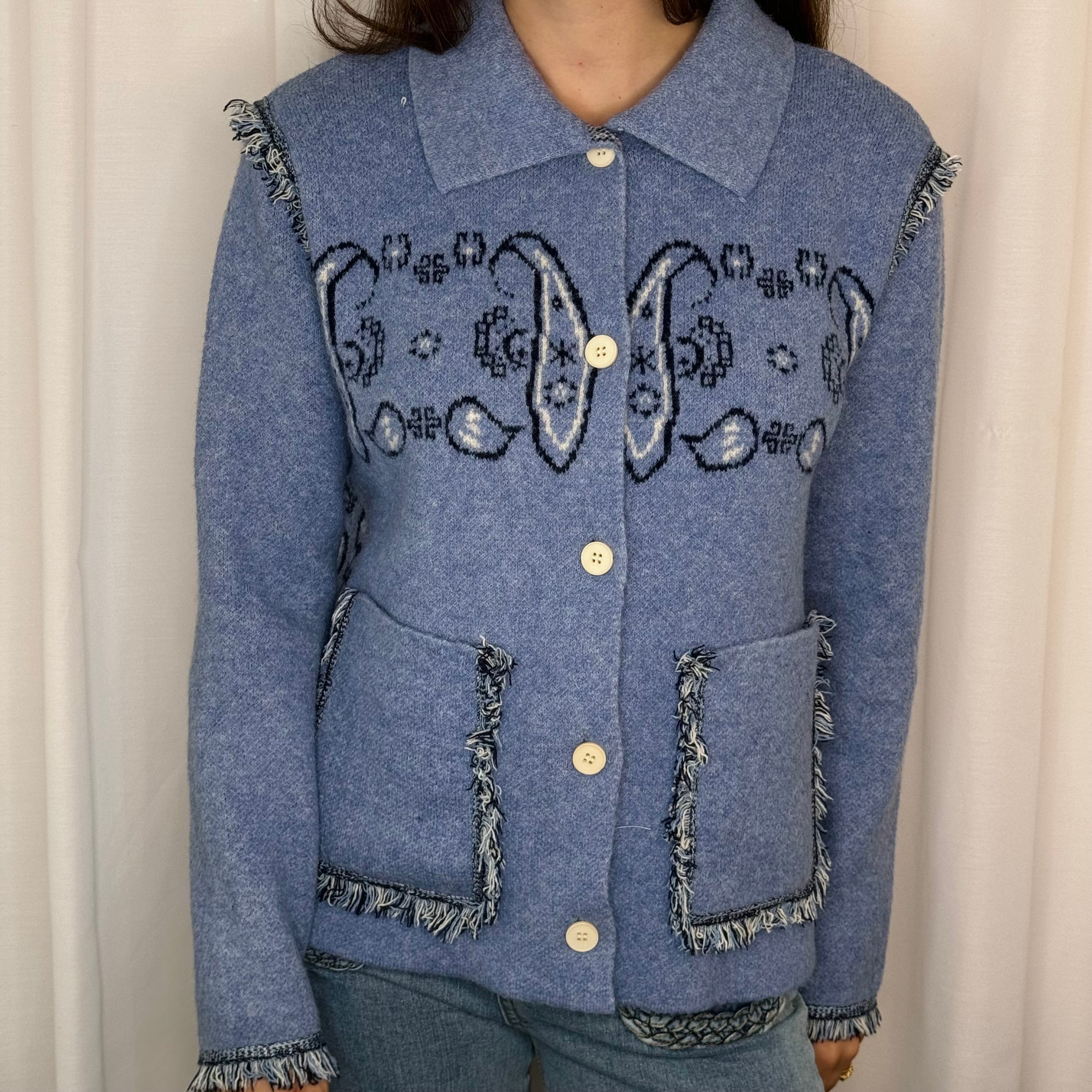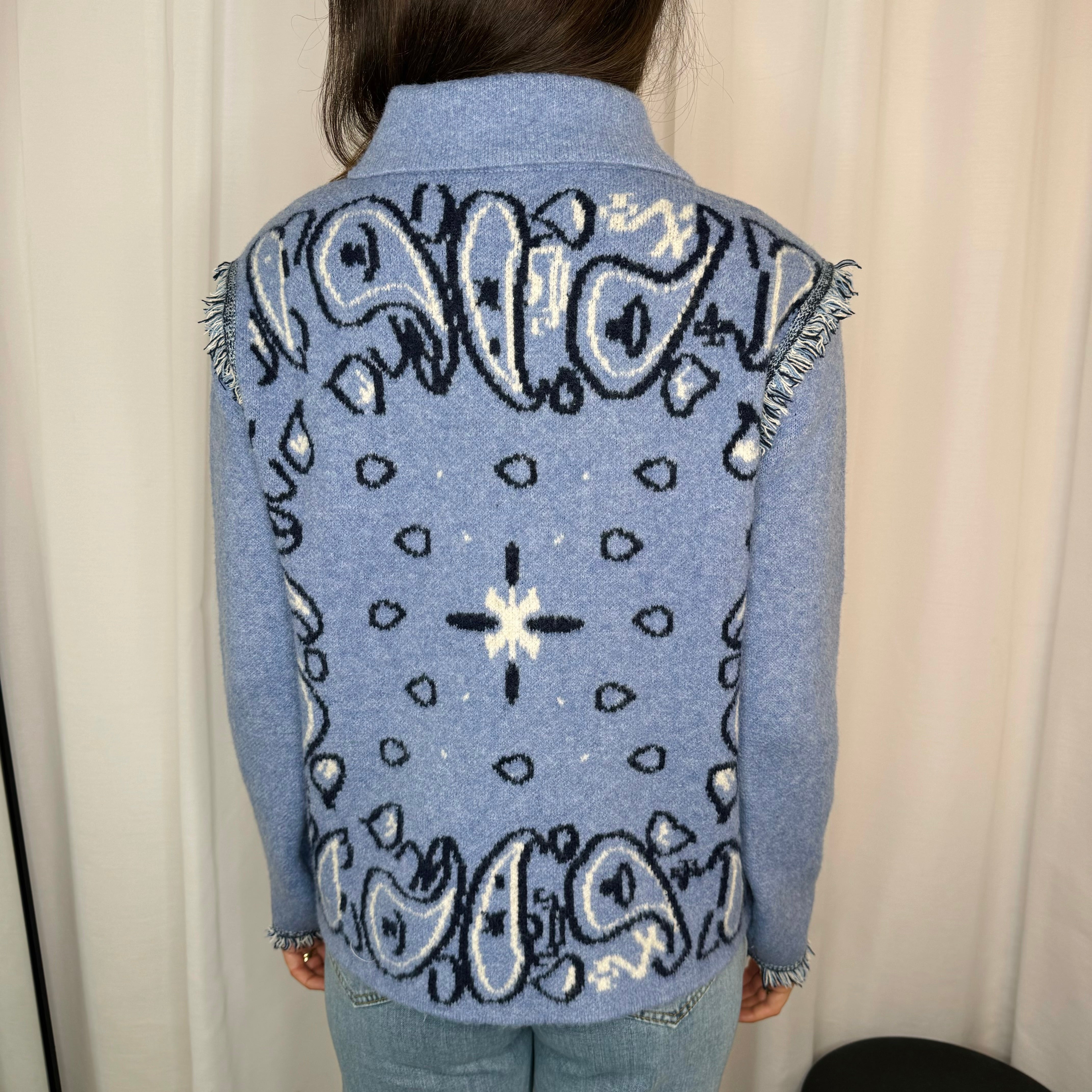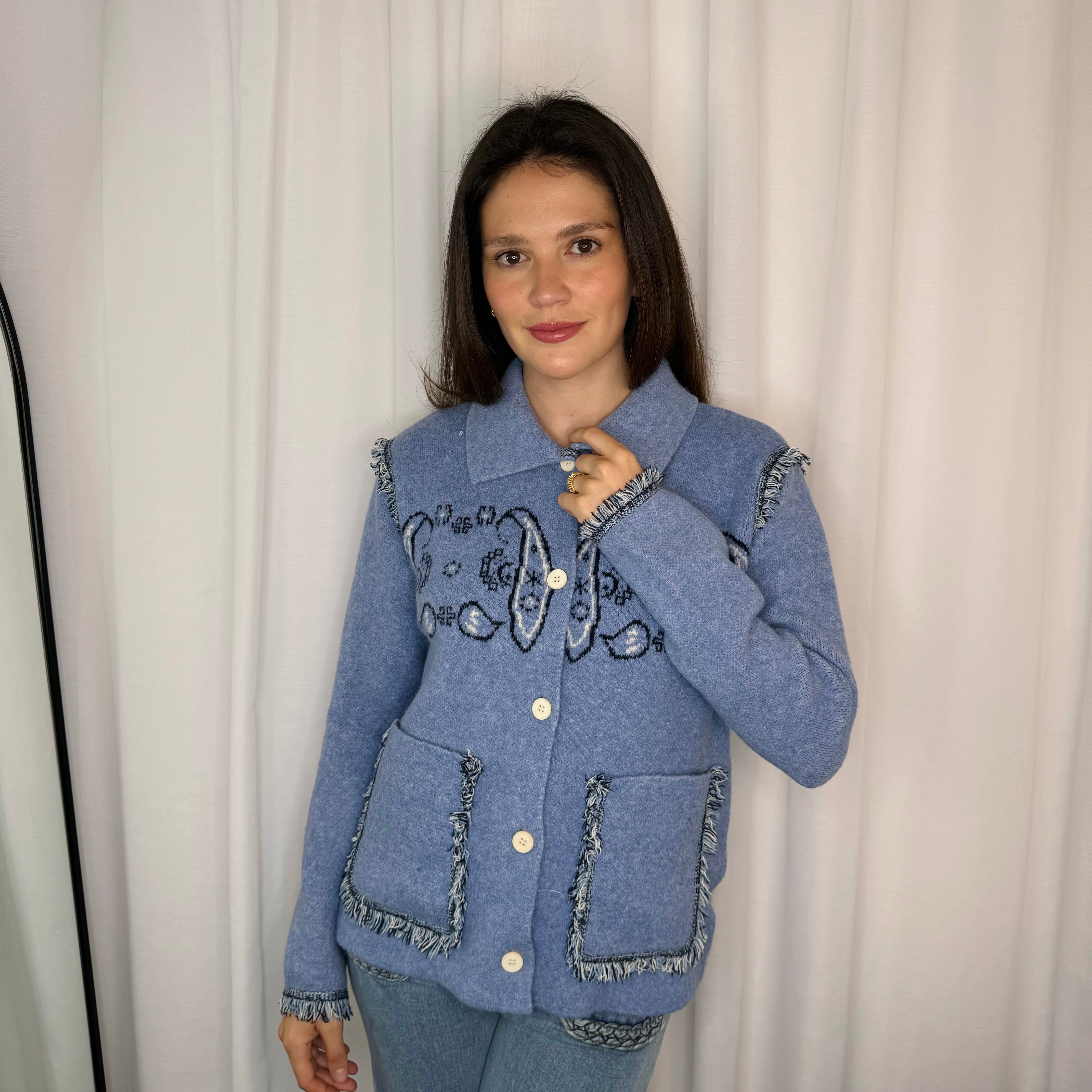 Casaco em malha fundo cor de azul com estampado de bandanas. Acabamentos em franjas. Bolsos de chapa à frente. Golas em aba. Aperta com botões ao centro.