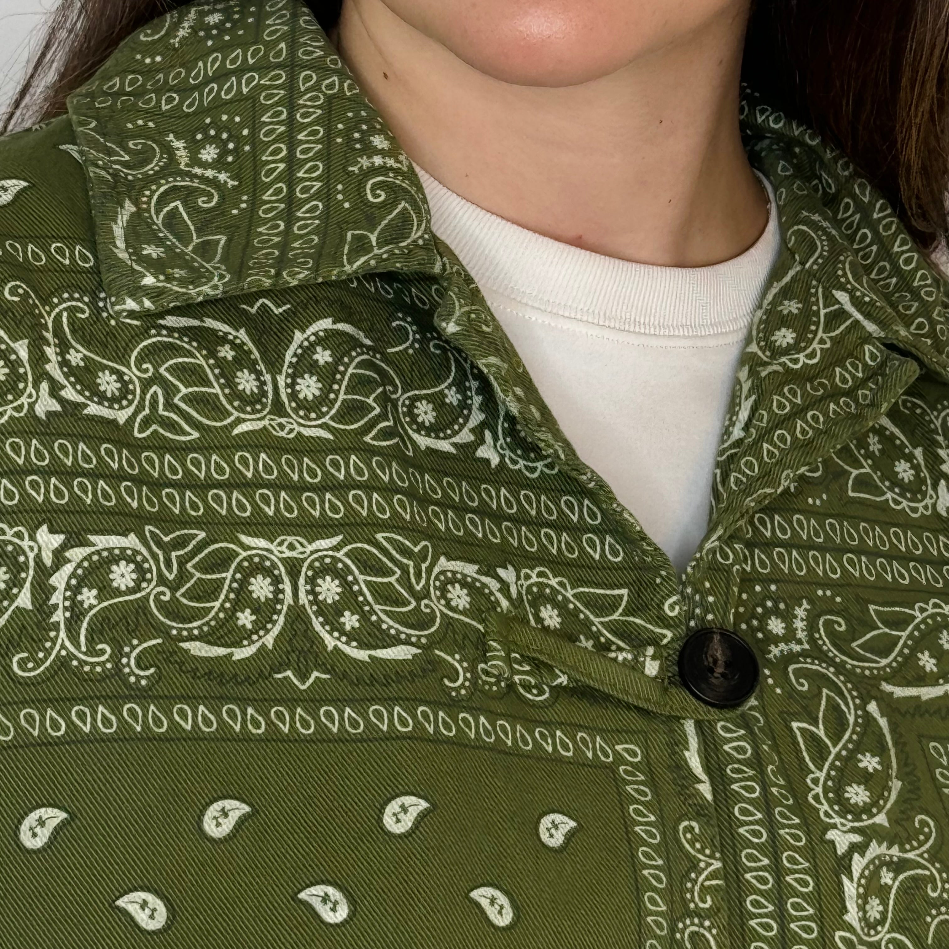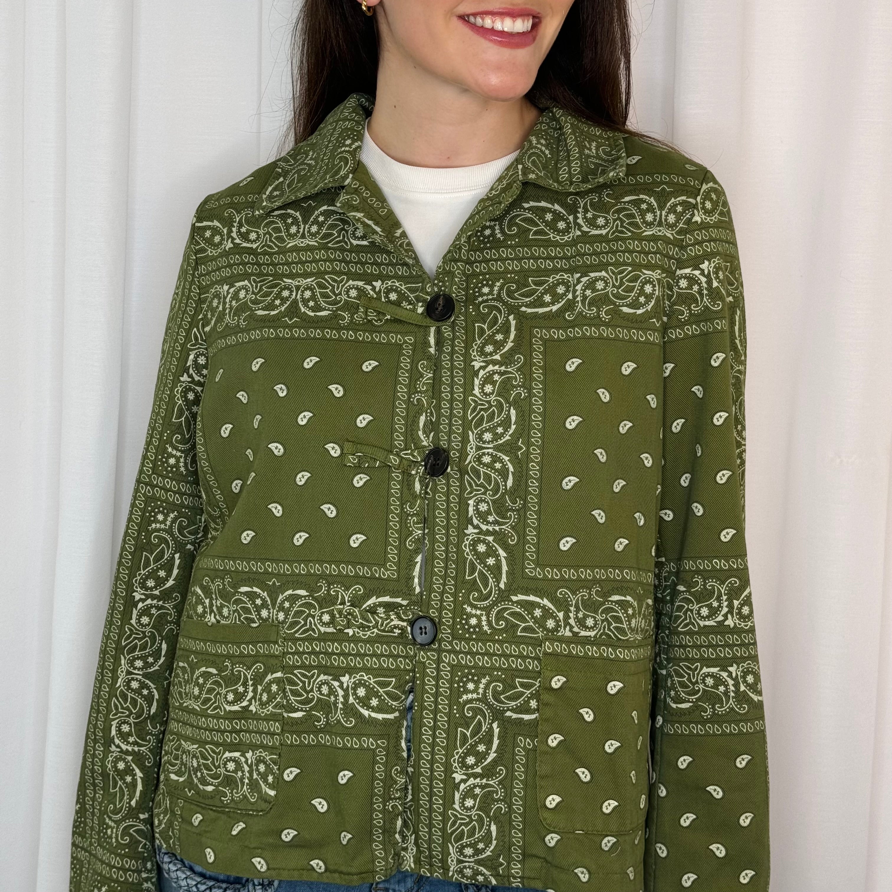 Casaco verde seco com estampado de bandanas. Golas em aba. Aperta com botões ao centro.