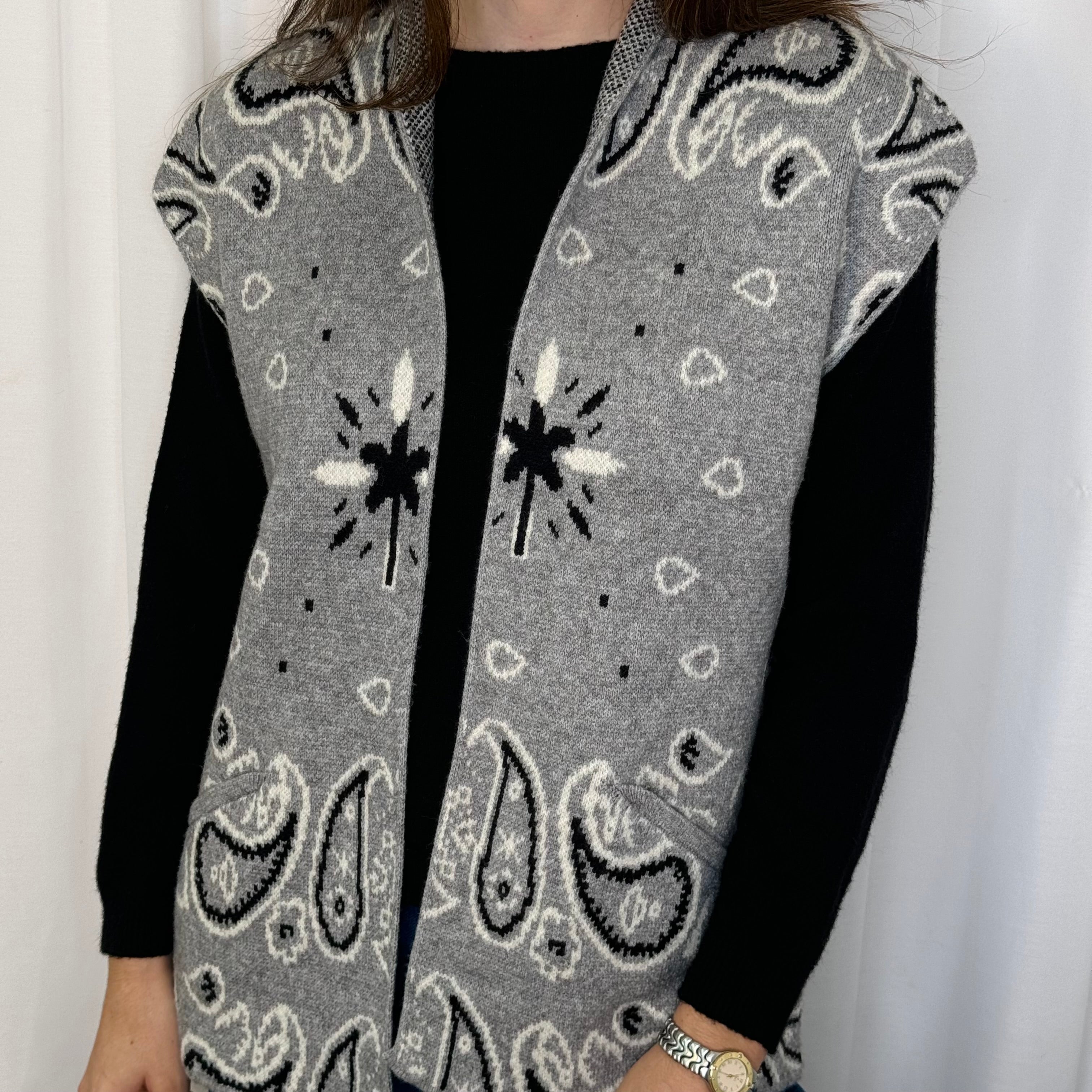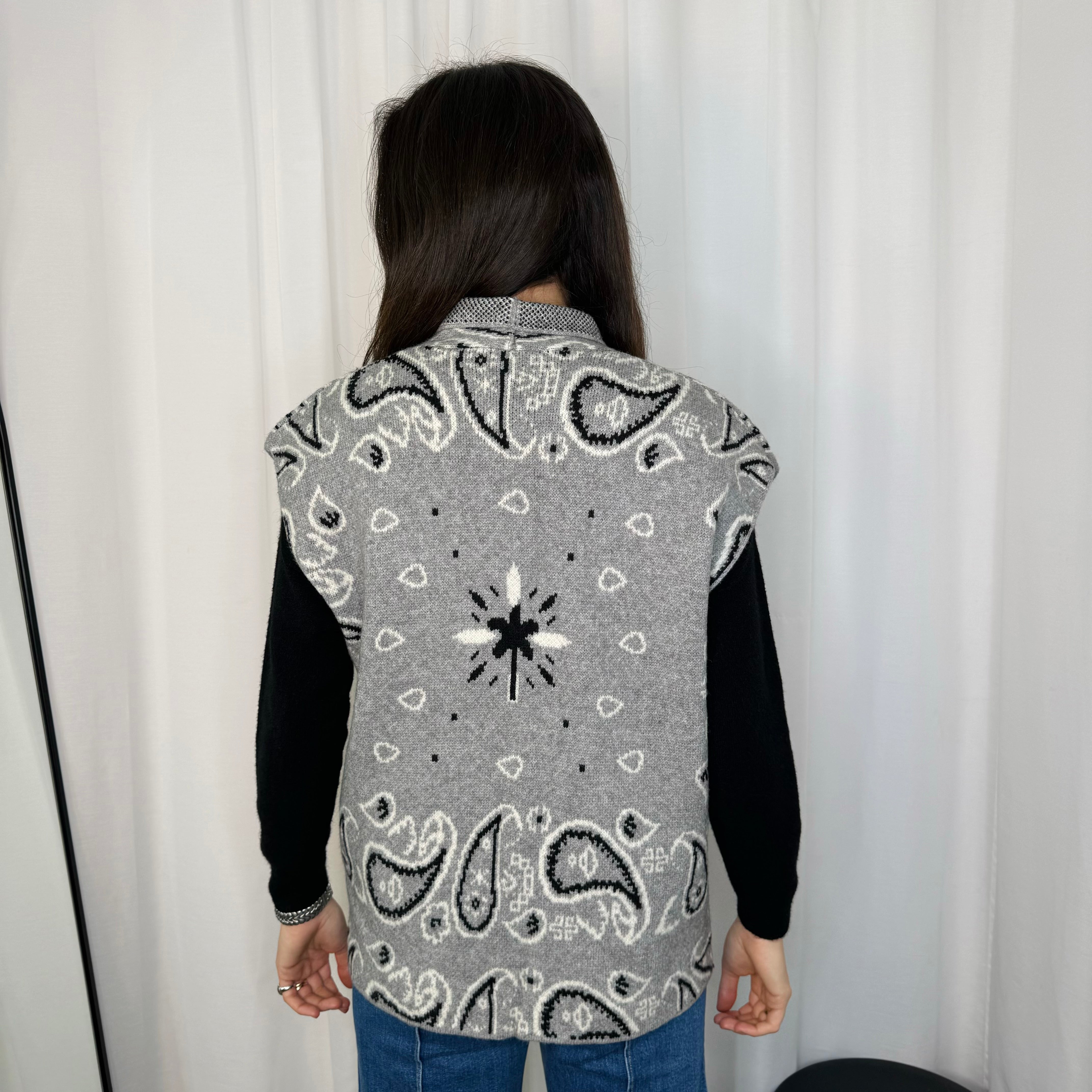 Colete em malha fundo cinza com estampado de bandanas. Bolsos à frente.