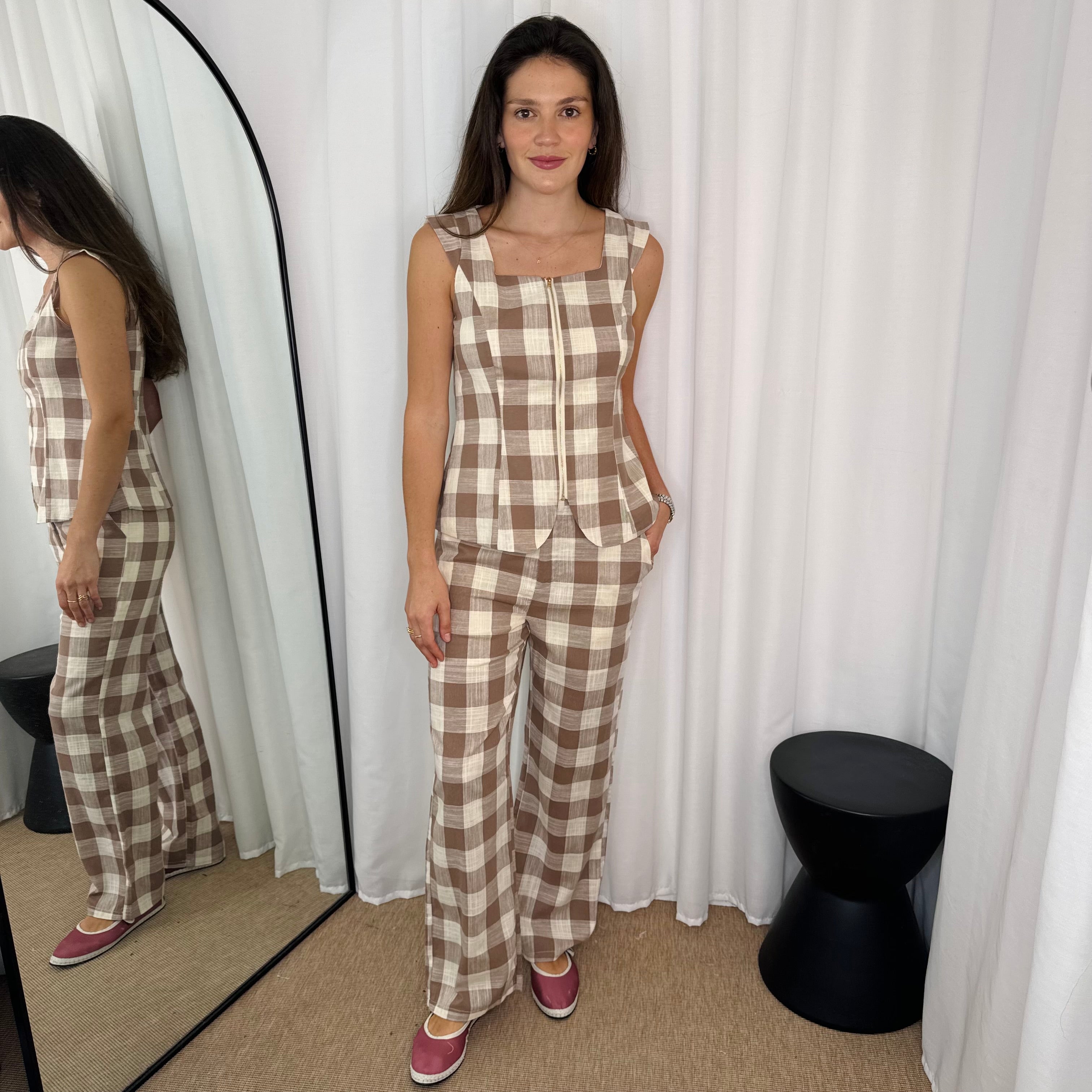 Conjunto top e calças vichy bege e cru.
