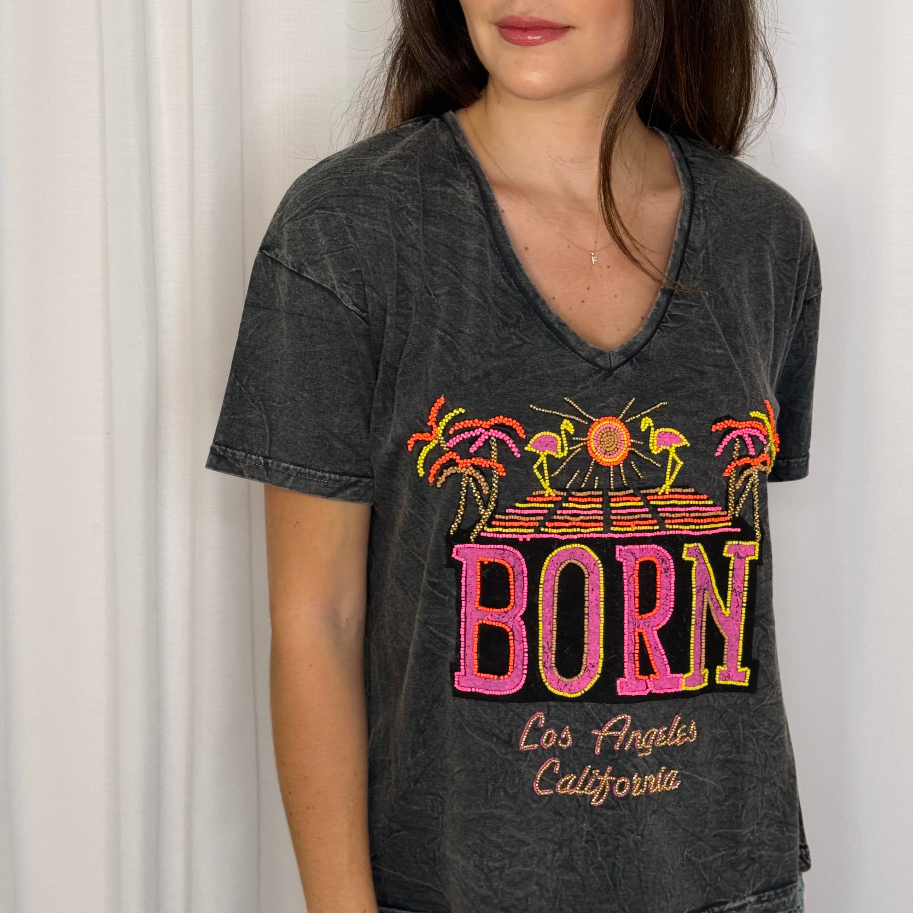 T-shirt fundo cinza com efeito desgastado. Decote bico. Estampado com bordados e missangas em várias tonalidades.