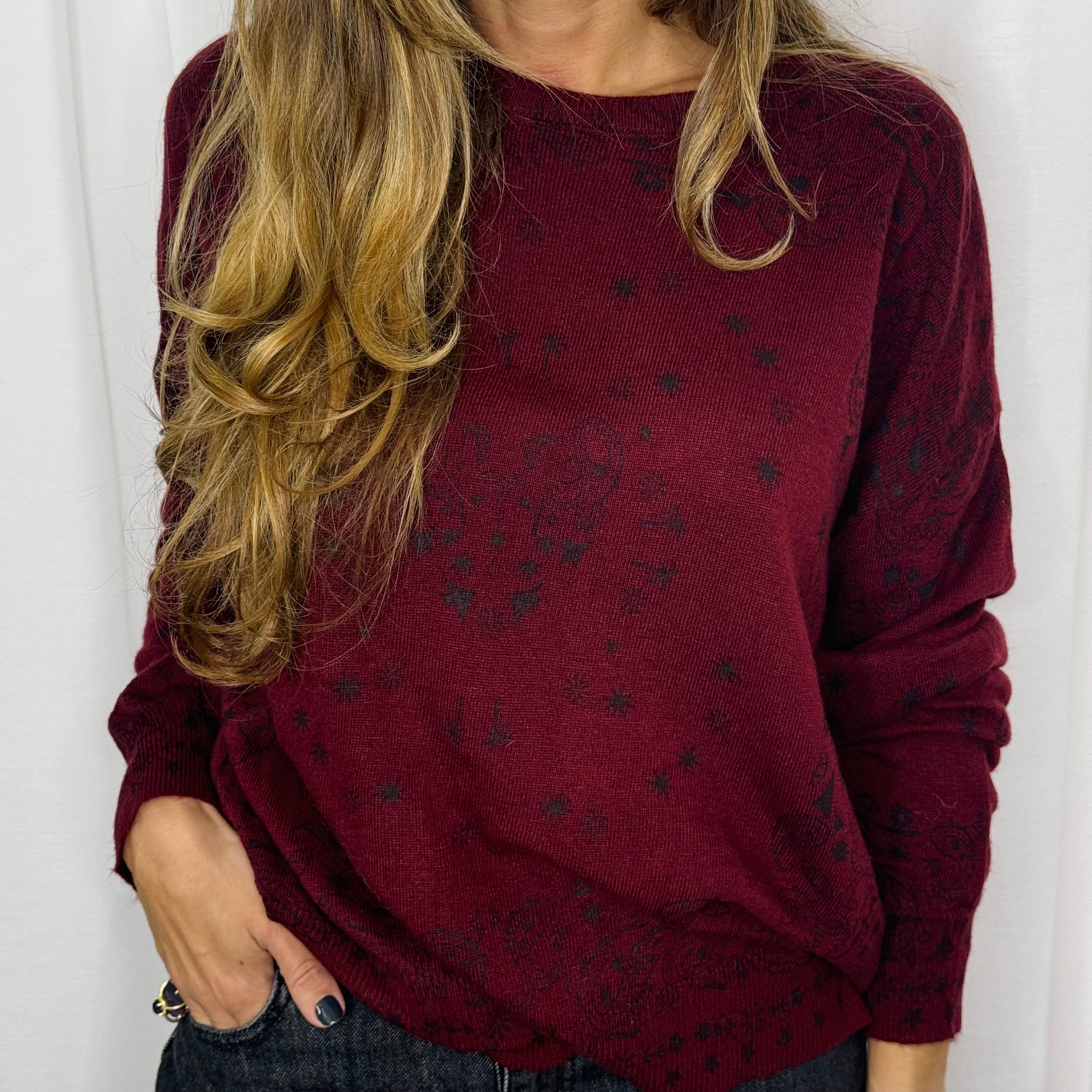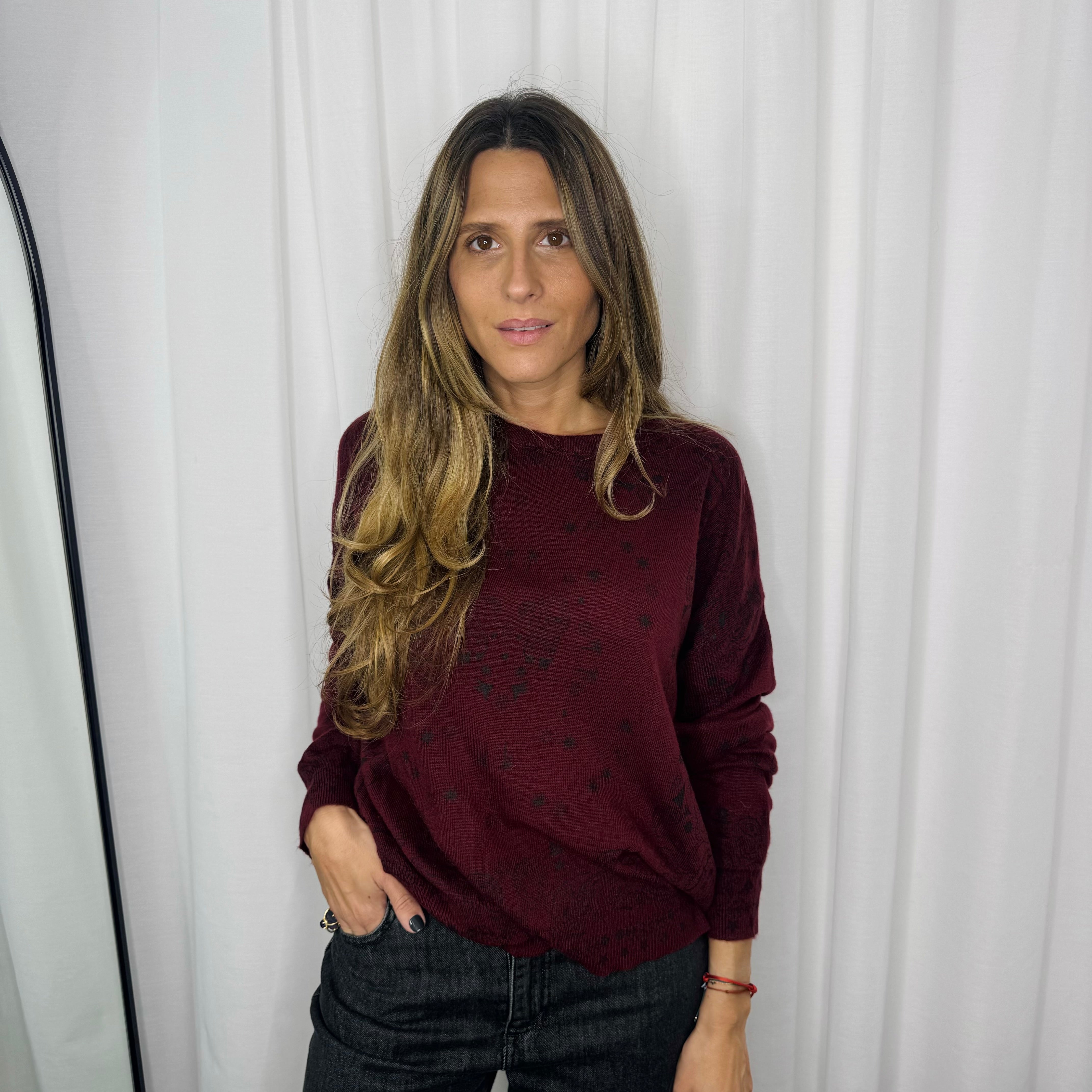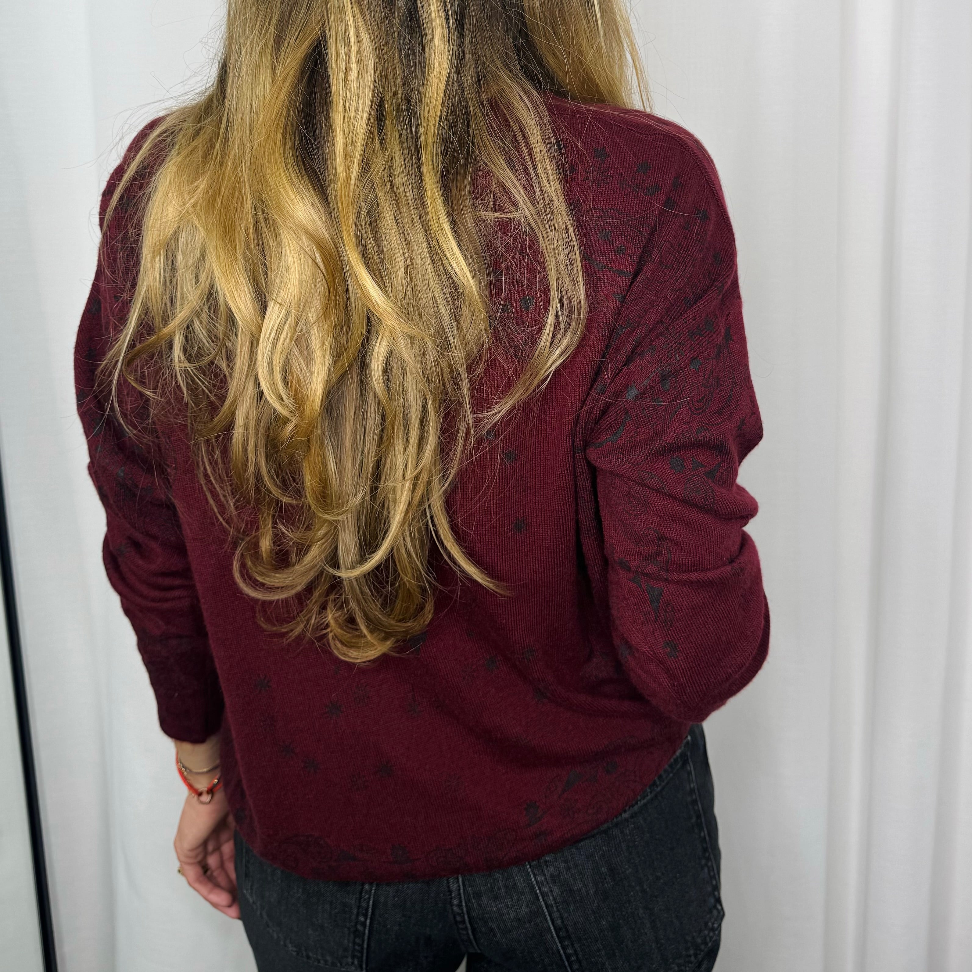 Camisola decote redondo malha. Fundo bordeaux com padrão de bandana.