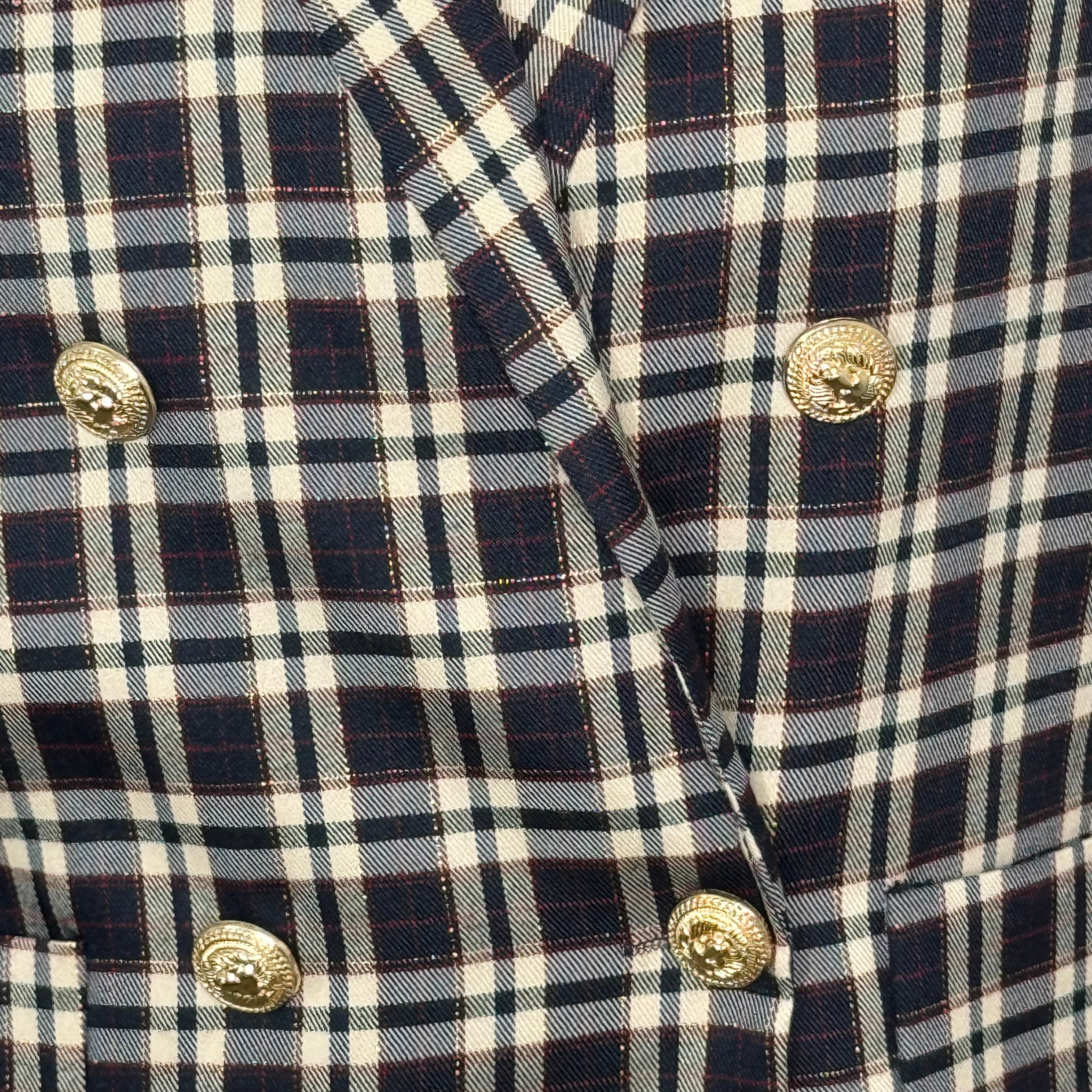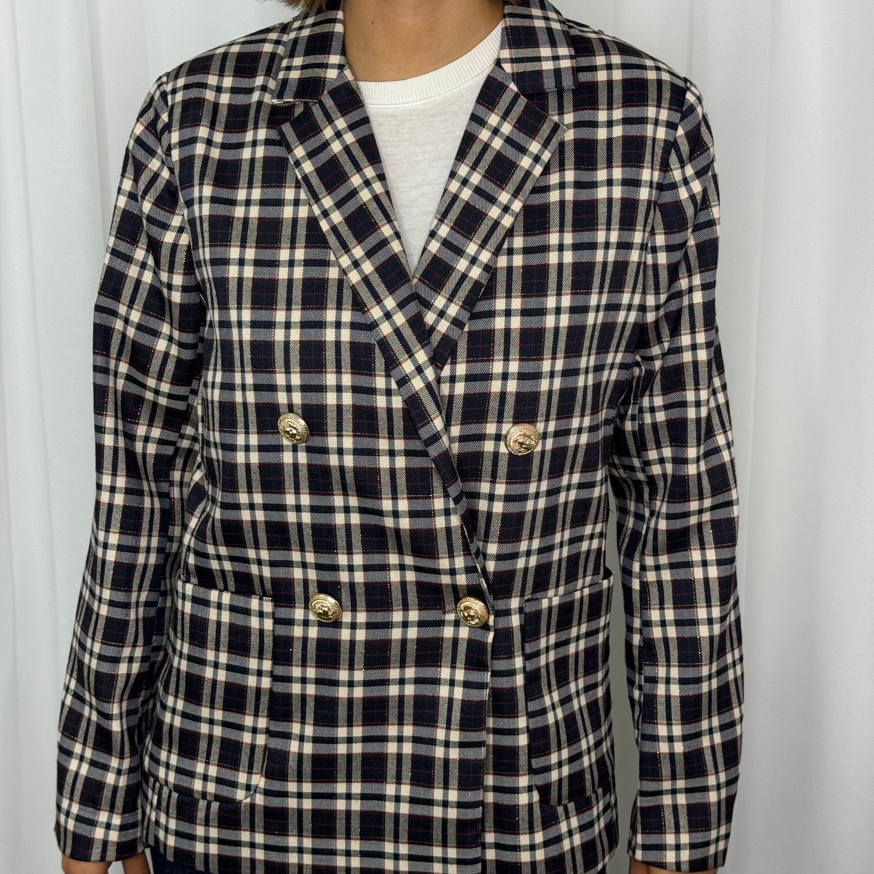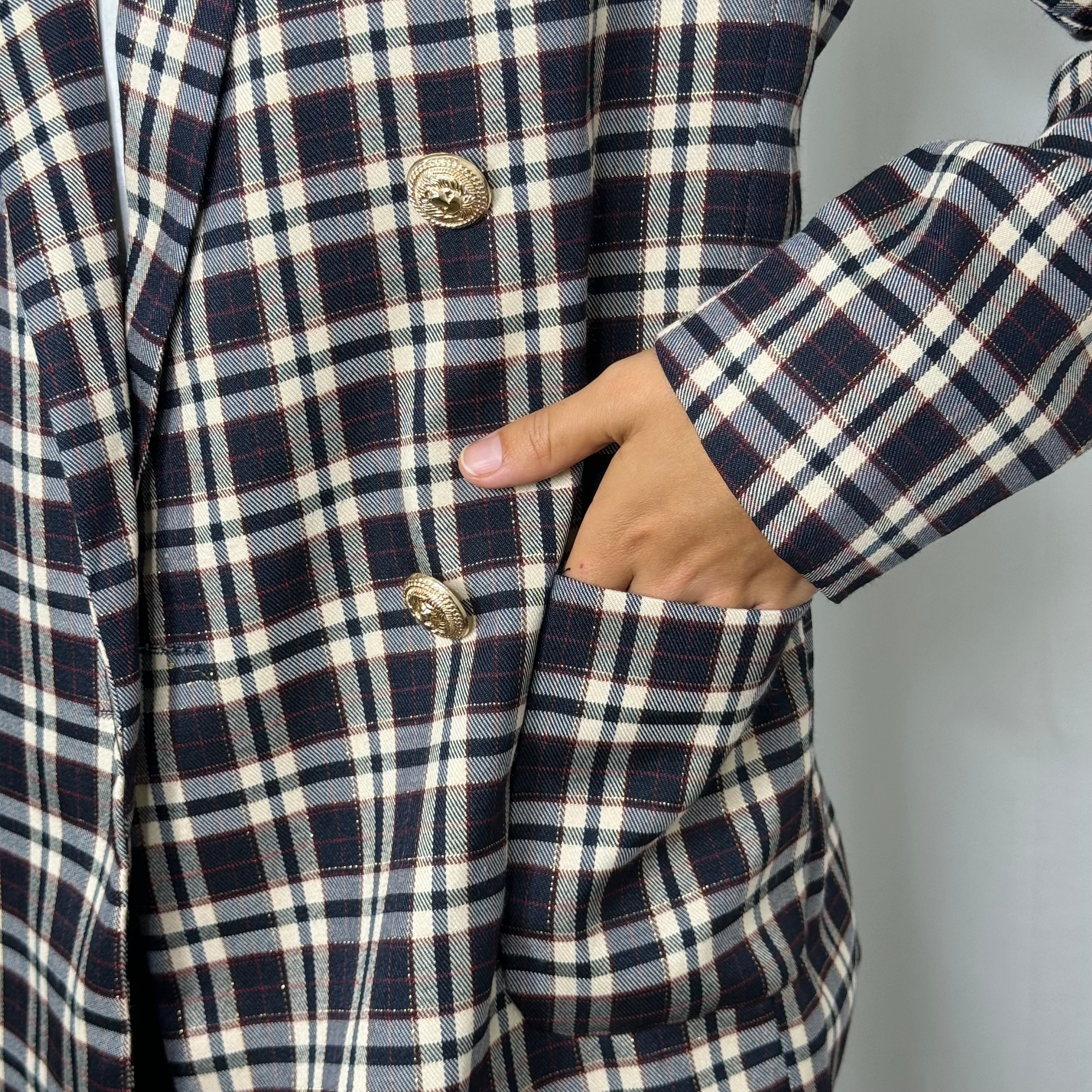 Blazer oversized gola em aba. Botões dourados trabalhados. Estampado xadrez em azul marinho, bordeaux, branco e linha dourada com brilhos. .