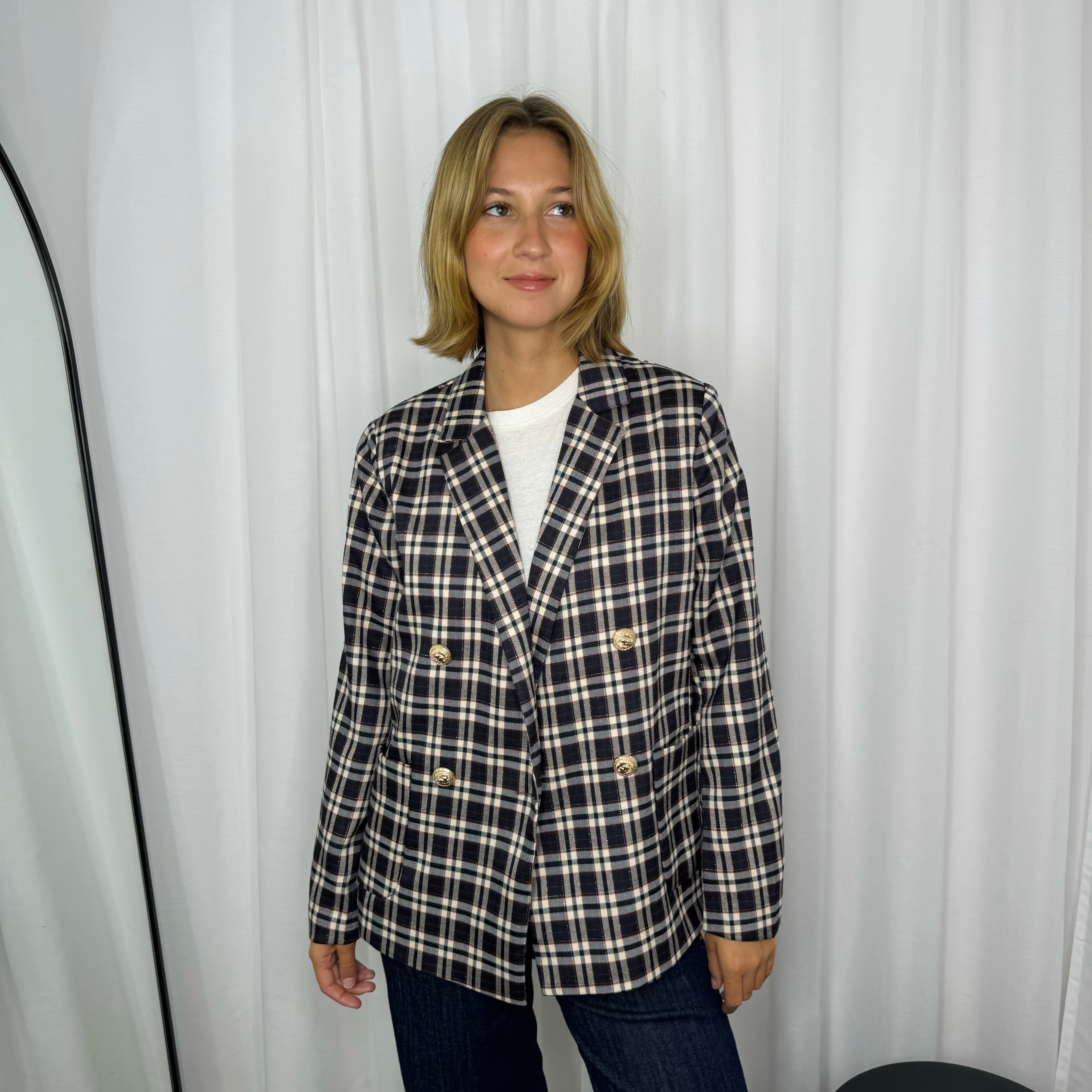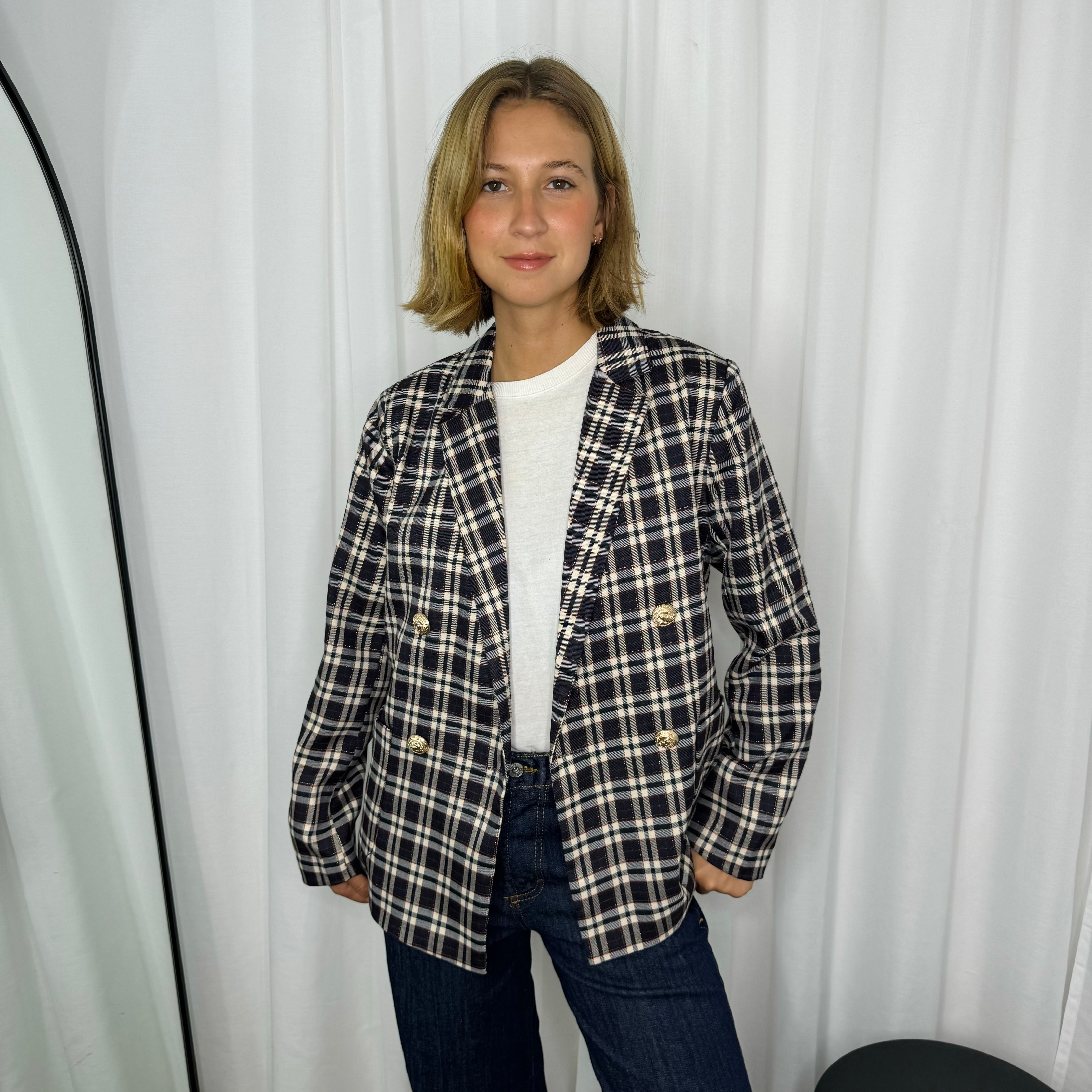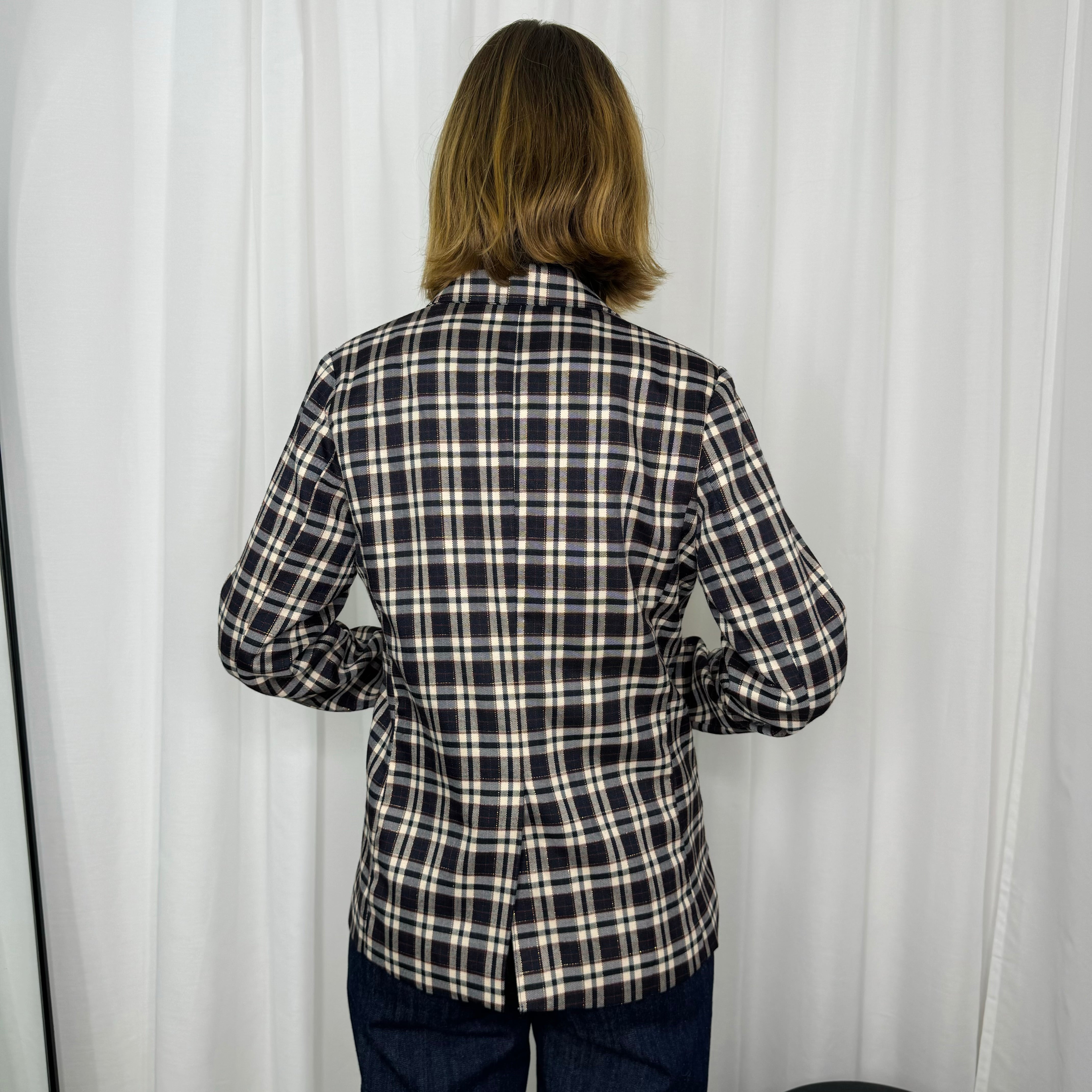 Blazer oversized gola em aba. Botões dourados trabalhados. Estampado xadrez em azul marinho, bordeaux, branco e linha dourada com brilhos. .