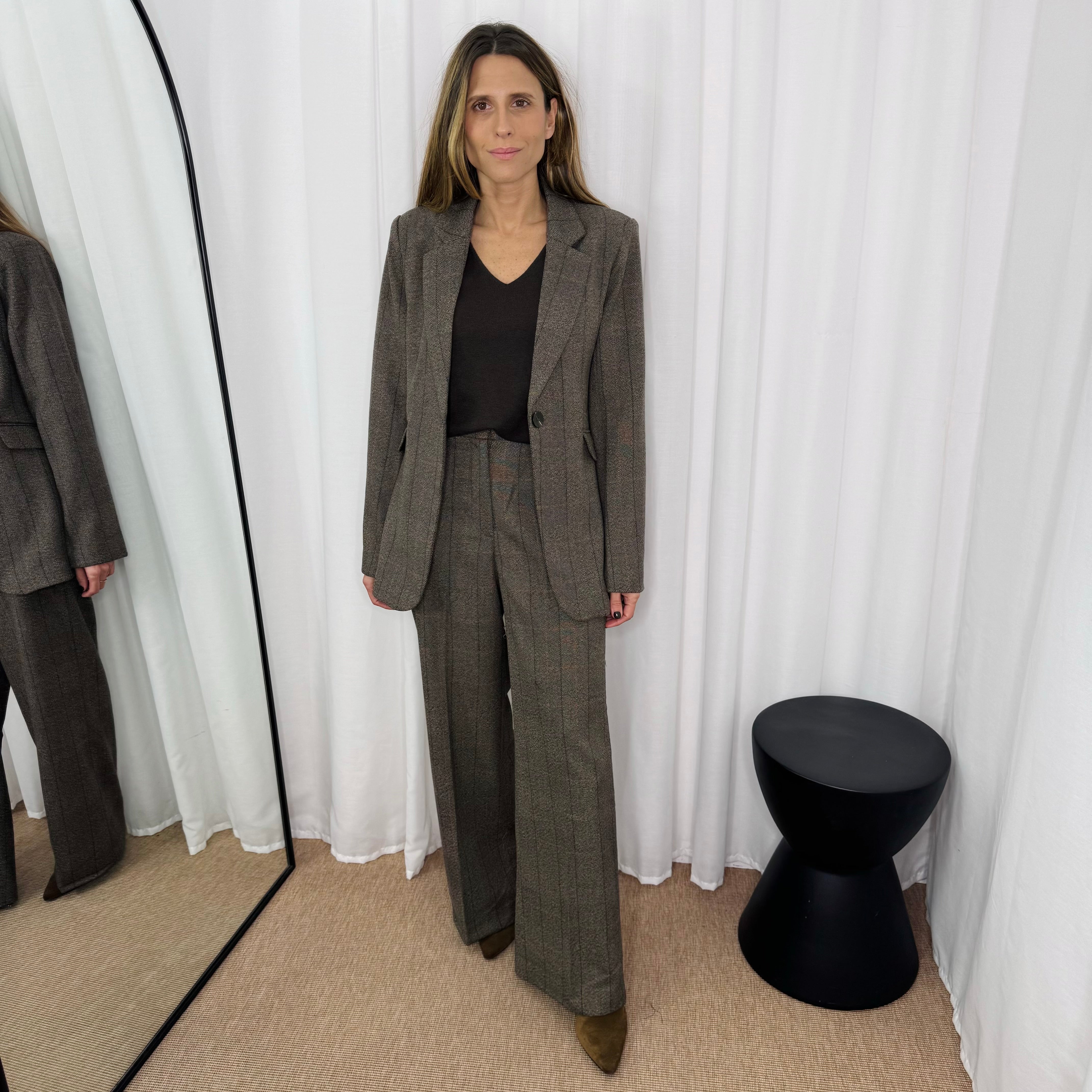 Blazer escocês castanho. Modelo estruturado. Bolsos de chapa à frente. Aperta com botão ao centro.