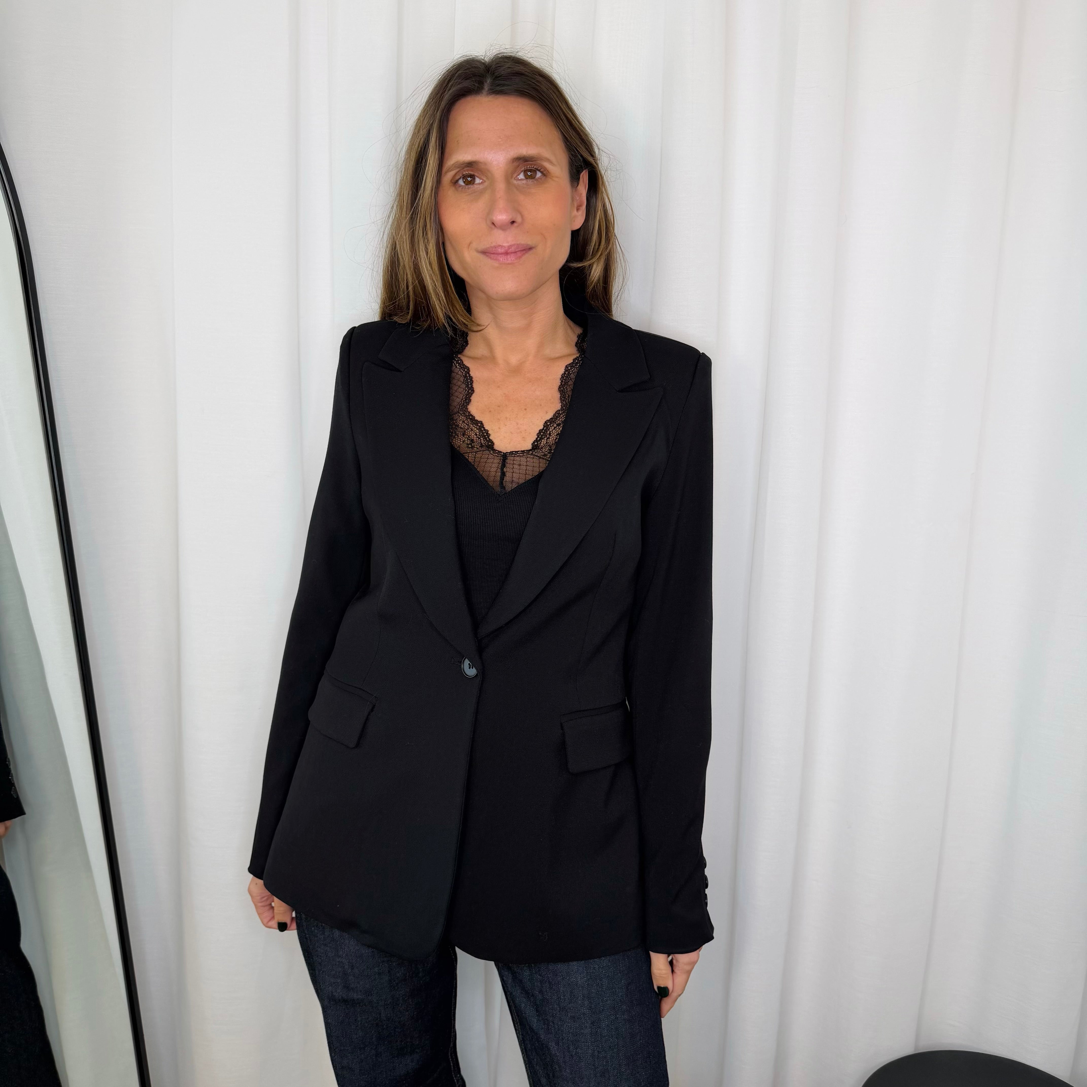 Blazer encorpado preto com ombreiras. Bolsos de chapa à frente. Botões nos punhos. Aperta com botão ao centro.