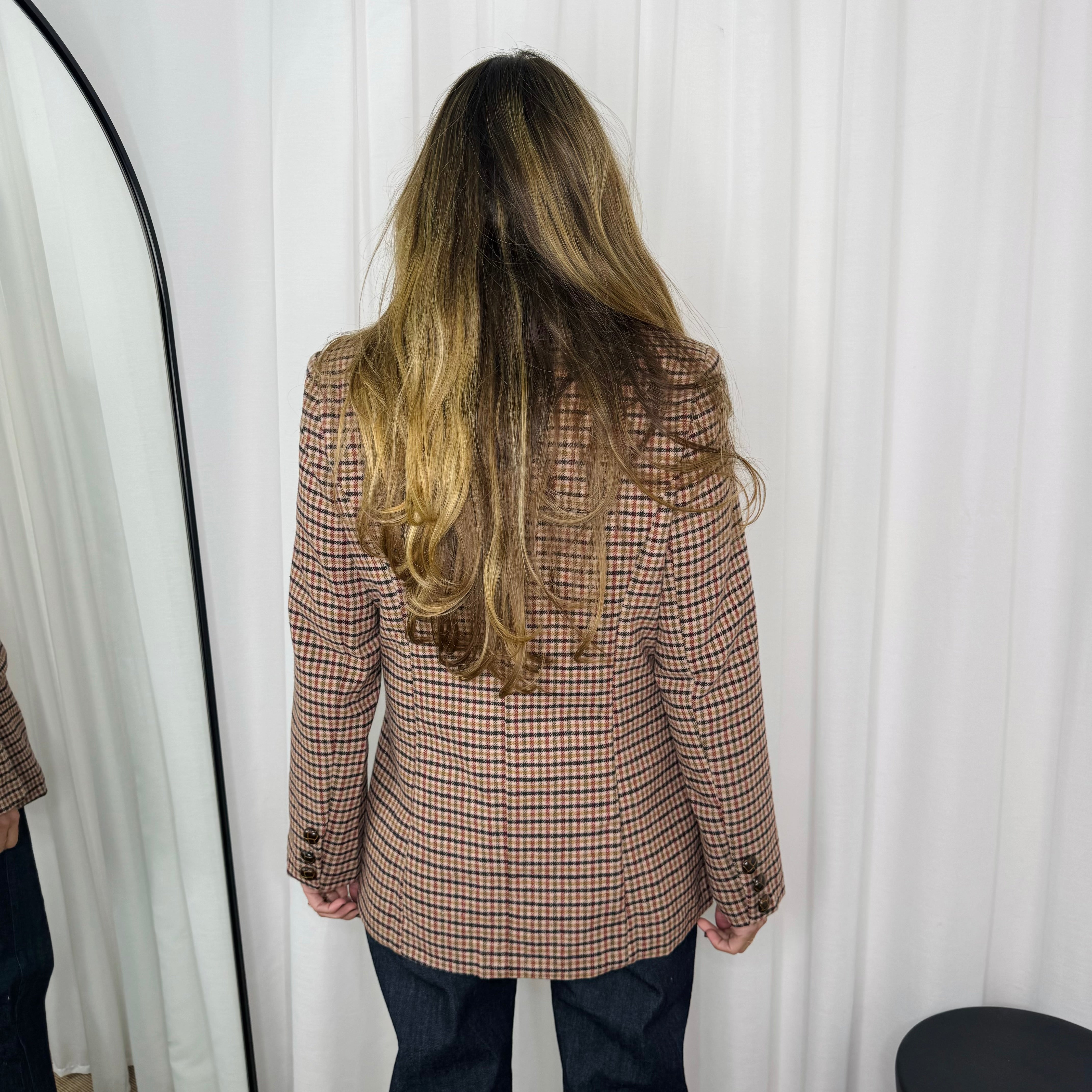 Blazer estruturado em fazenda com várias tonalidades de bordeaux, camel e castanho. Aperta com botões pormenorizados em madeira. Bolsos de chapa à frente.