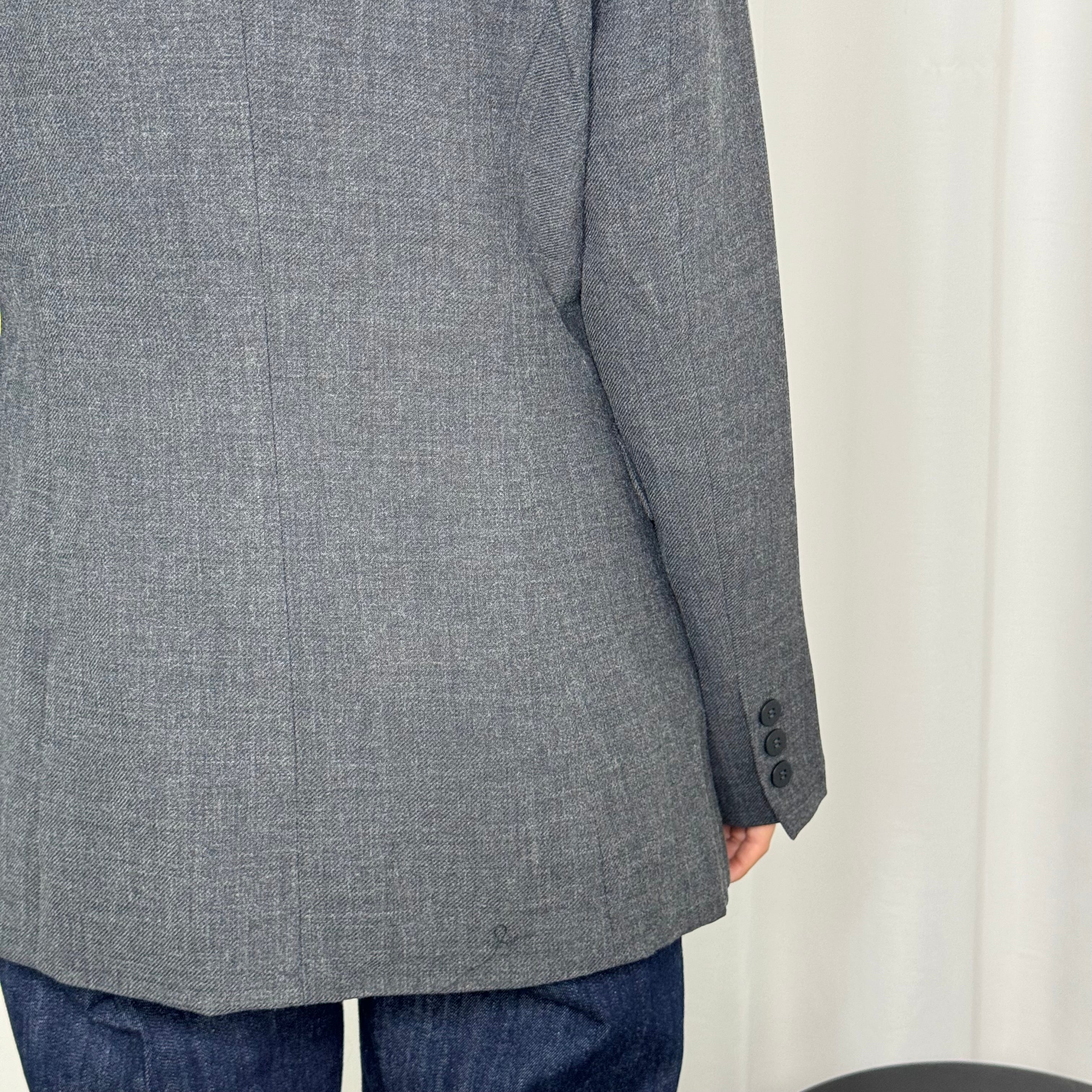 Blazer em fazenda cinzento. Aperta com botão. Bolsos de chapa à frente.
