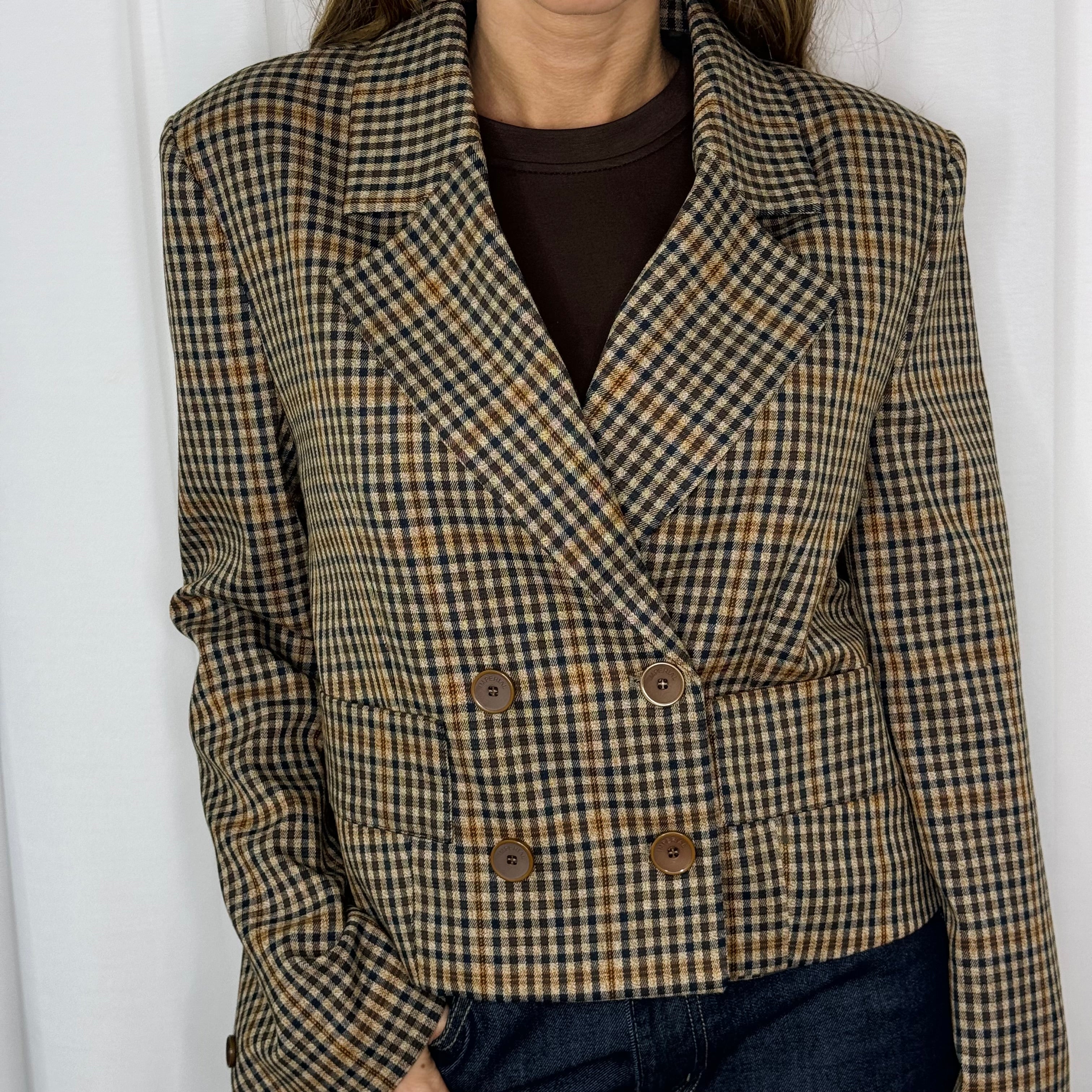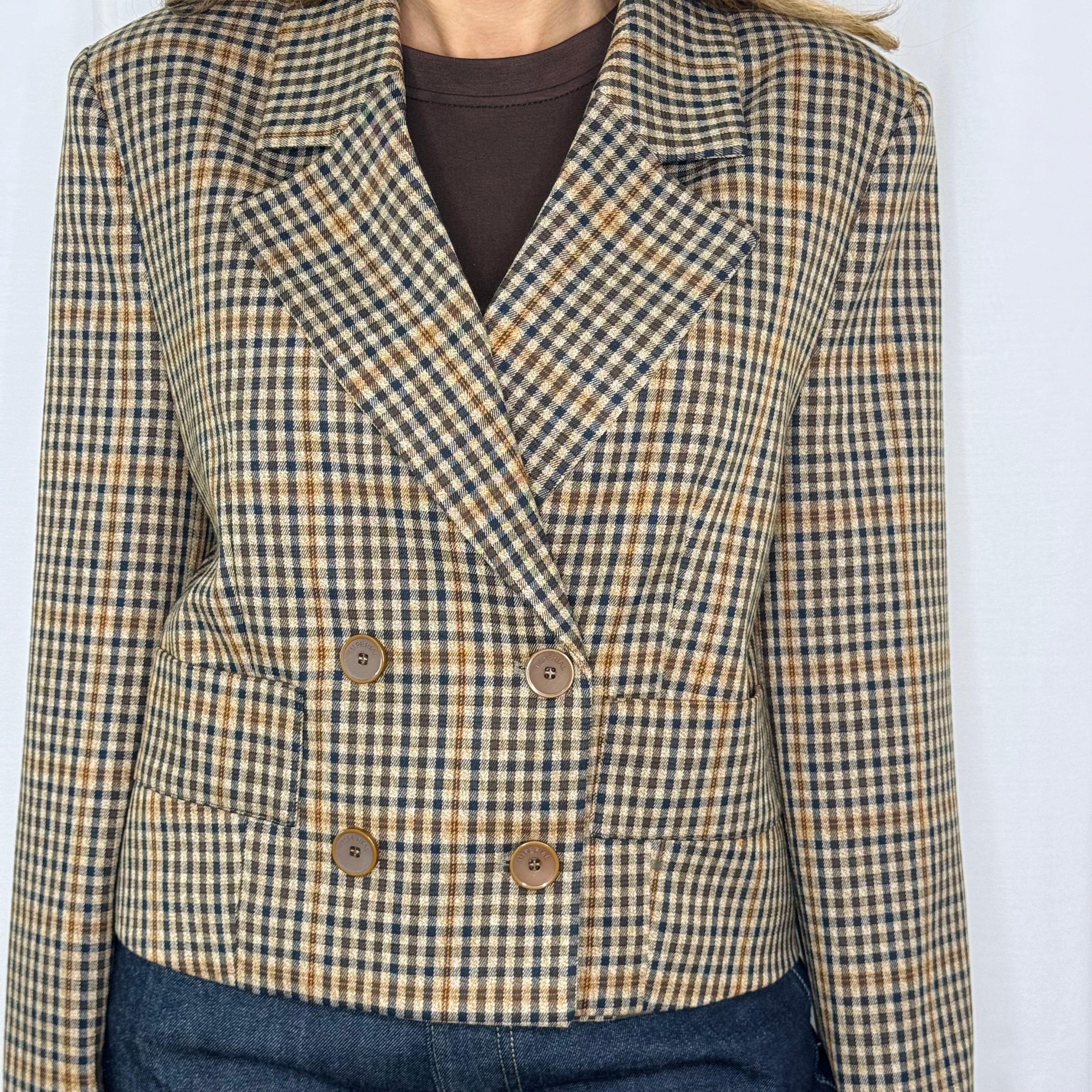 Blazer curto de trespasse. Aperta com botões. Pied poule em várias tonalidades neutras.