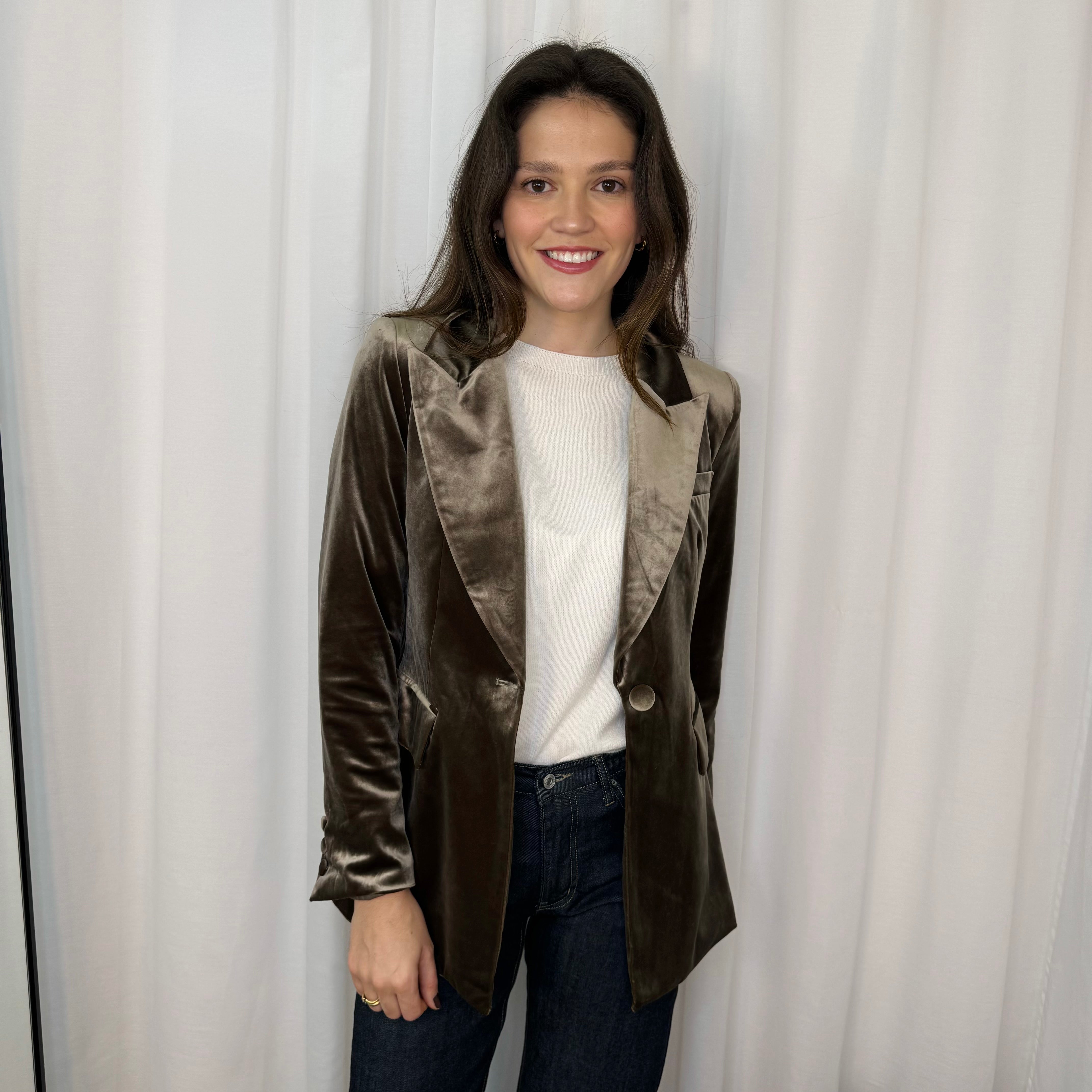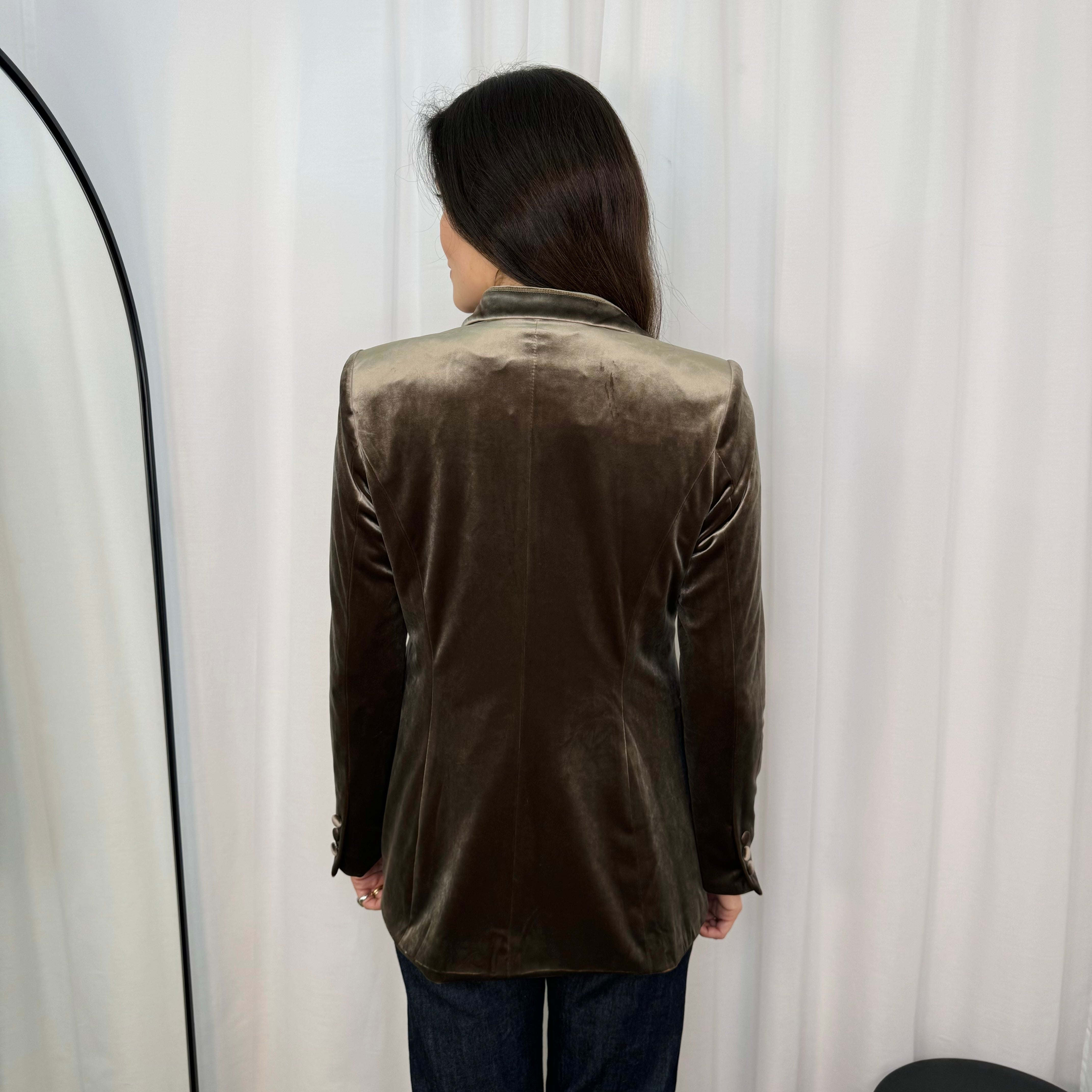 Blazer estruturado em veludo taupe. Botões borrados no mesmo tecido. Aperta com botão.