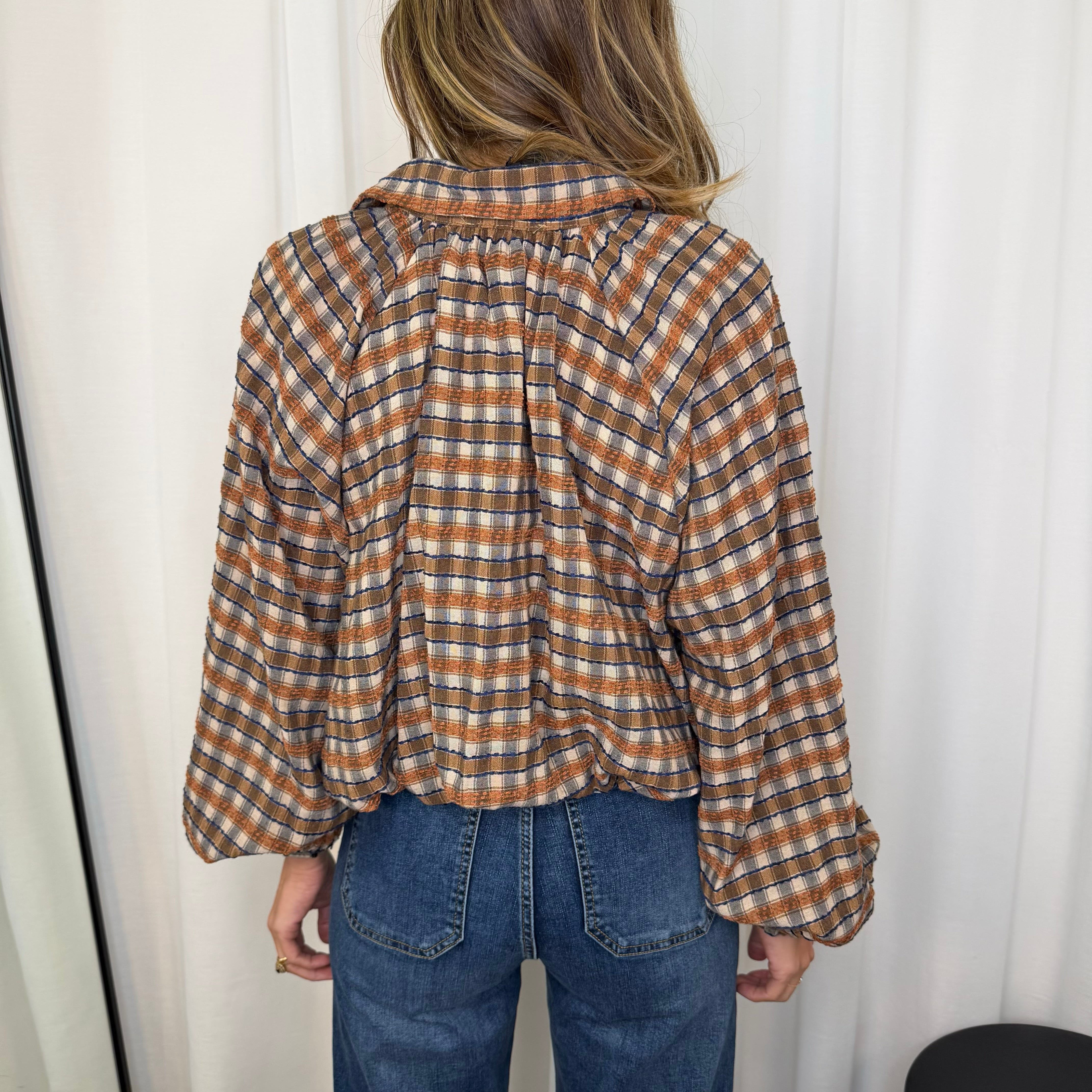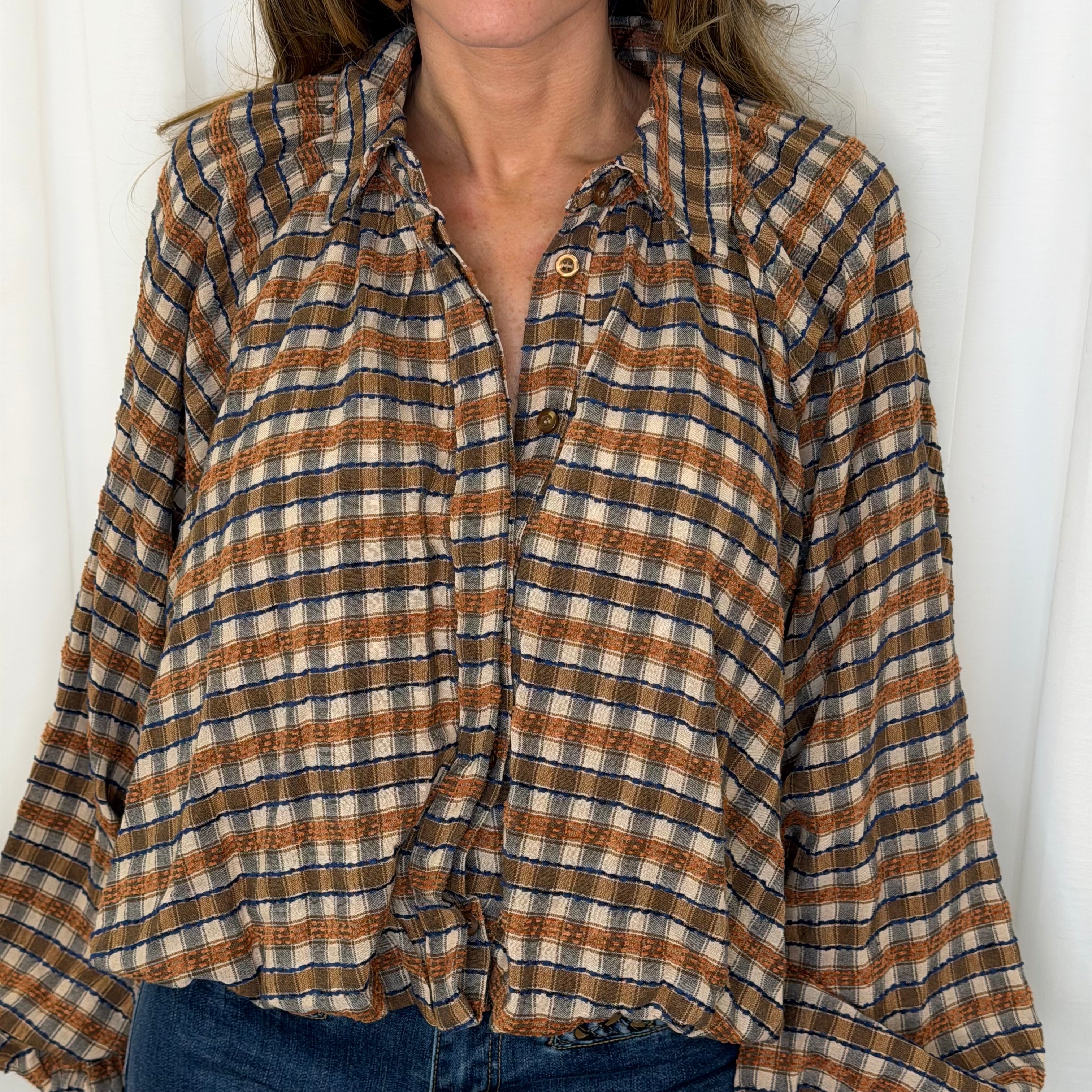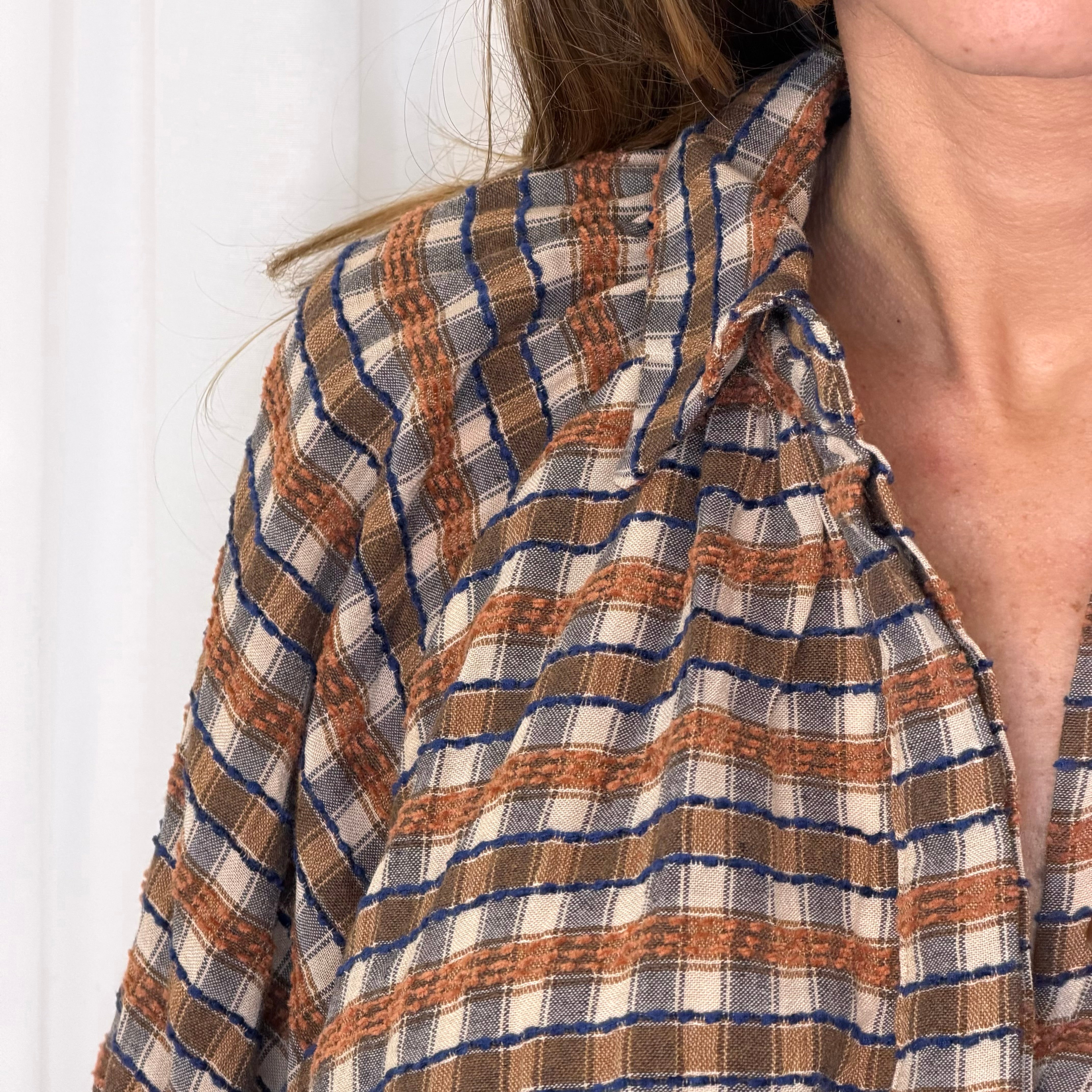 Túnica abalonada. Golas em aba. Aperta com botões ao centro.