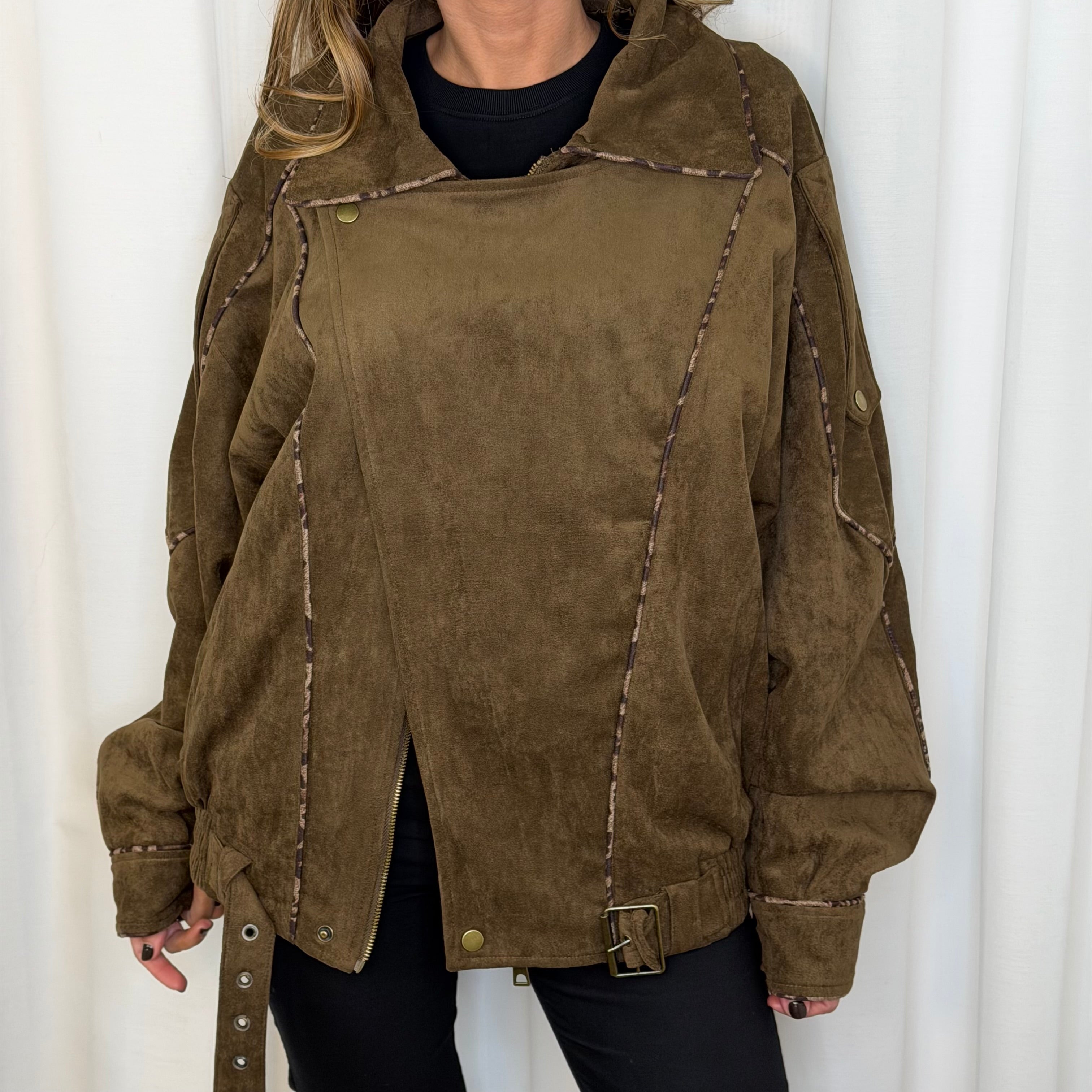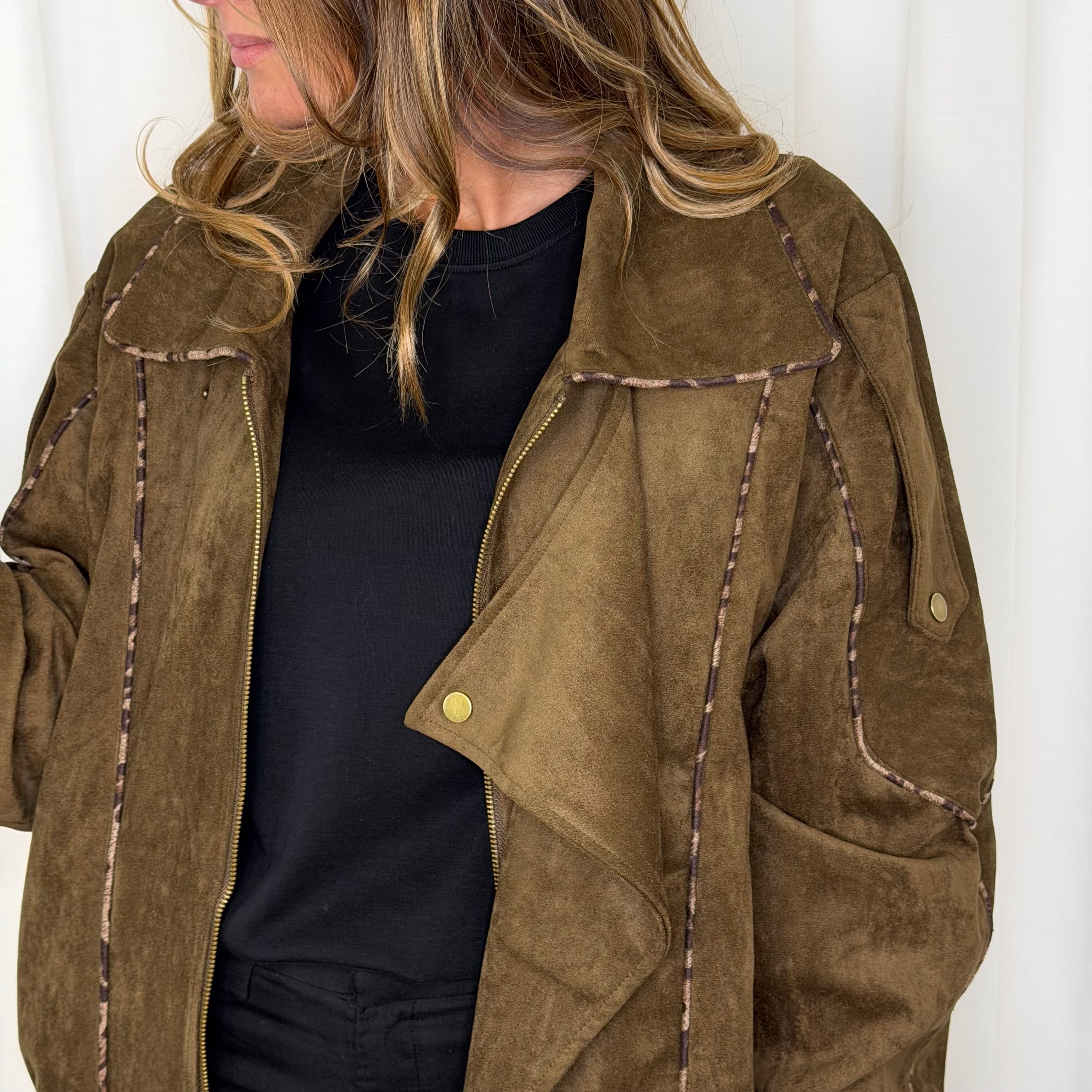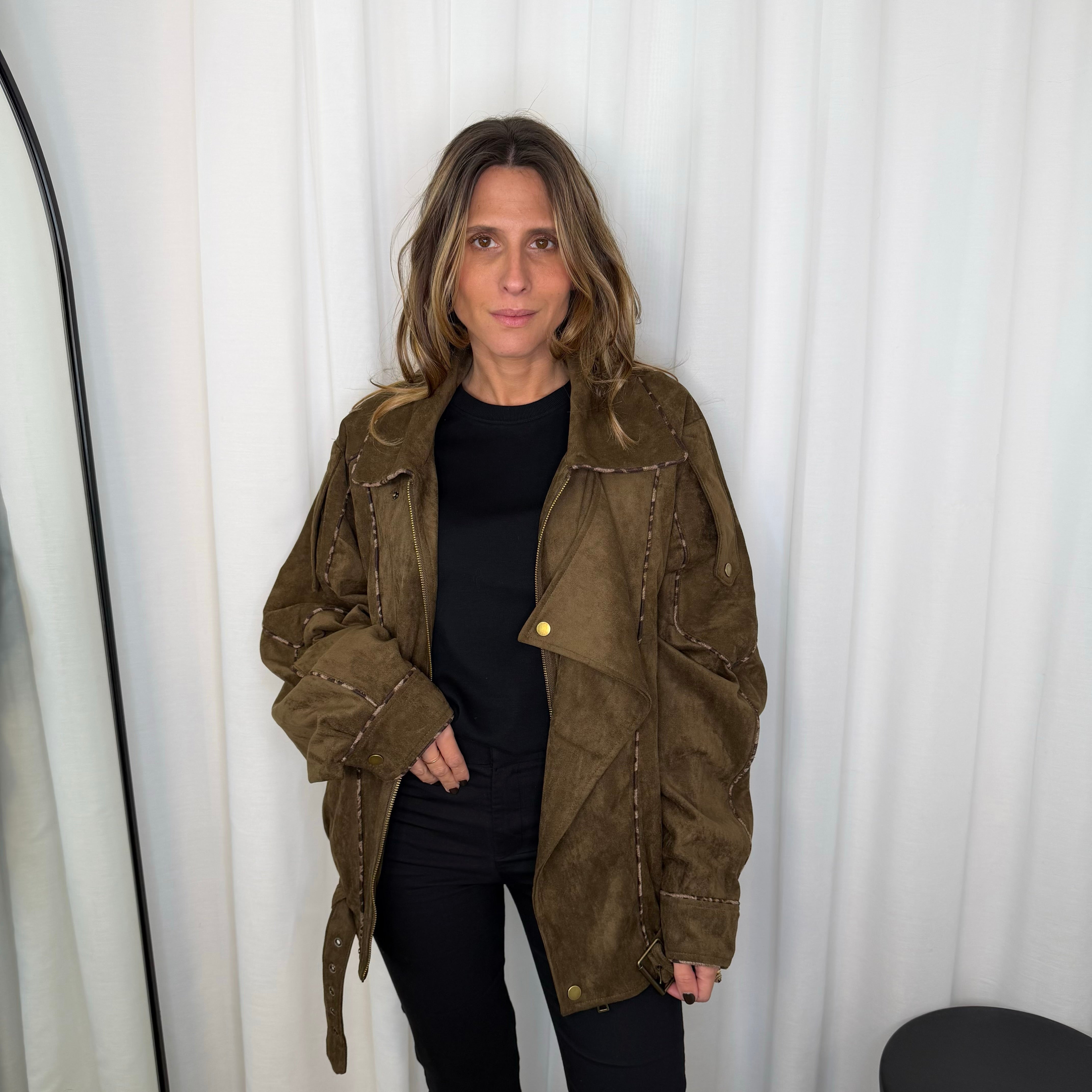 Blusão modelo oversized em camurça pele de pêssego. Aperta com fecho zipper. Golas em aba. Costuras com debrum em animal print.