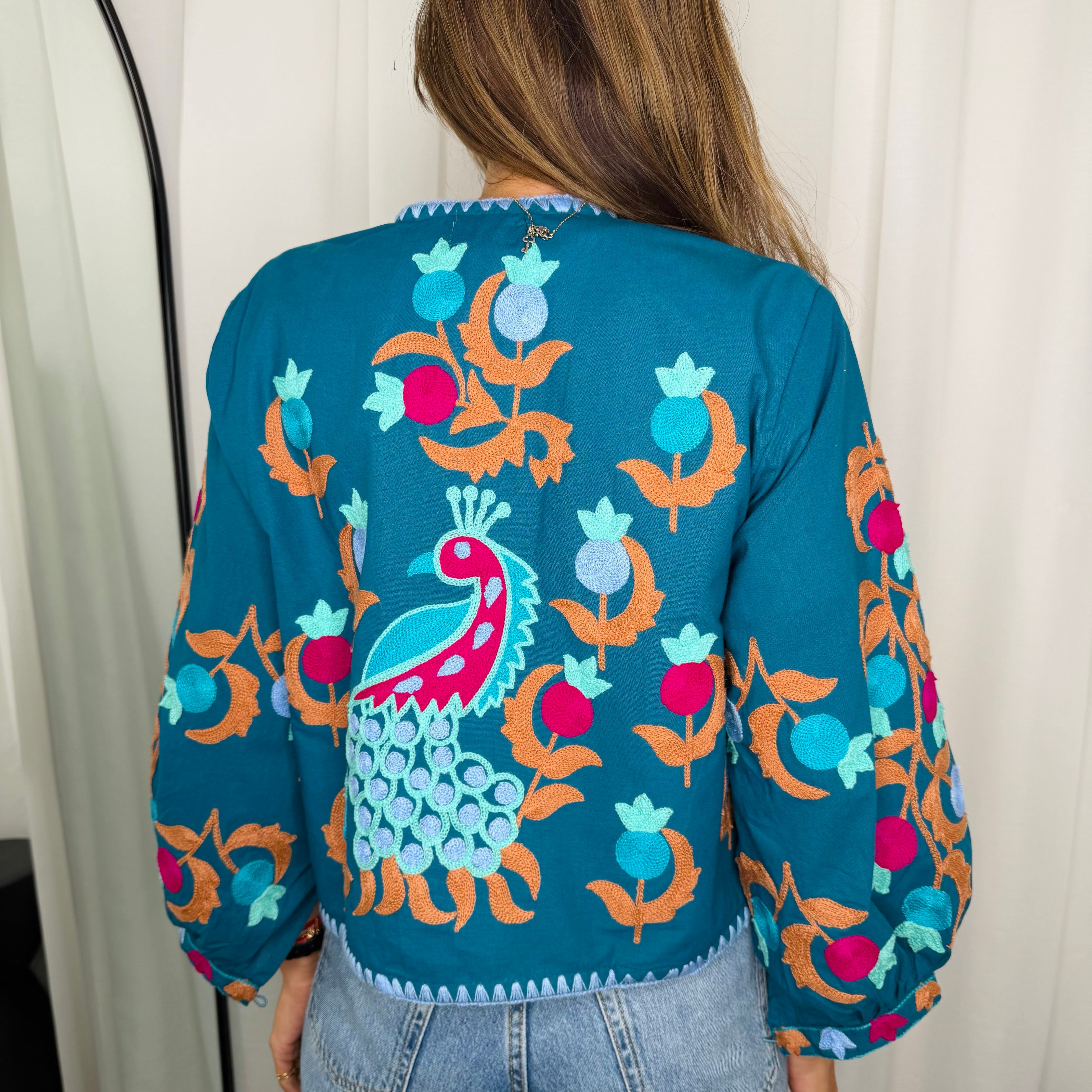 Bolero azul com bordados multicolor.