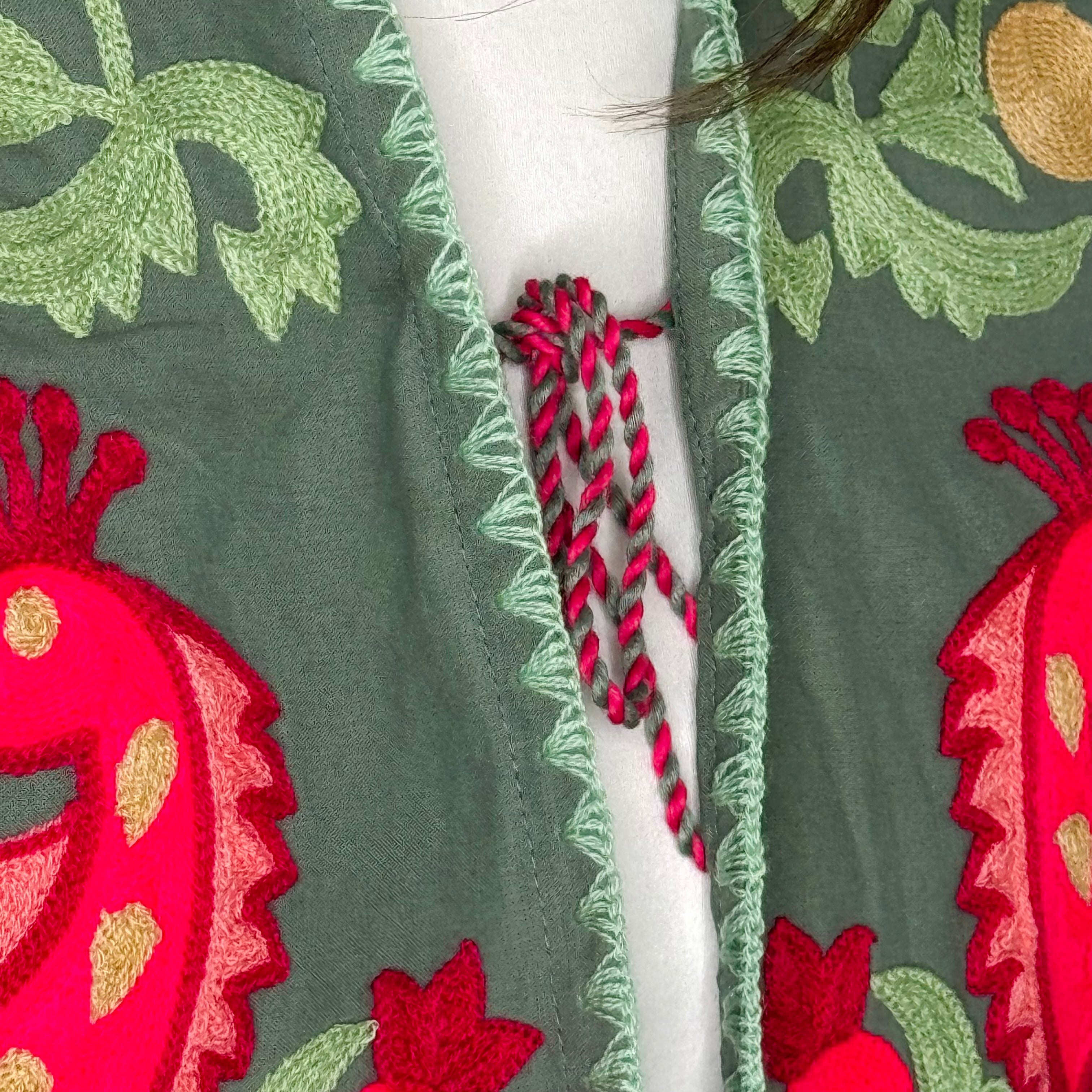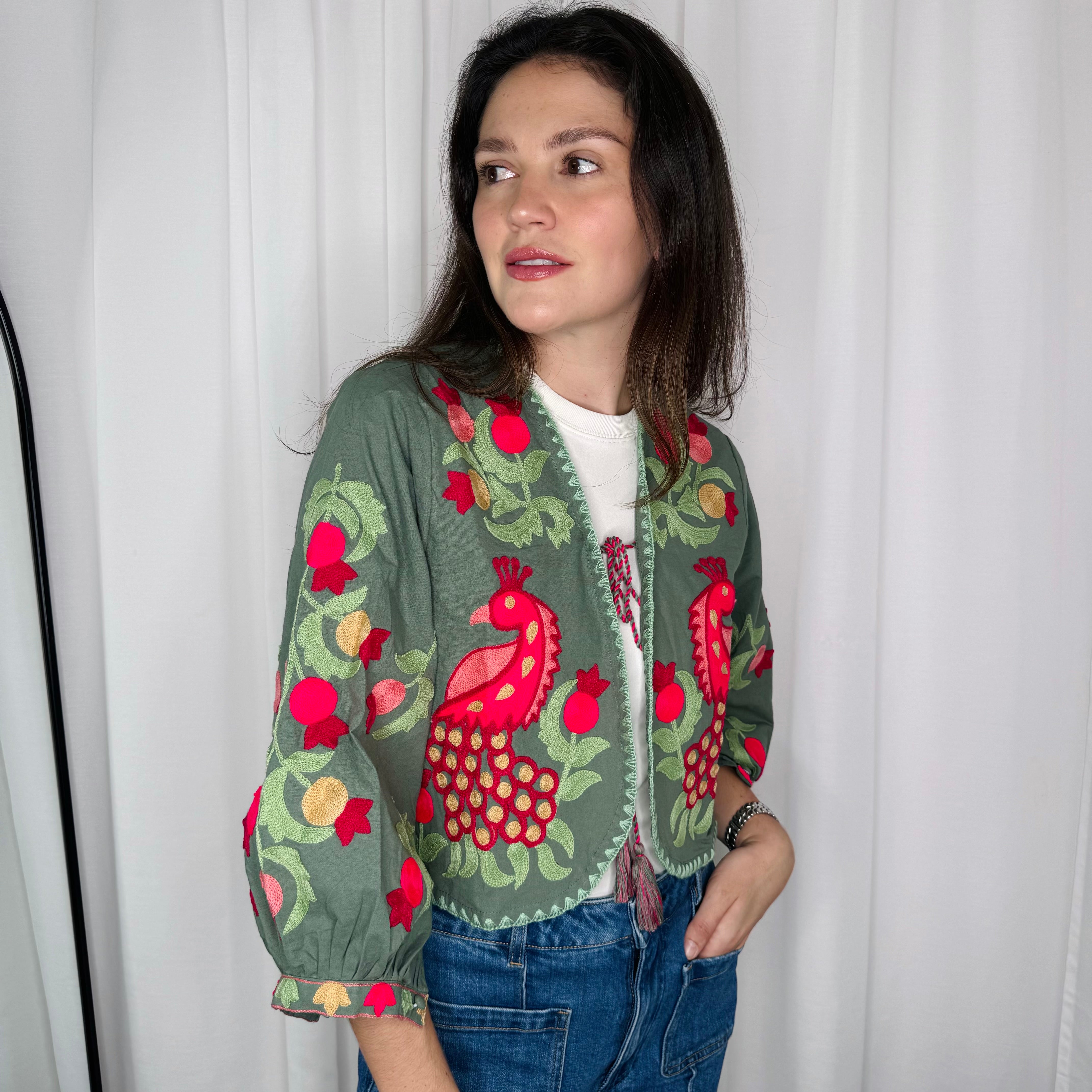 Bolero verde com bordados multicolor.
