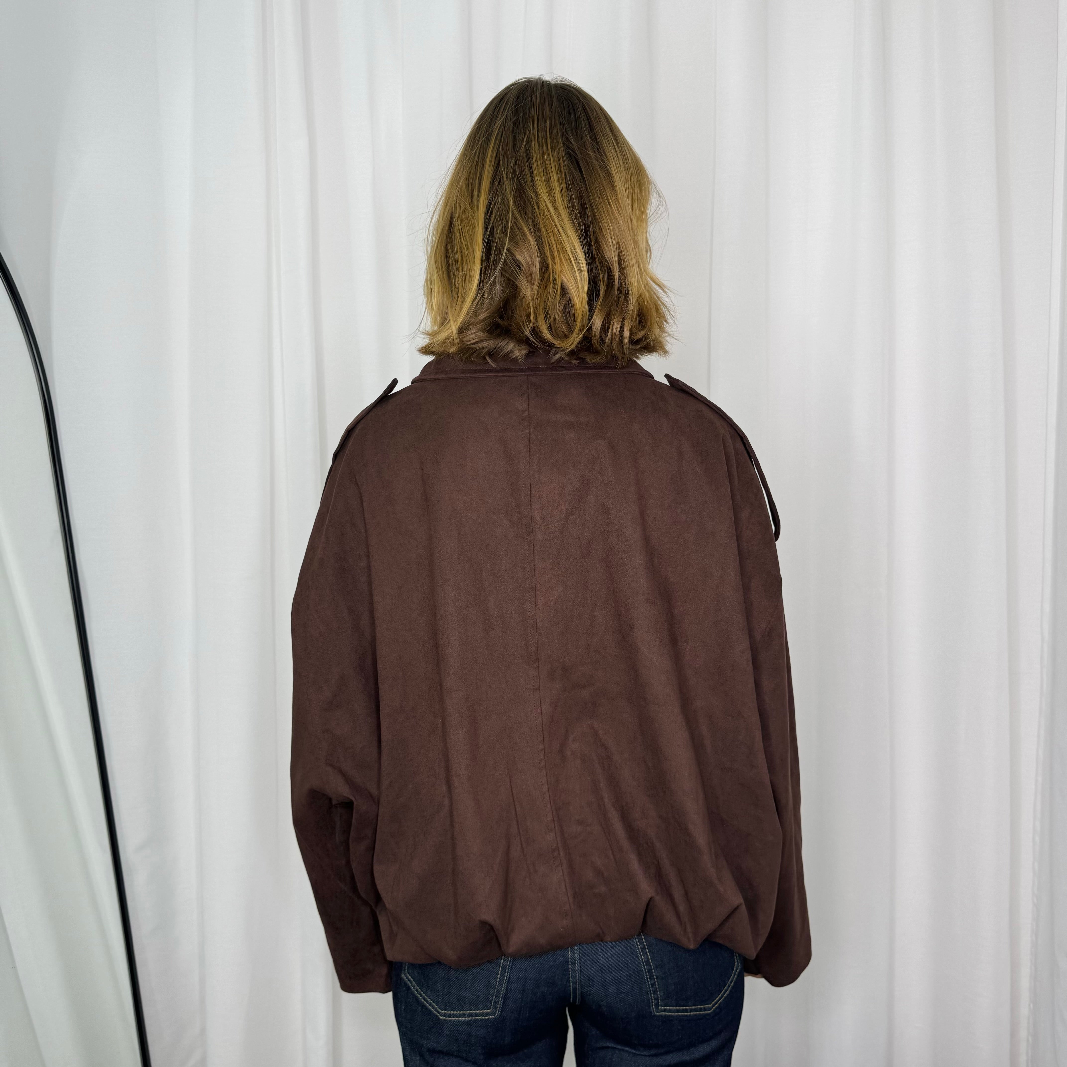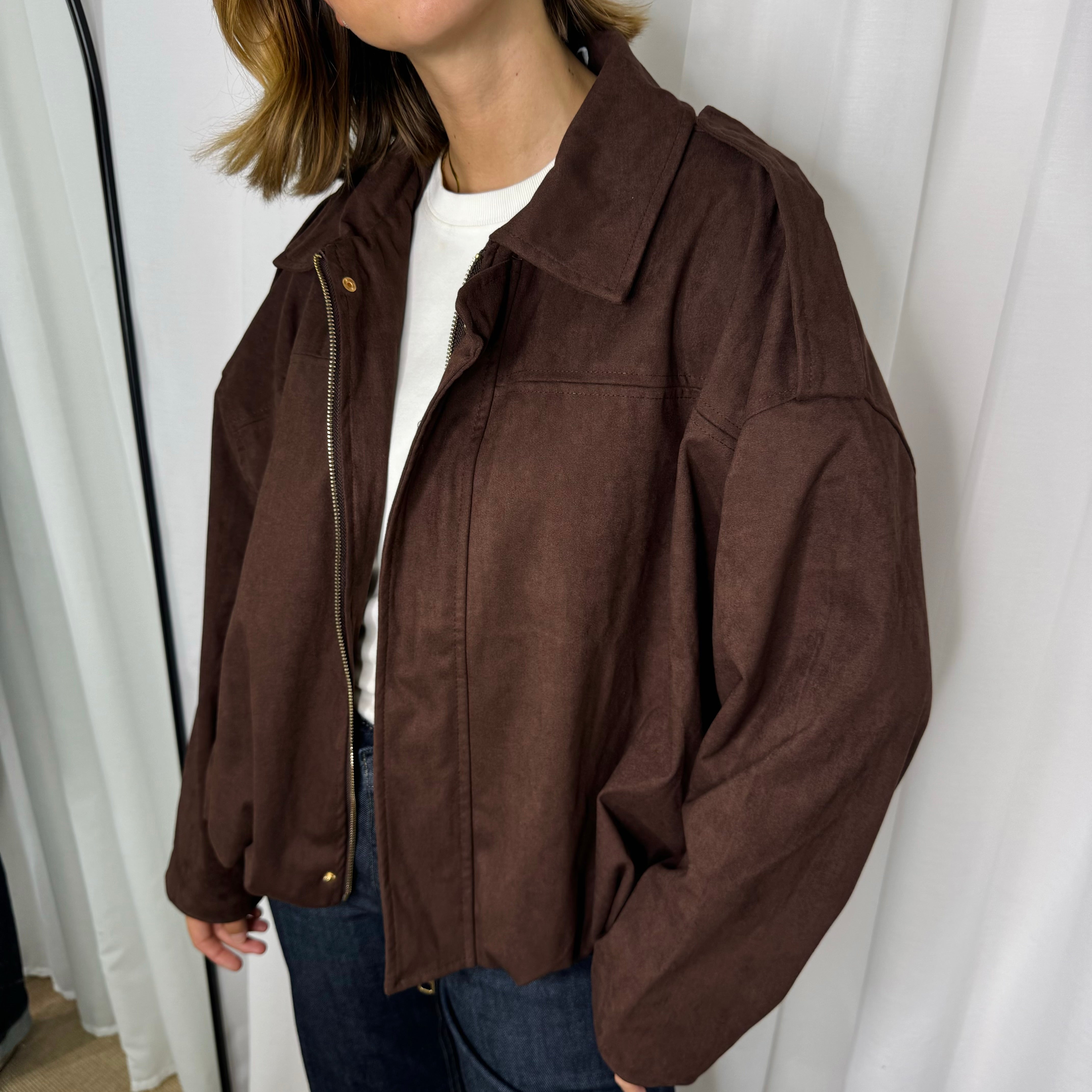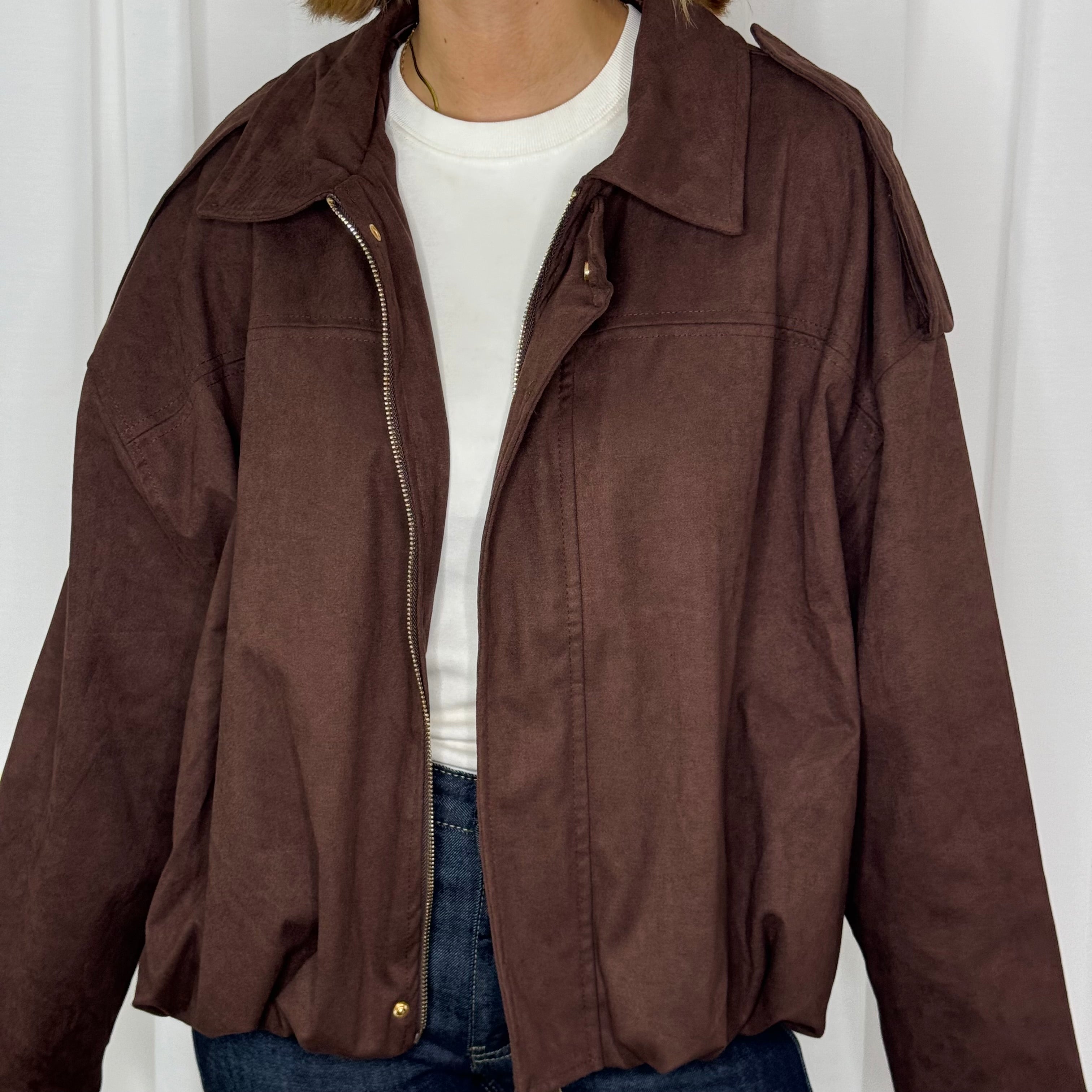 Casaco bomber ablusado castanho em nobuck. Gola em aba. Presilhas nos ombros. Aperta com fecho zíper e com botão-mola.