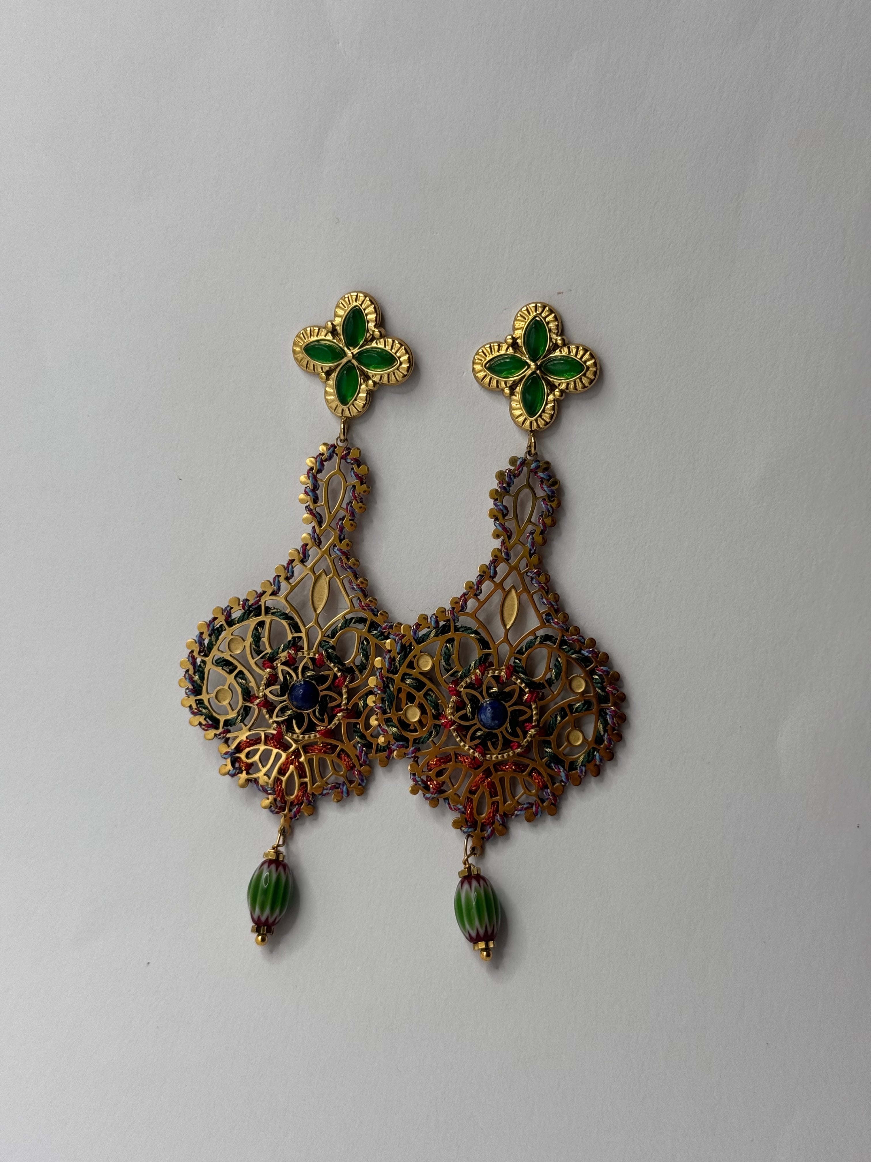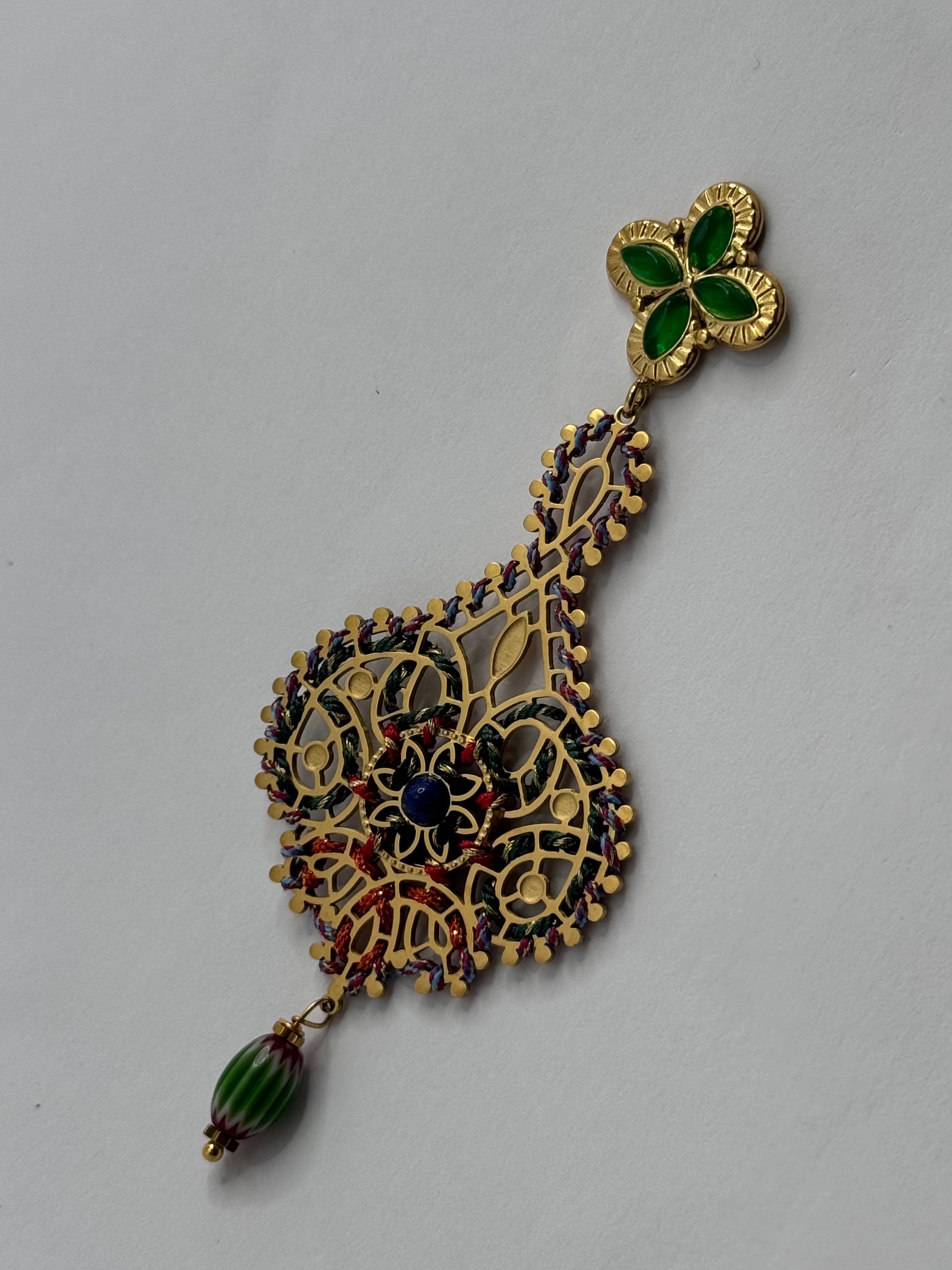 Brincos em aço inoxidável com pedras naturais e fio multicolor - verde, azul e bordeaux.