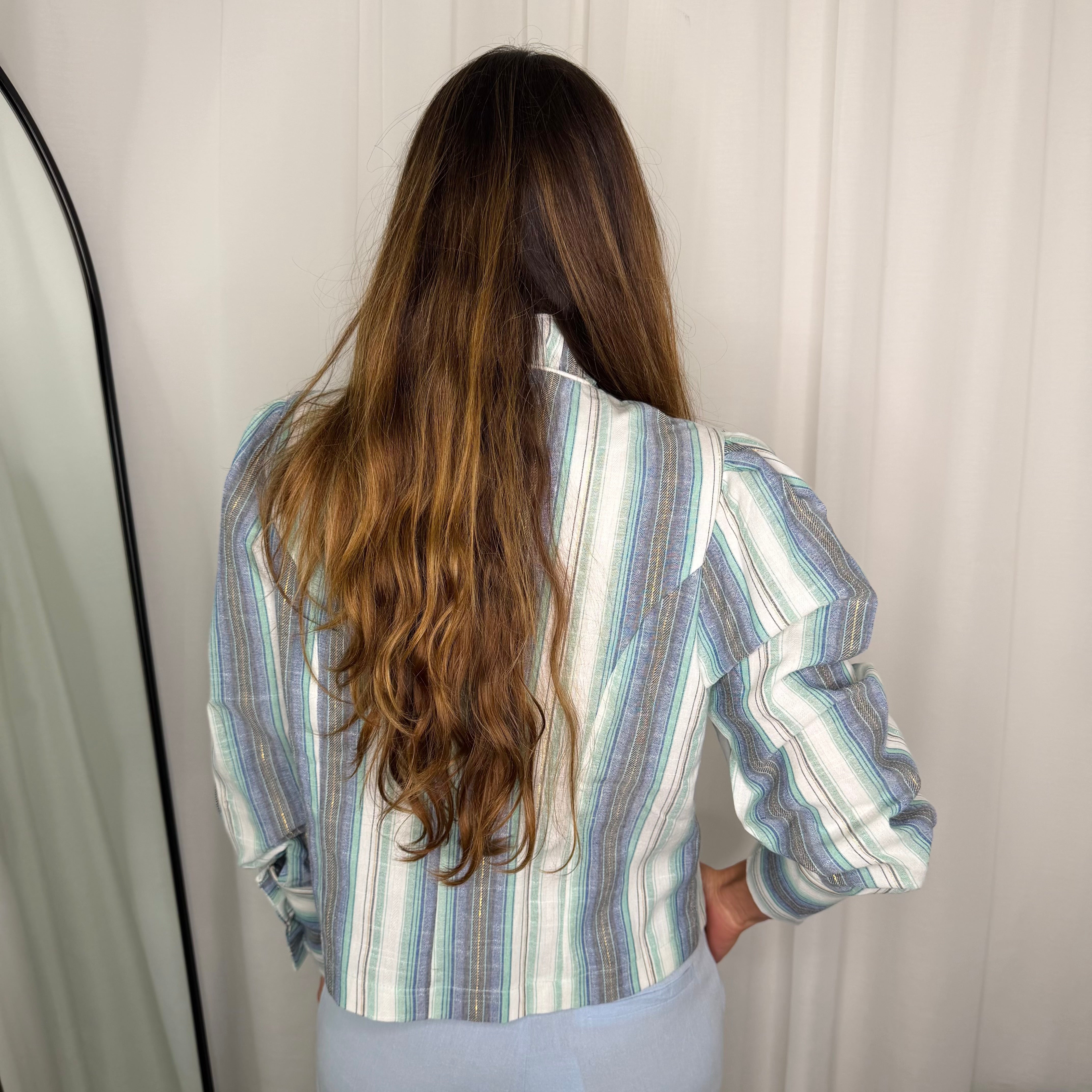 Camisa / casaco azul com riscas em várias tonalidades. Aperta com botões forrados.