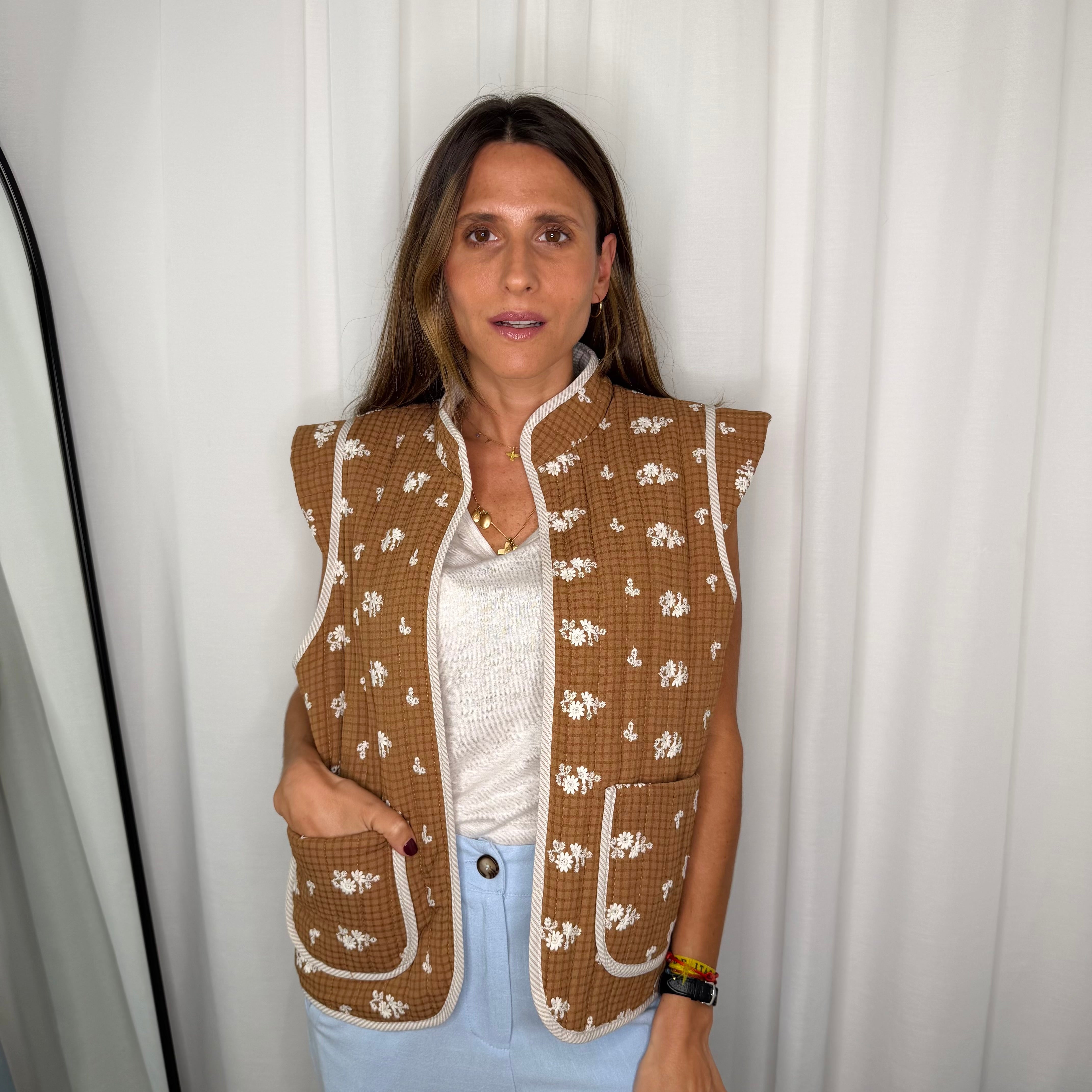 Colete camel com bordados em flores. Bolsos à frente.