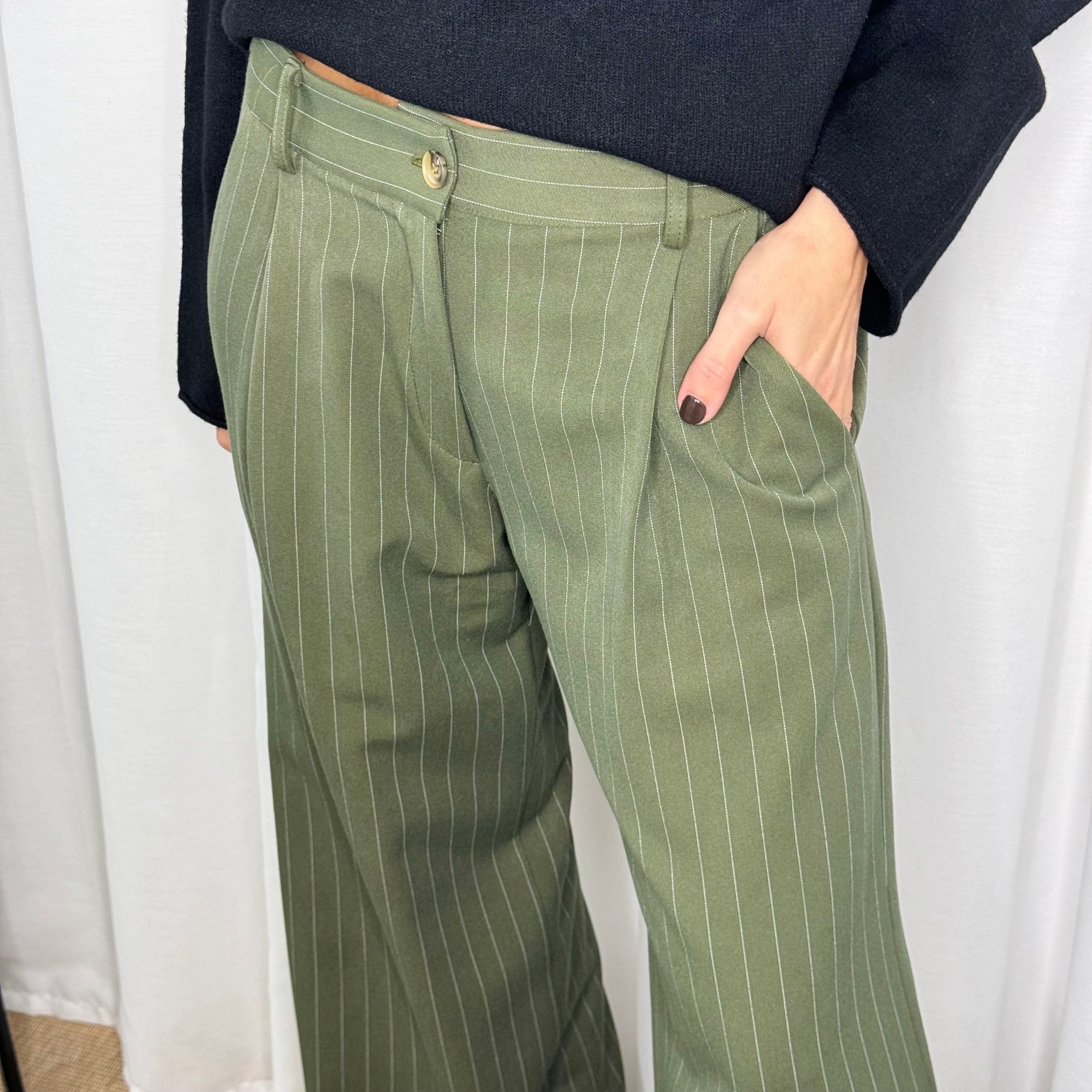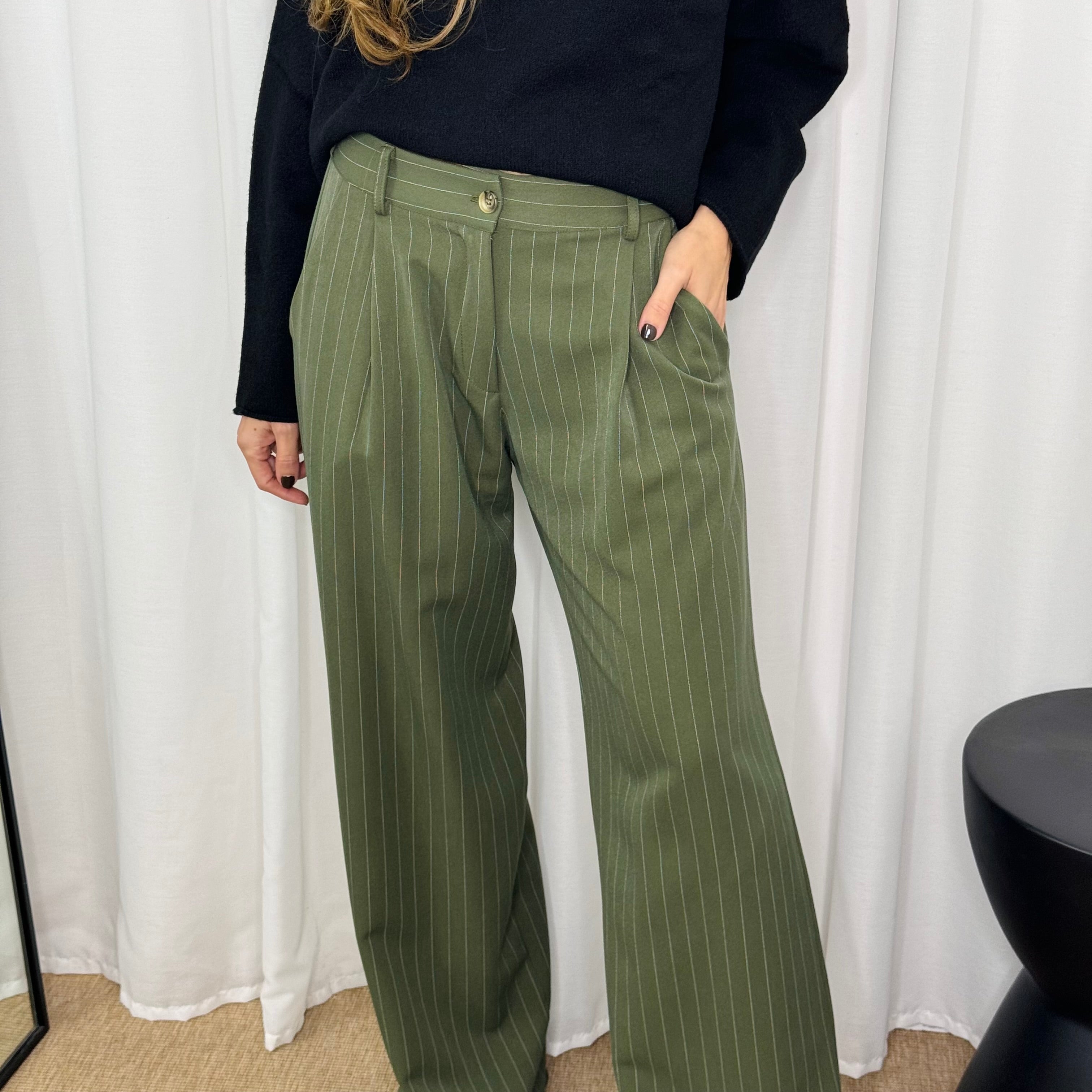 Calças modelo a direito com riscas. Elástico na cintura atrás. Aperta com fecho e botão.
