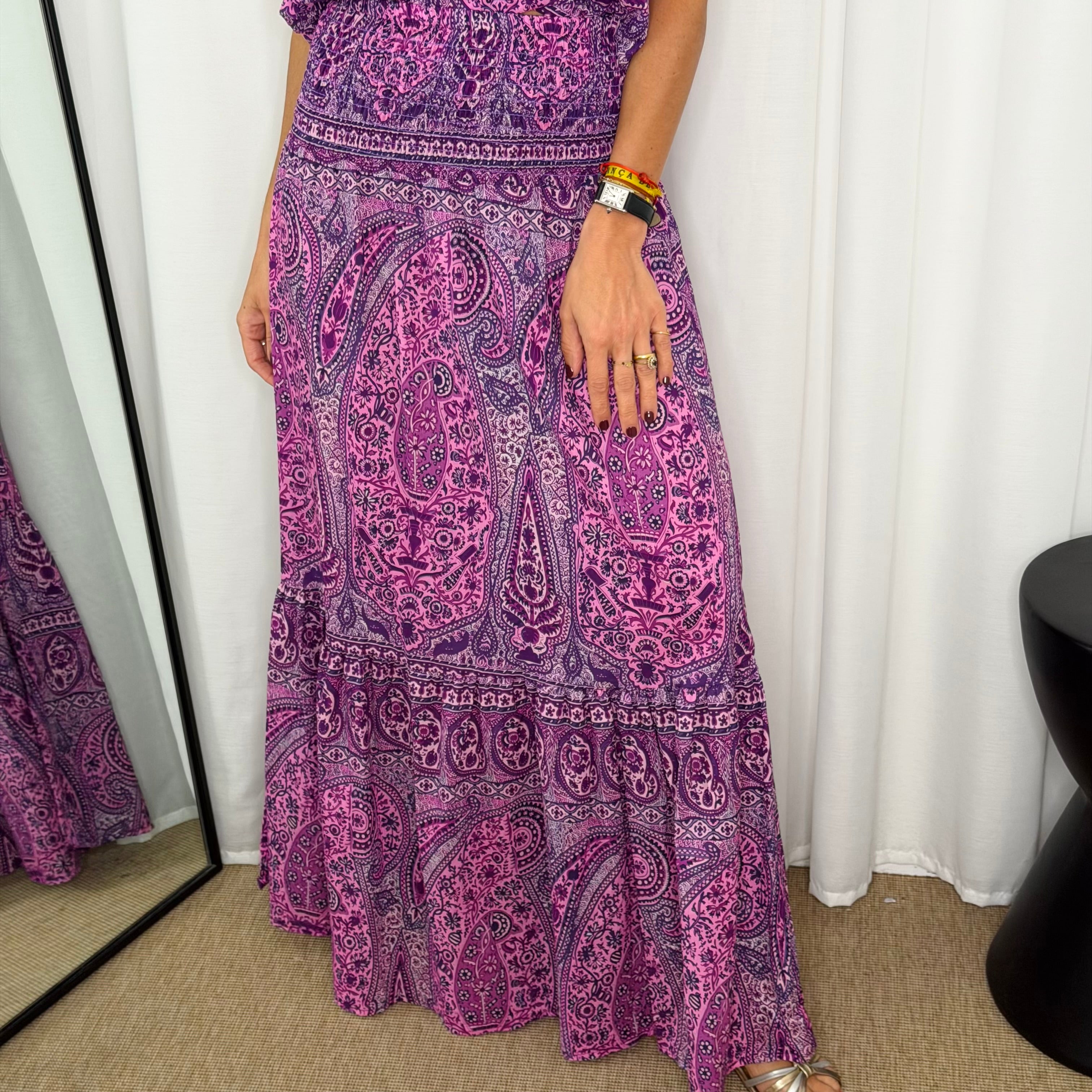 Conjunto top e saia roxo estampado. Top de decote redondo e mangas cavas. Atilho na cintura. Saia midi com elástico na cintura.