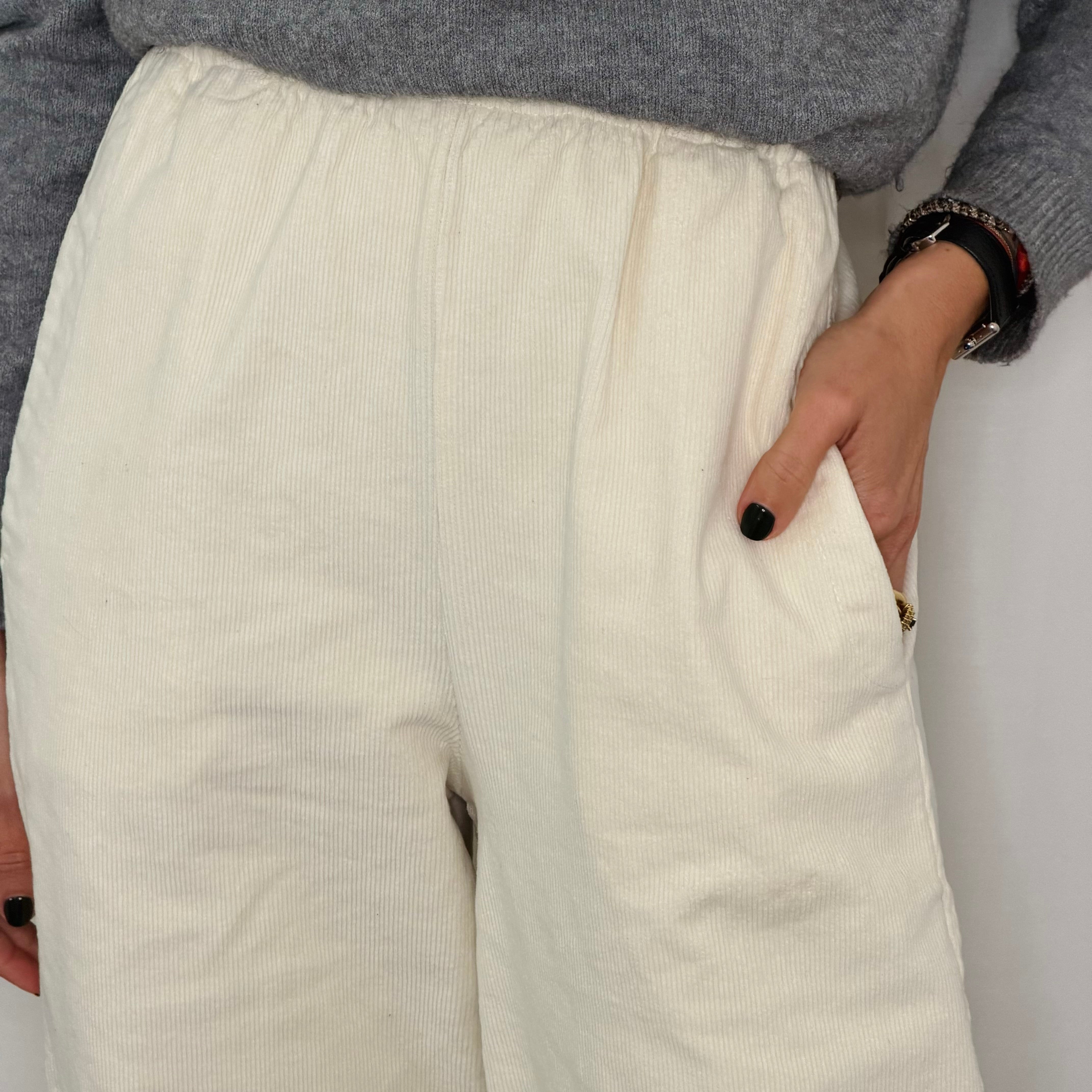 Calças modelo baggy em bombazine. Elástico na cintura. Bolsos laterais.