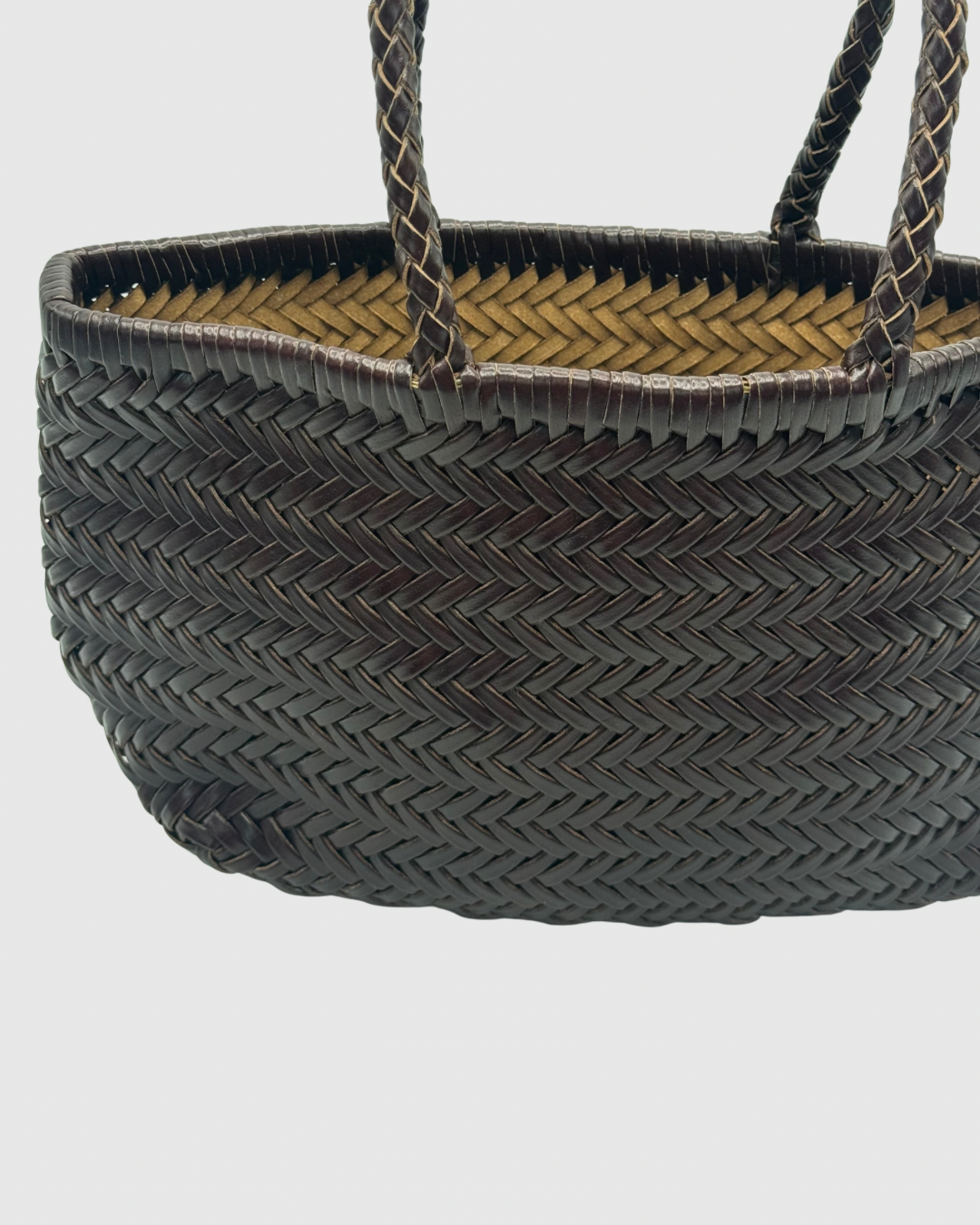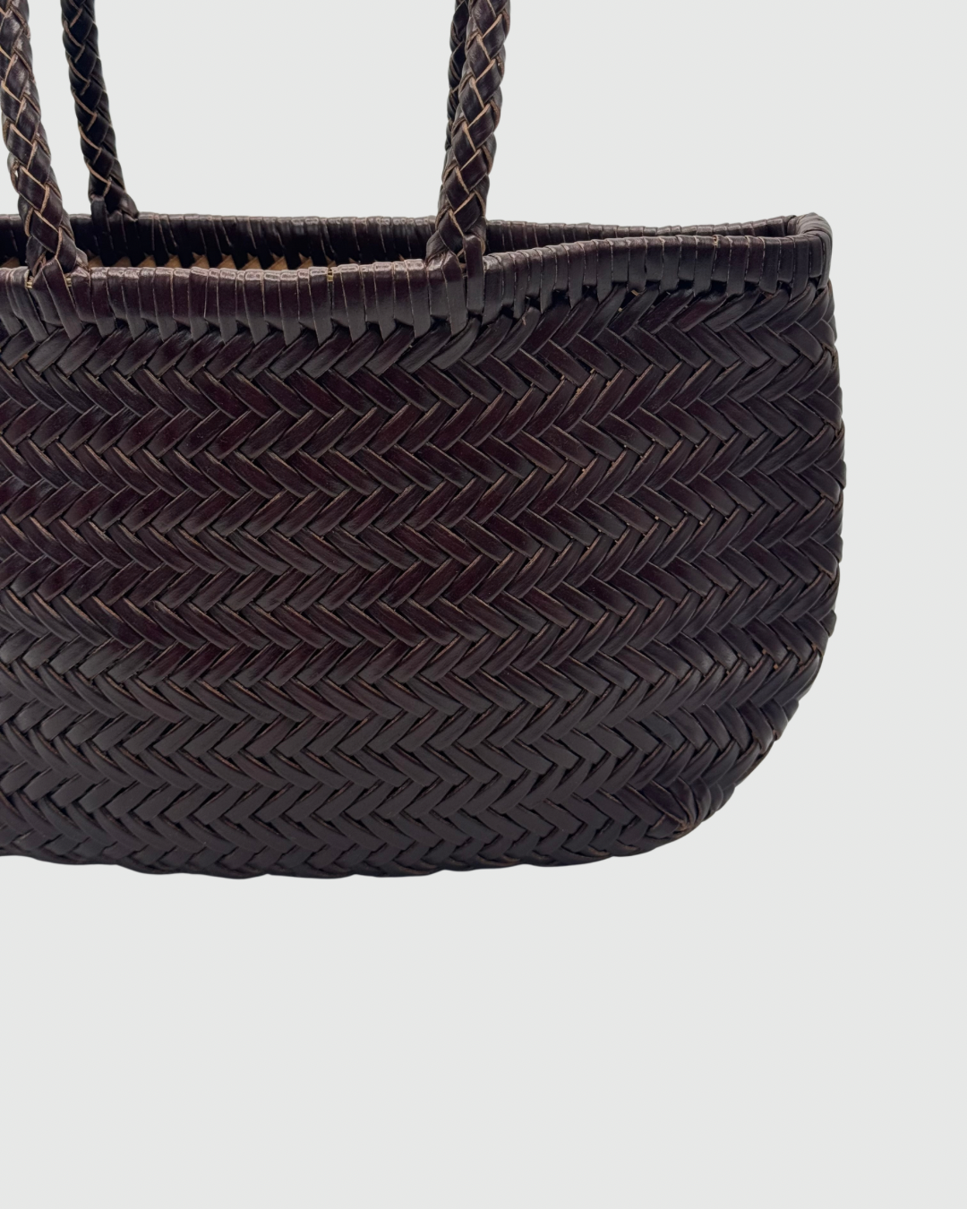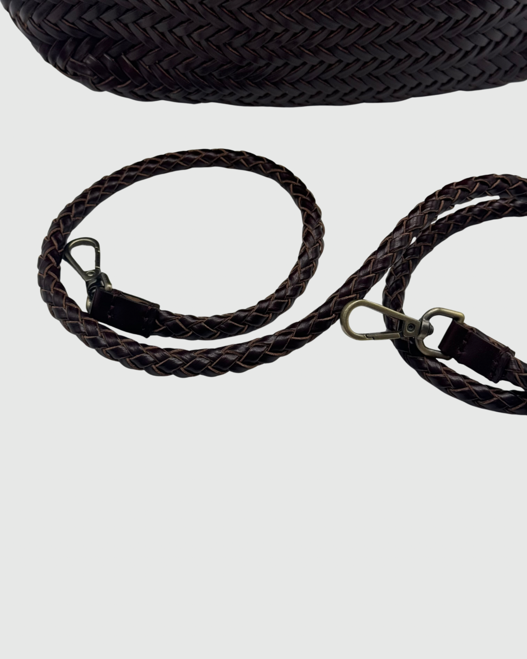 Carteira entrançada 100% pele. Alças curtas. Inclui bolsa forro e alça comprida.