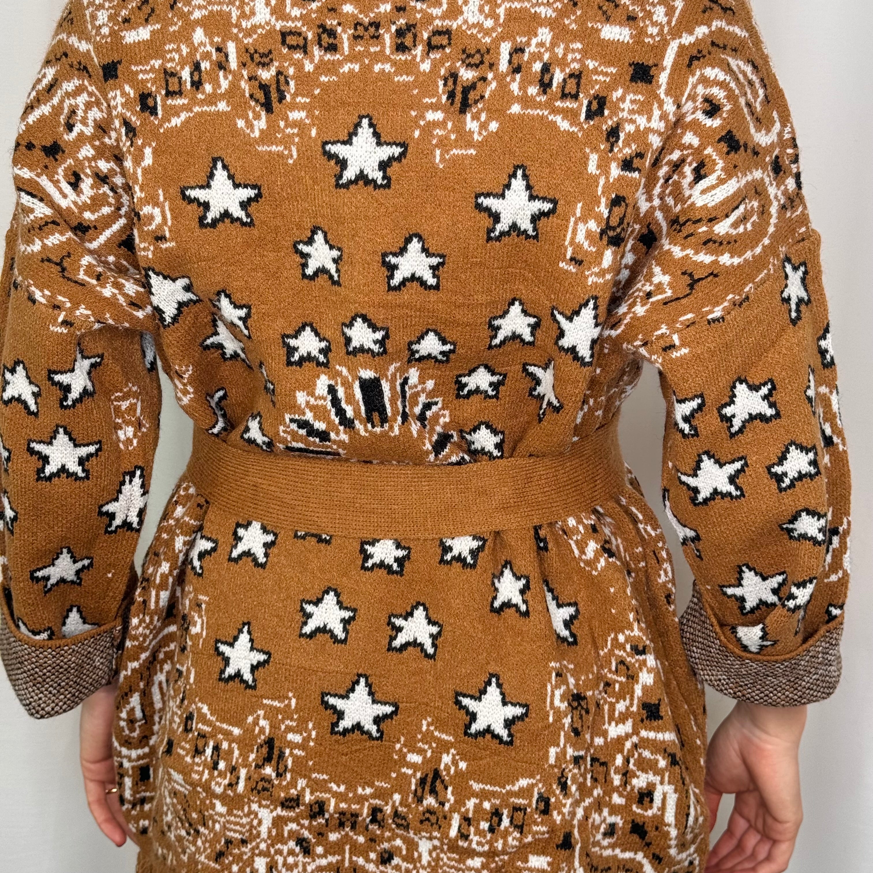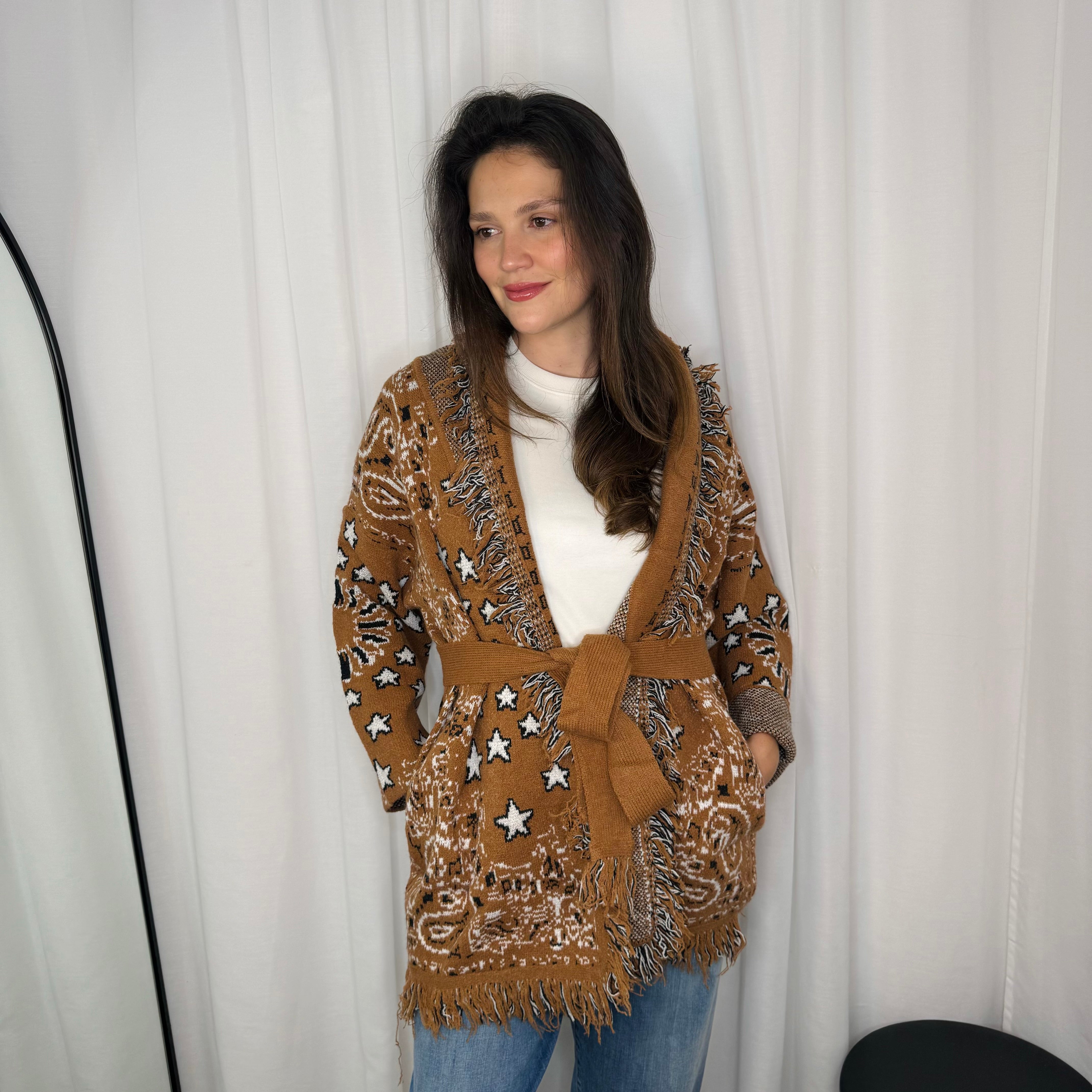 Casaco em malha fundo camel com estampado. Inclui cinto. Acabamentos em franjas.
