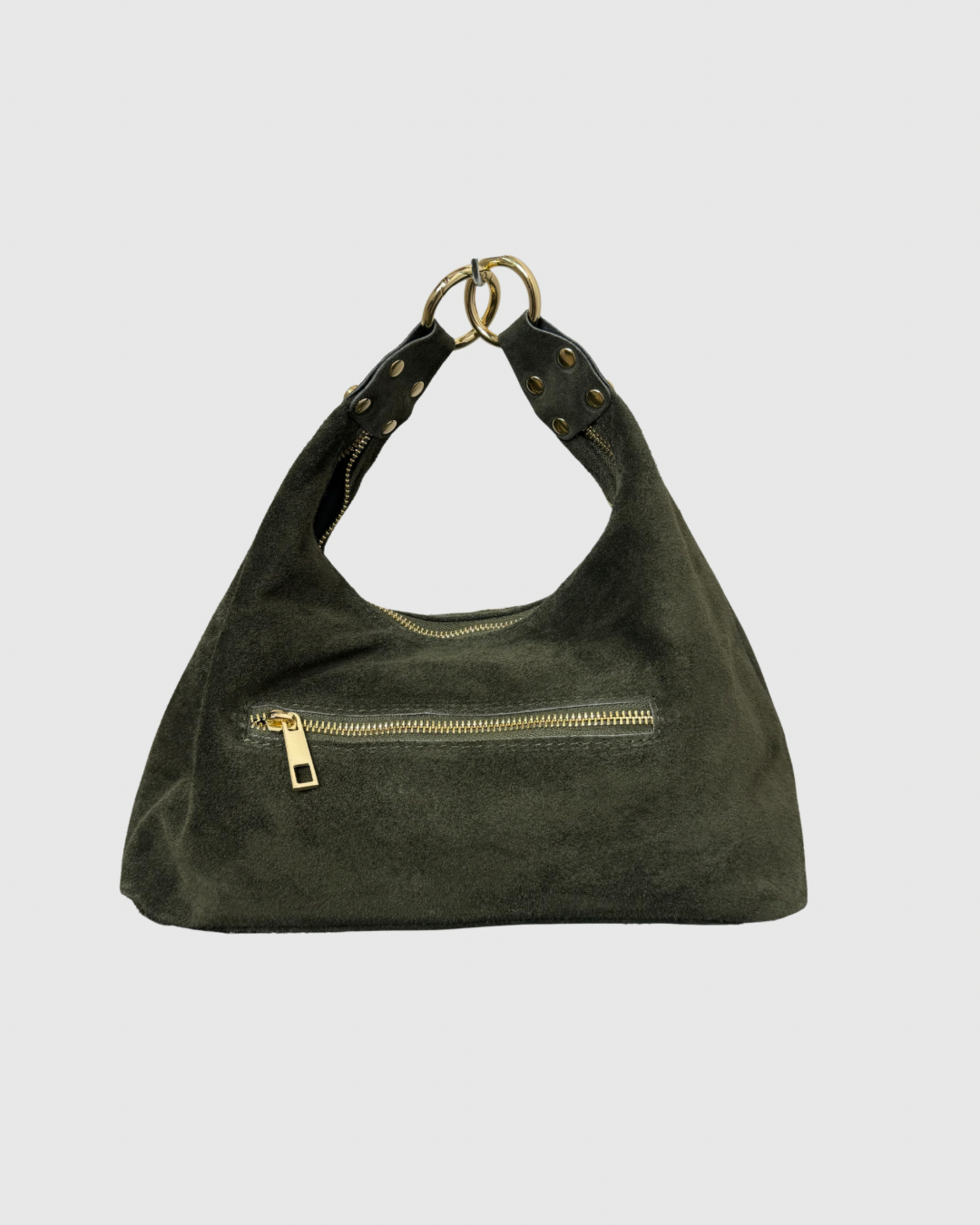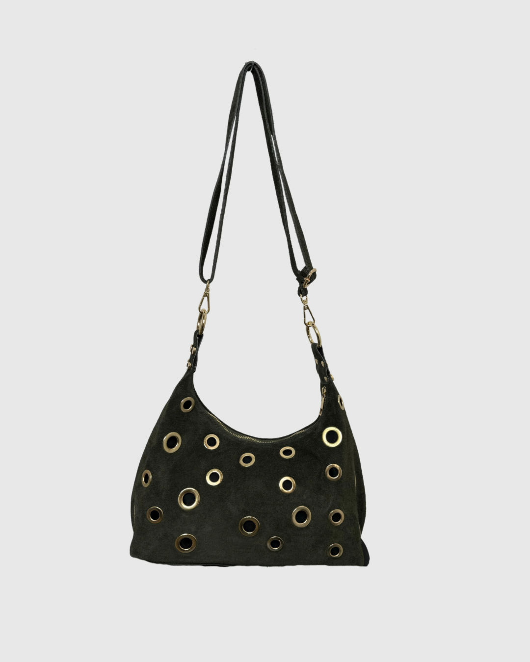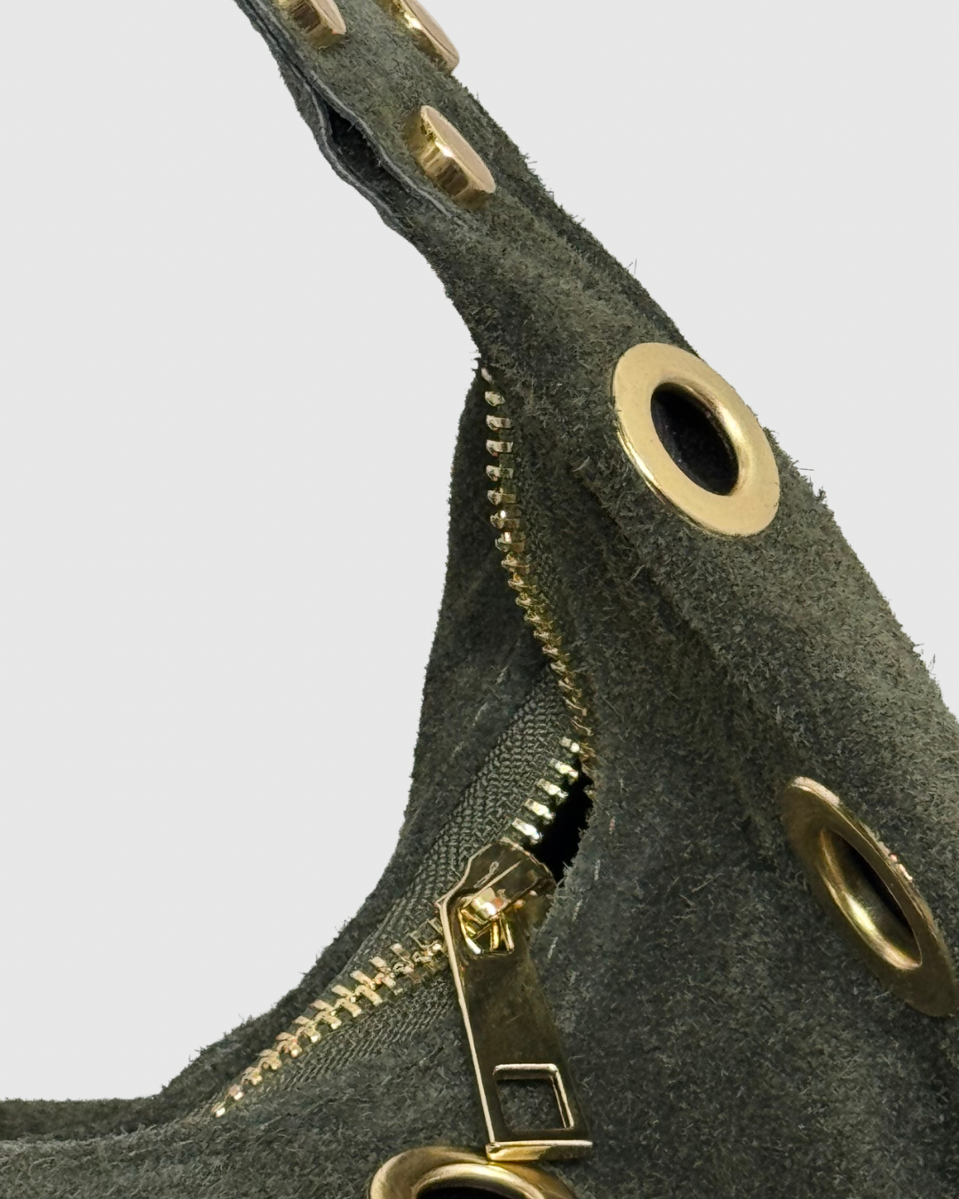 Carteira em camurça com elos dourados. Inclui alça ajustável amovível. Aperta com fecho.