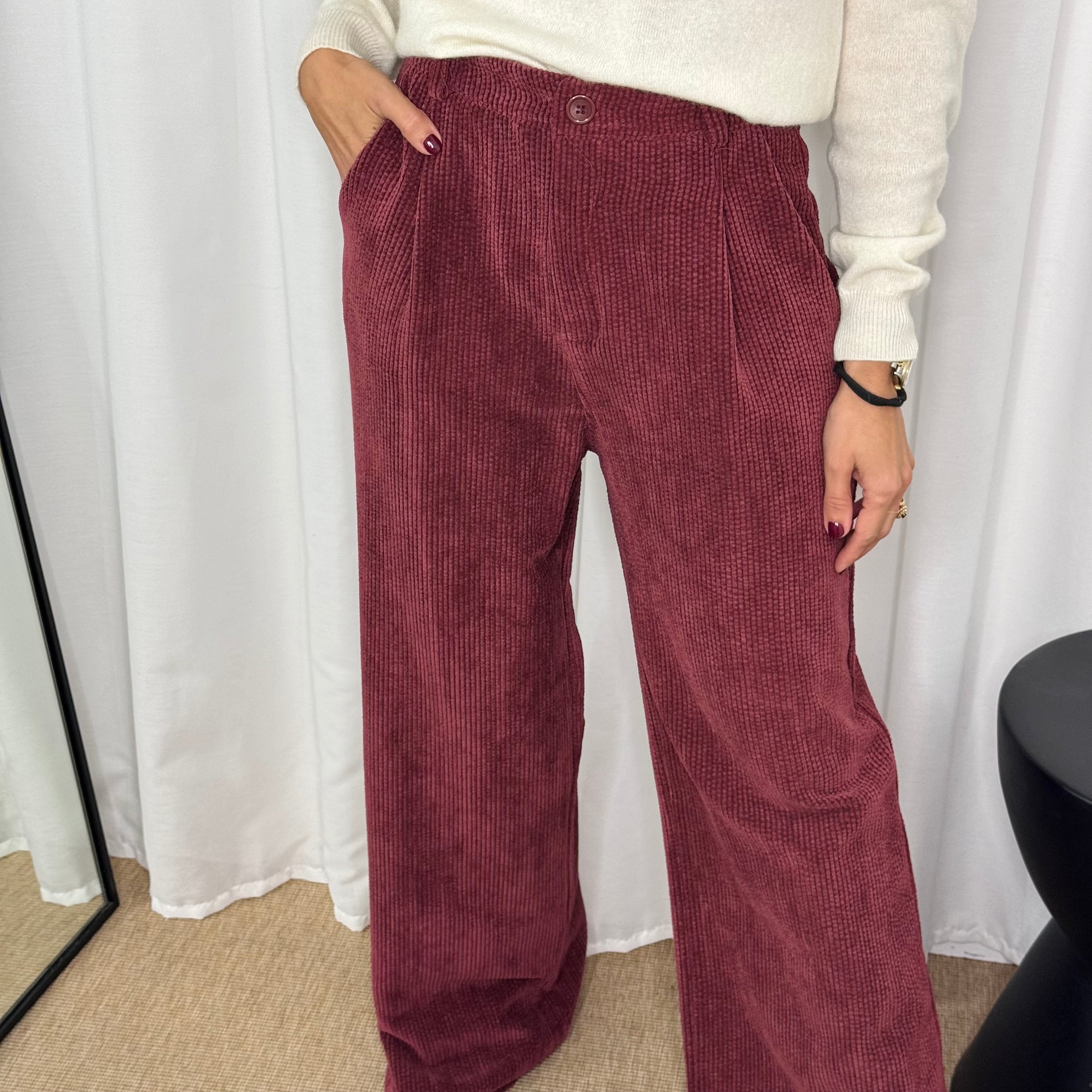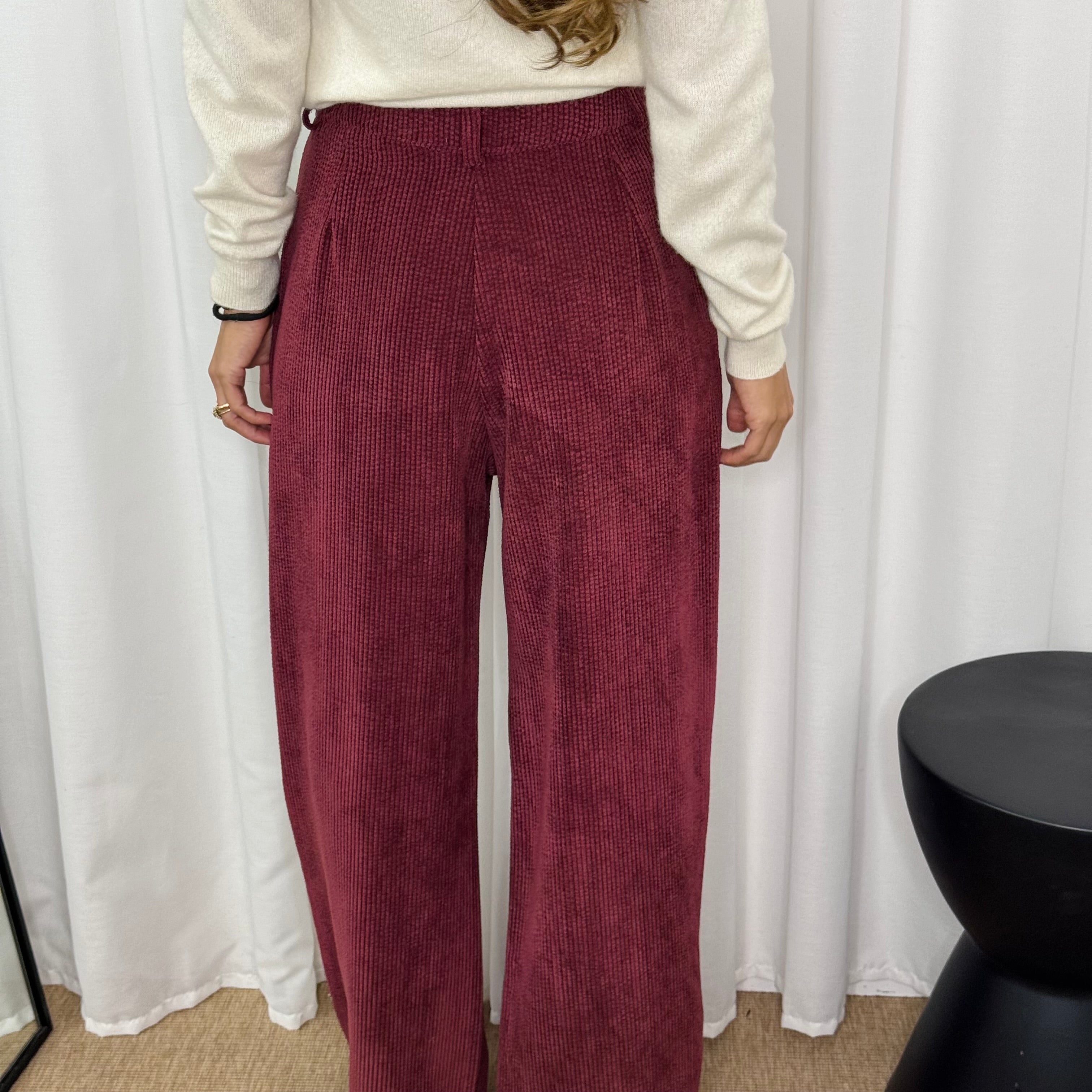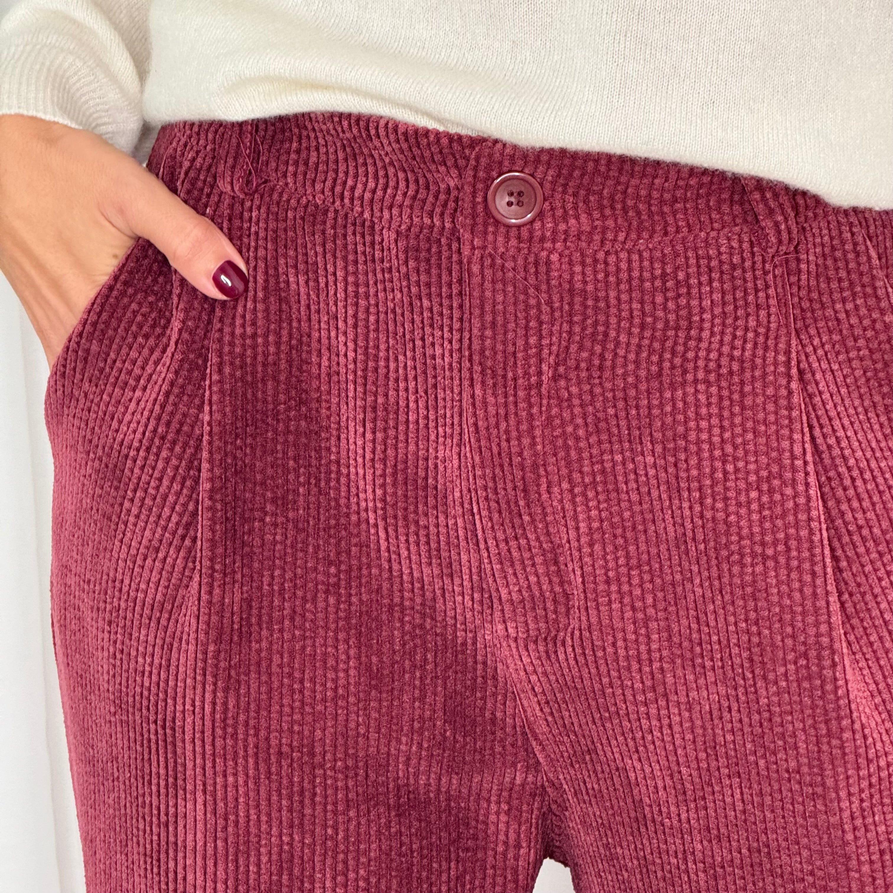 Calças em bombazine com pregas. Aperta com fecho e botão. Bolsos laterais.