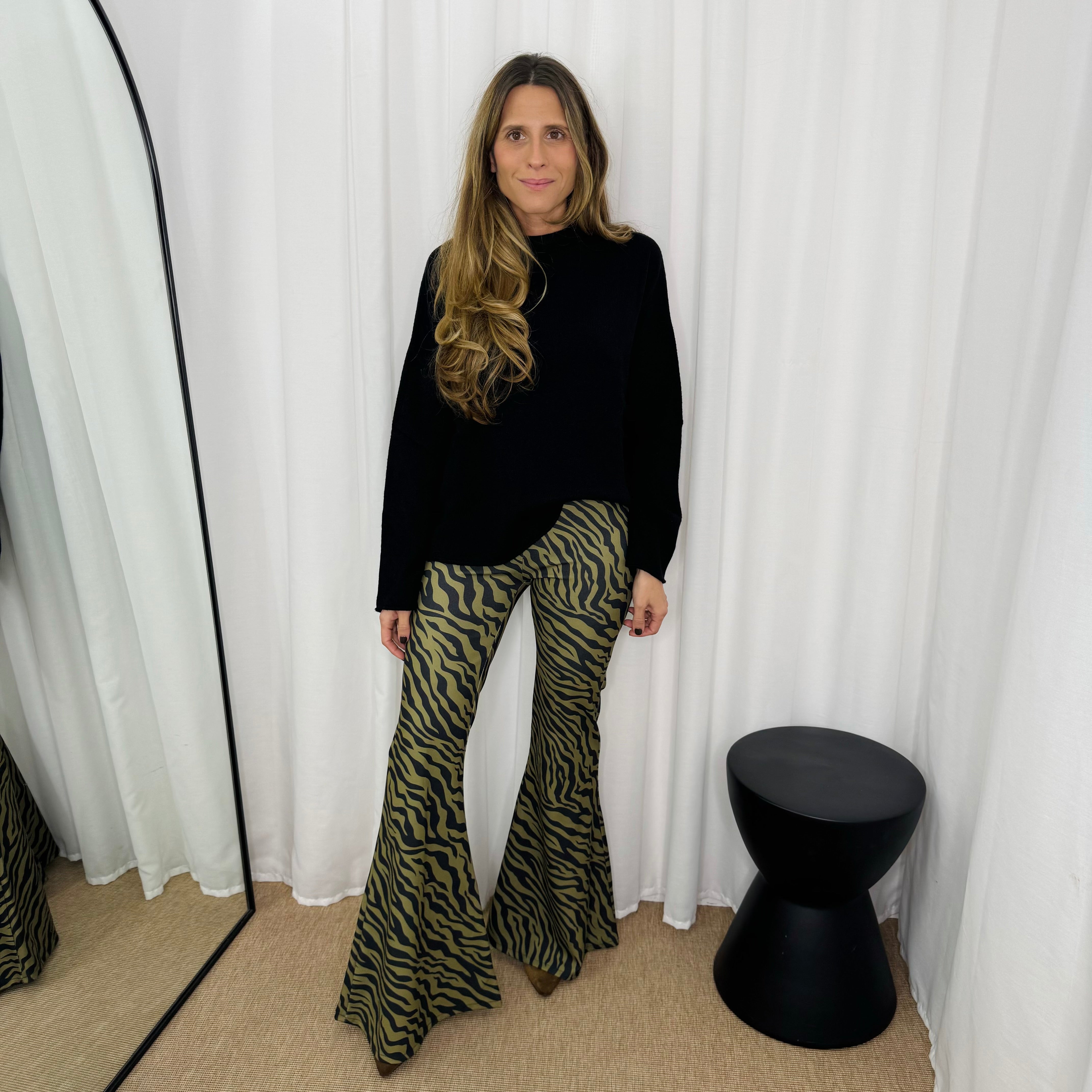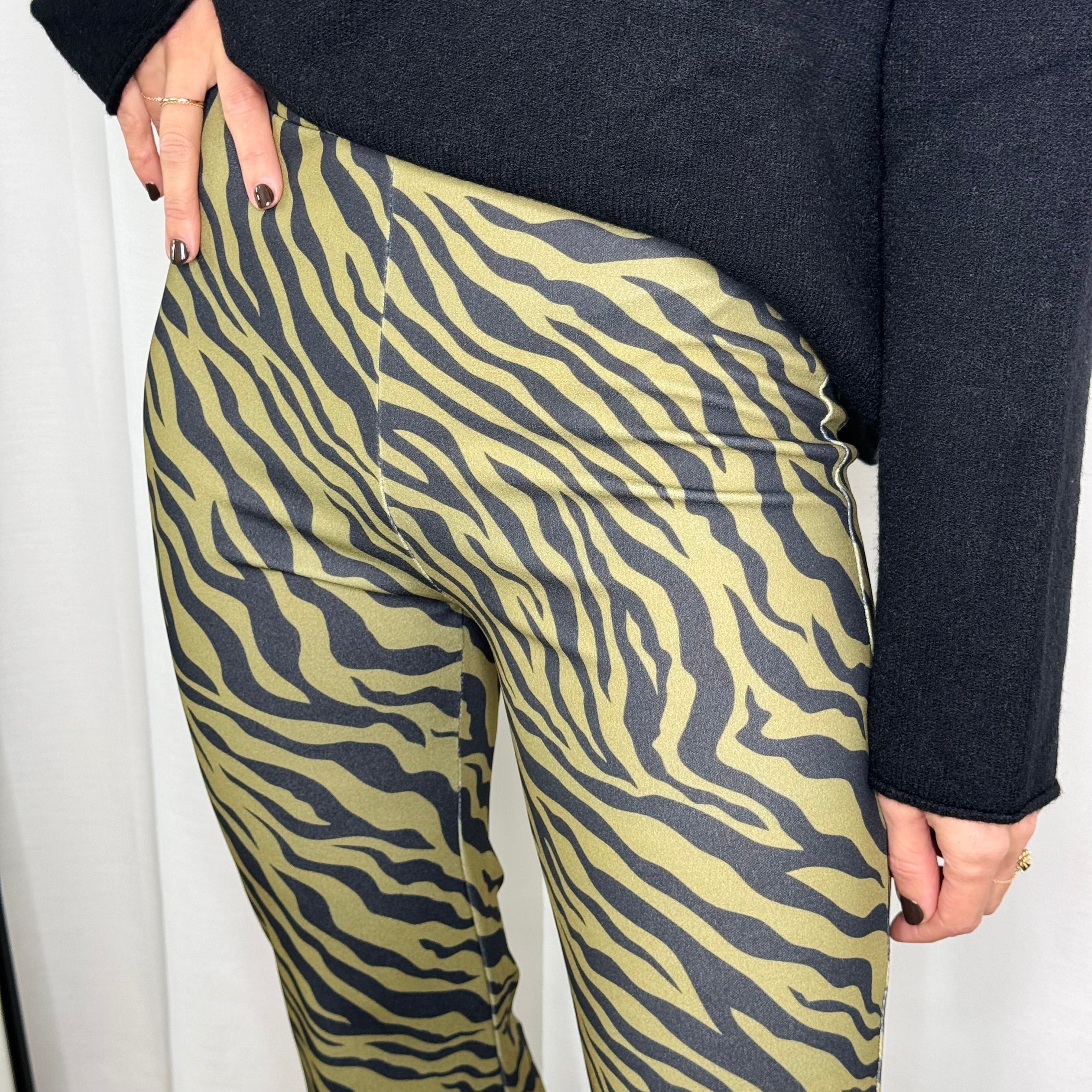 Calças modelo boca sino. Fundo verde estampado zebra preto. Elástico na cintura.