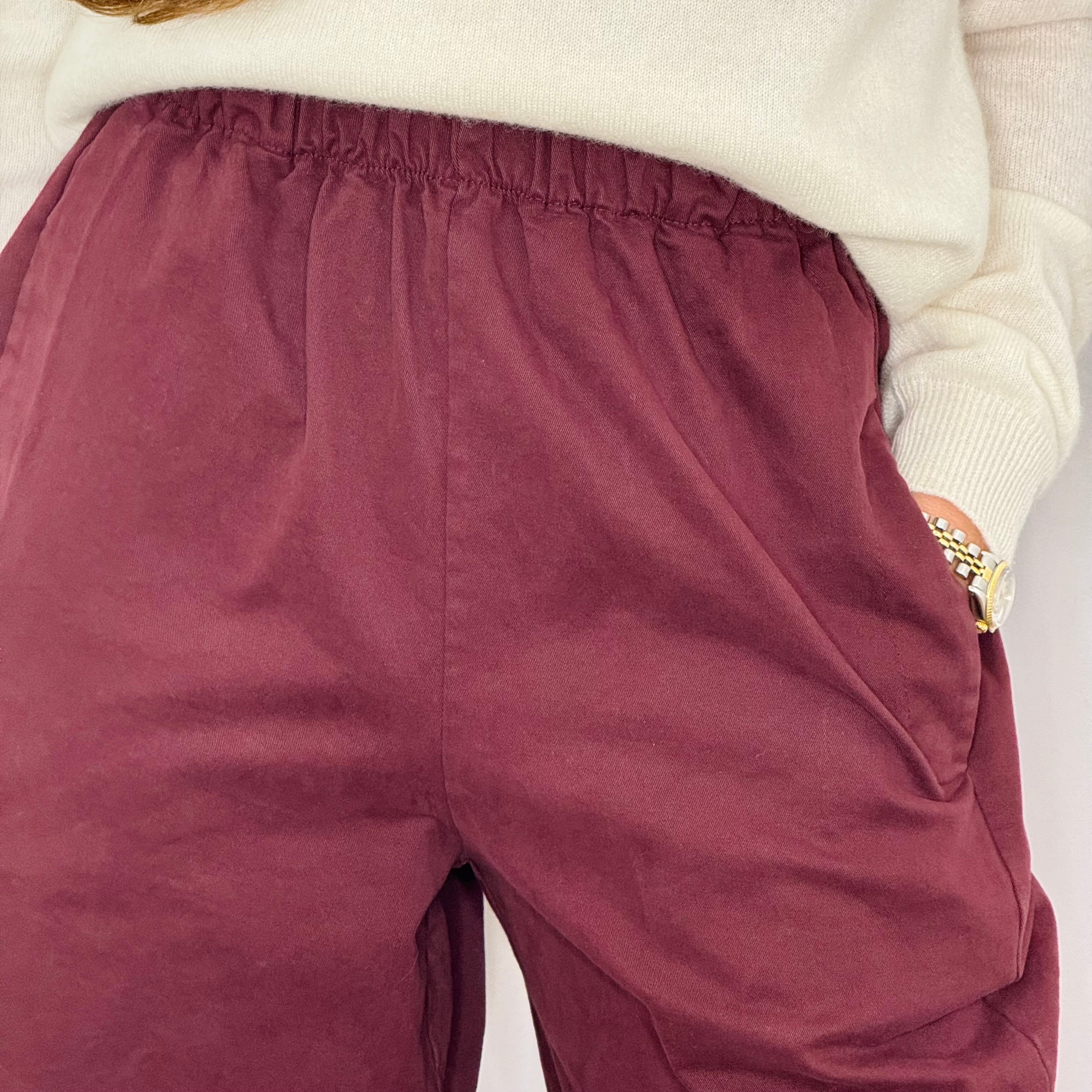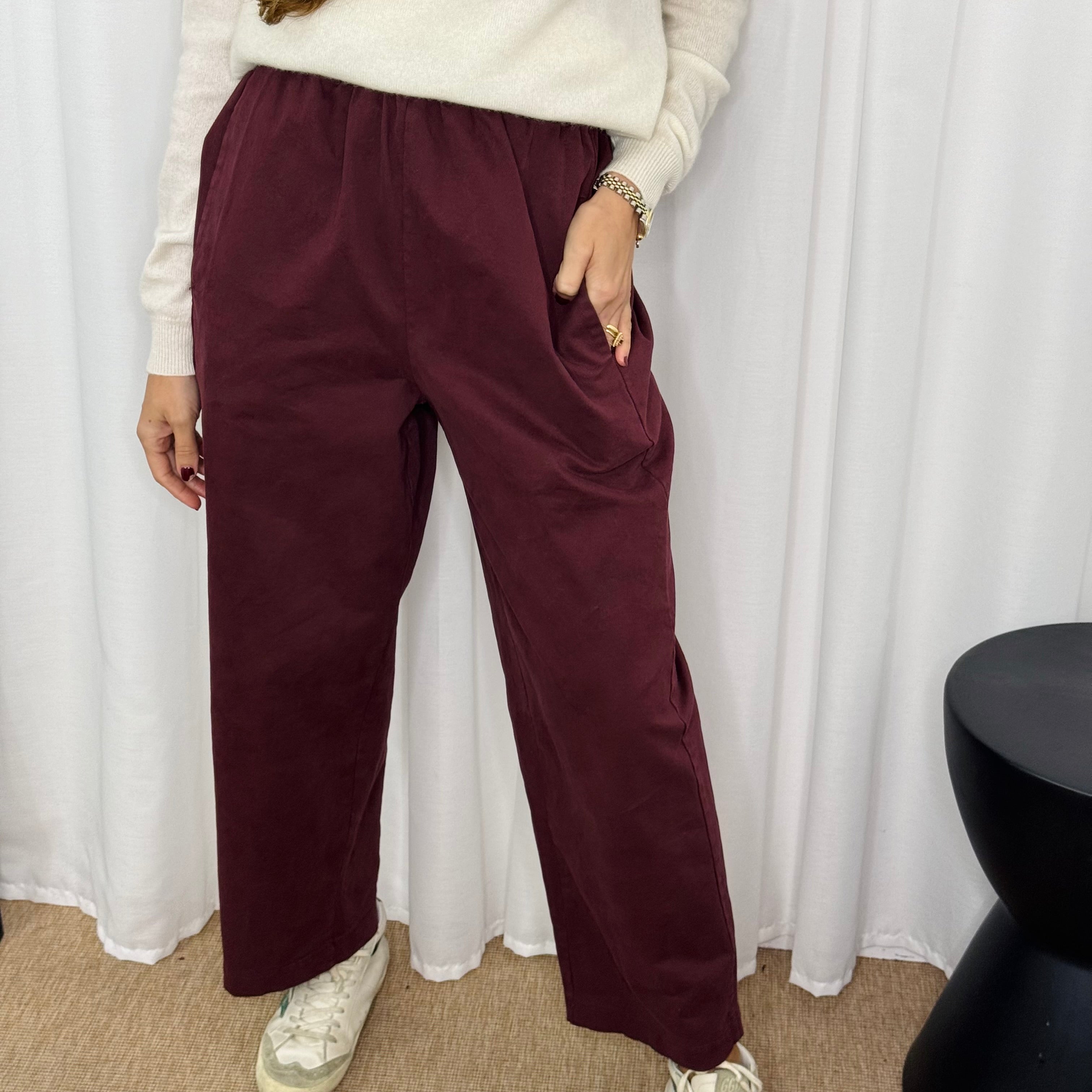 Calças modelo baggy. Elástico na cintura. Bolsos laterais.
