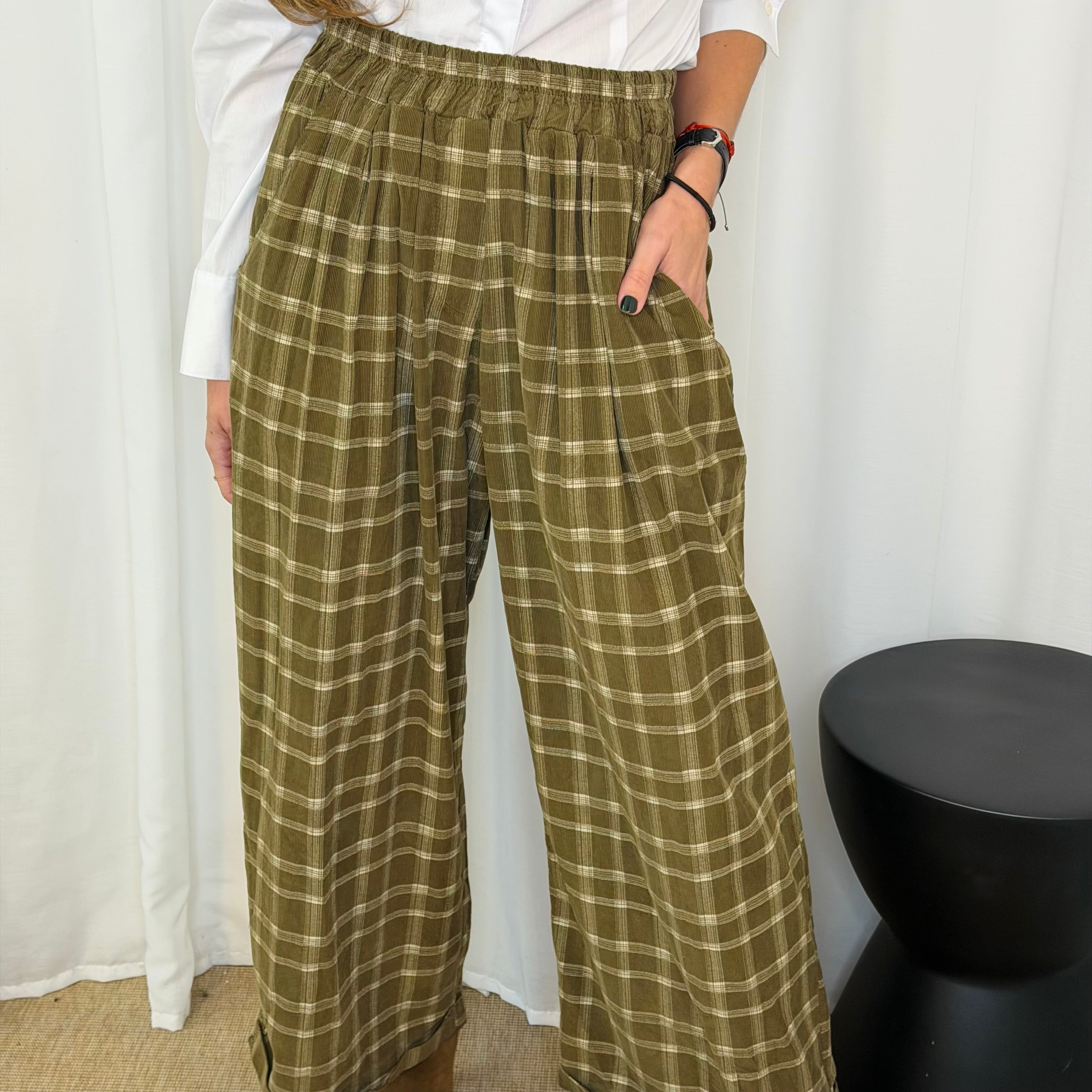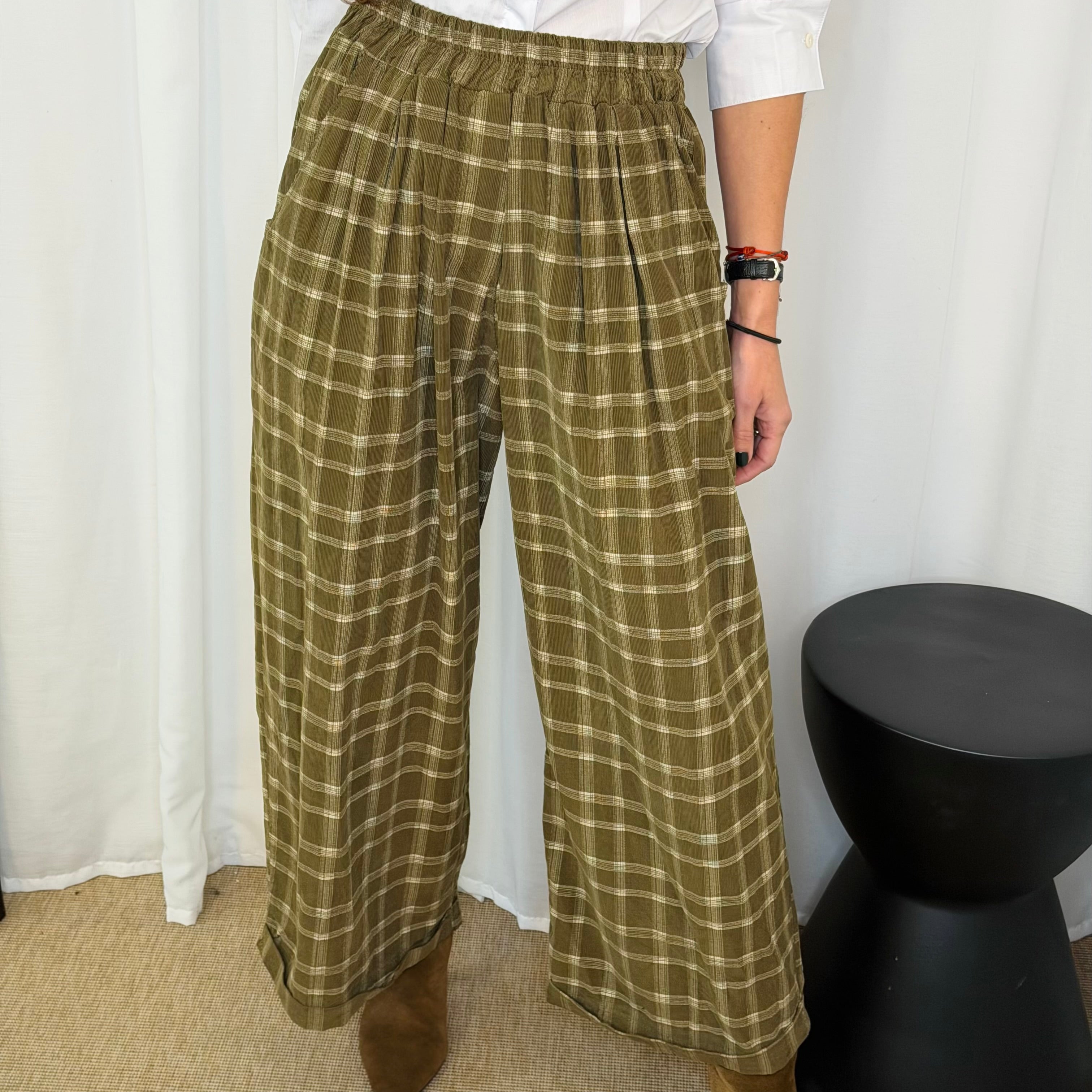 Calças perna larga. Fundo verde azeitona com estampado xadrez. Elástico na cintura. Bolsos laterais.