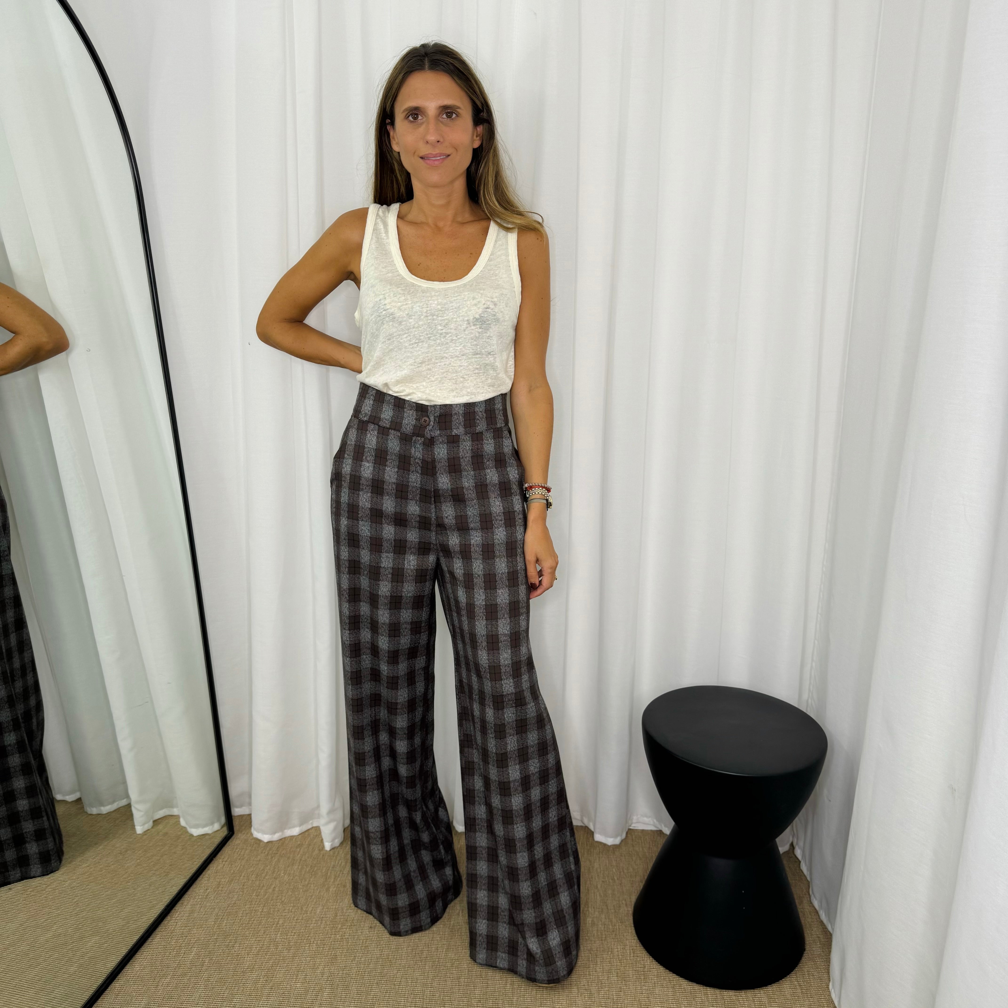Calças corte a direito. Fundo castanho com padrão escocês em cinzento. Aperta com fecho e botão. Bolsos laterais.