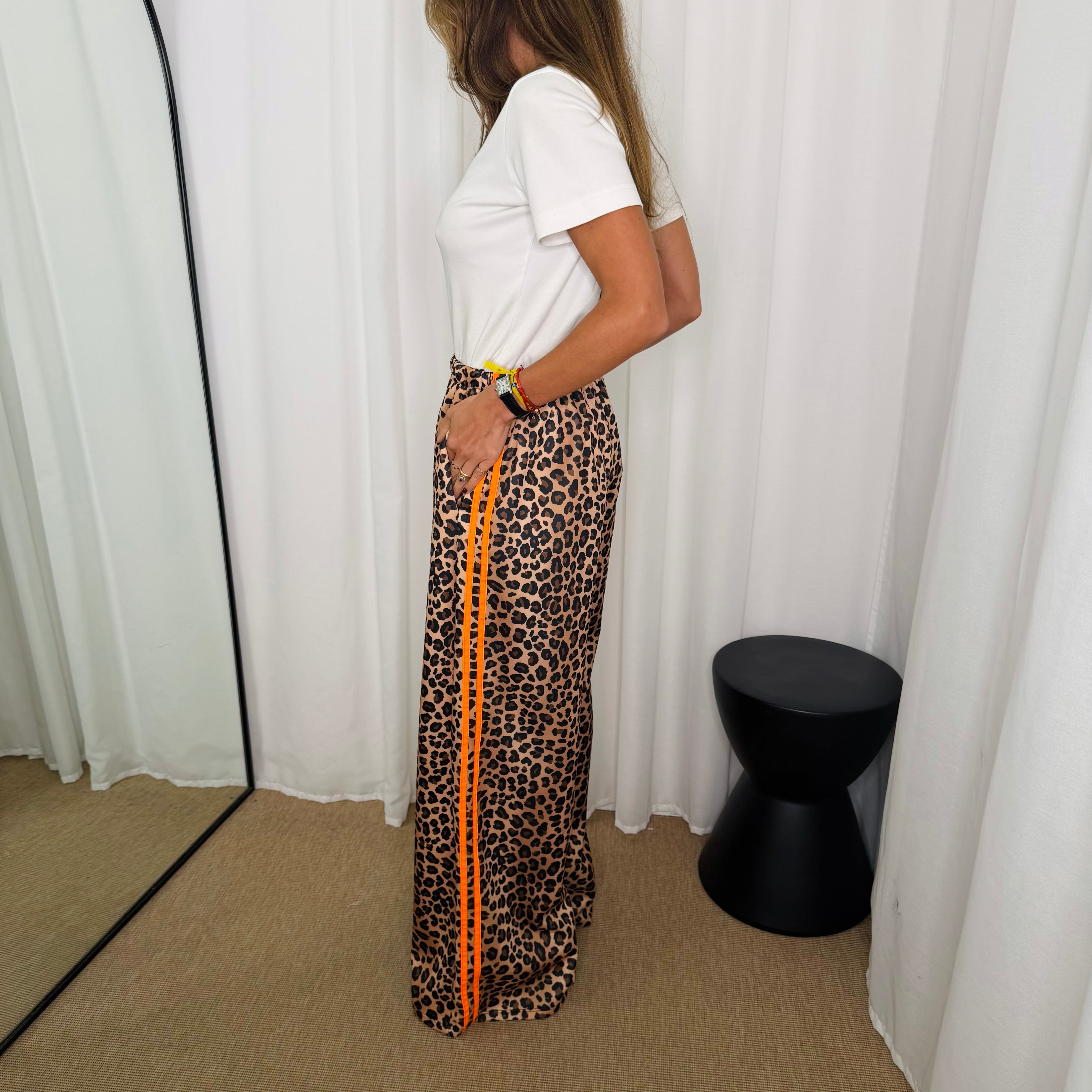 Calças em malha seda confortáveis e maleáveis. Elástico na cintura. Bolsos laterais. Estampado animal print com risca dupla lateral em cor de laranja.