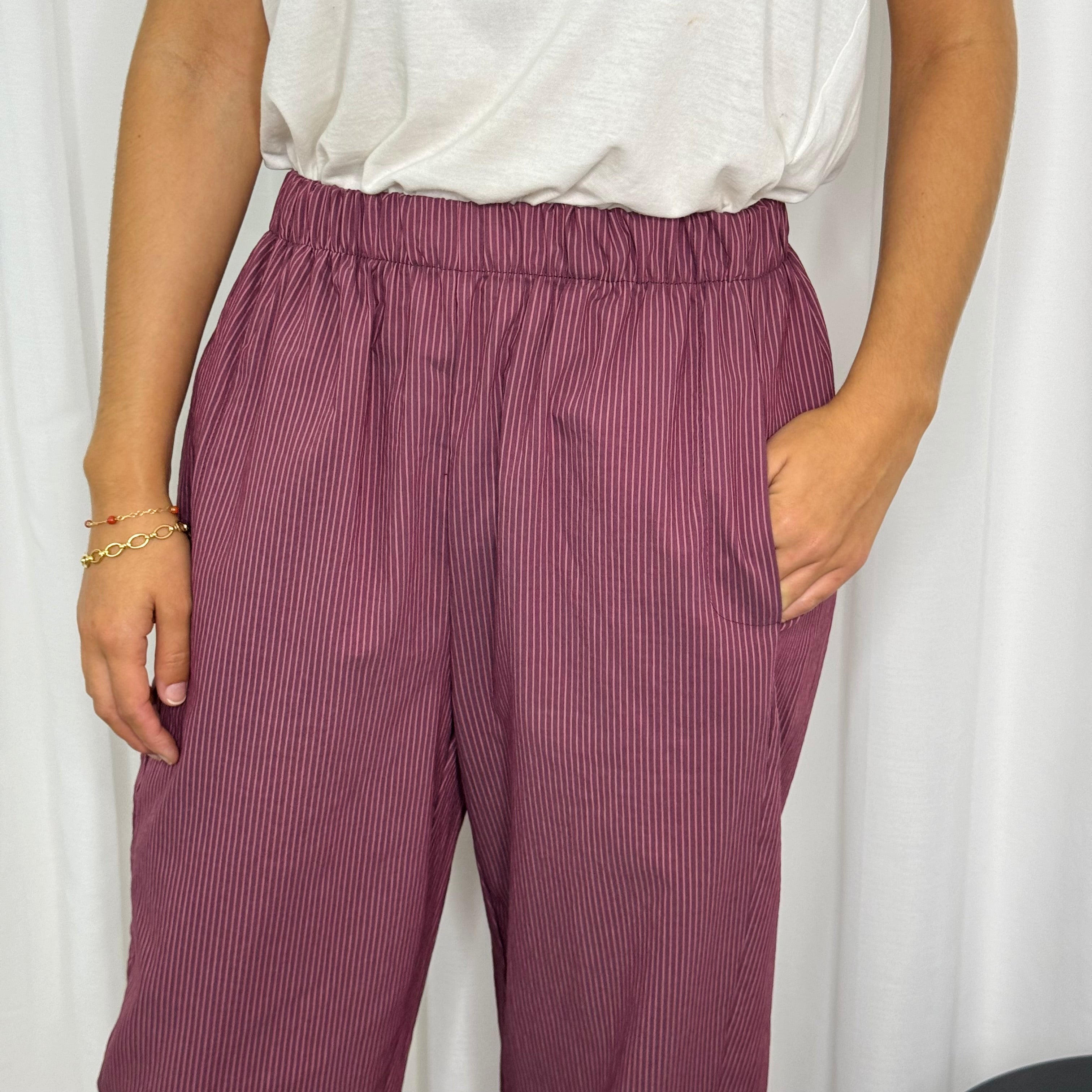 Calças modelo baggy com riscas. Elástico na cintura. Bolsos laterais.