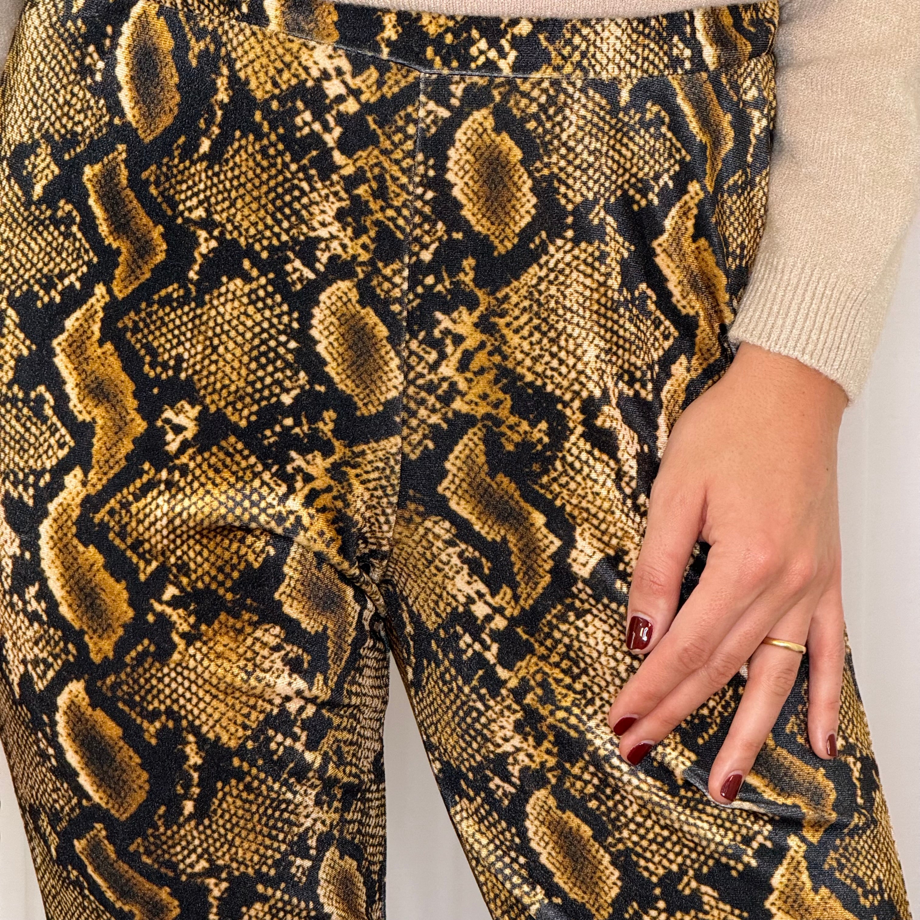 Calças boca sino veludo camel estampado serpente. Elástico na cintura.