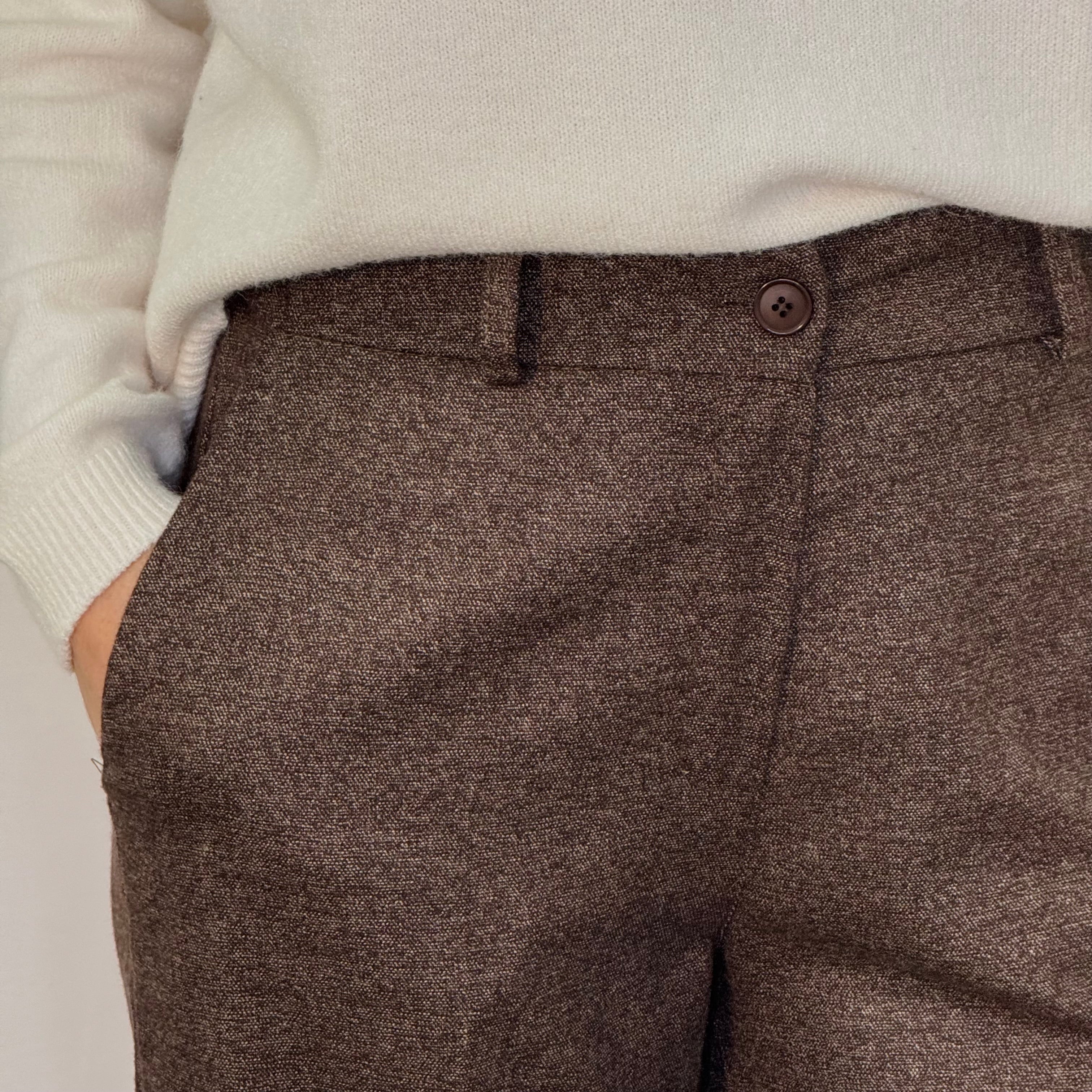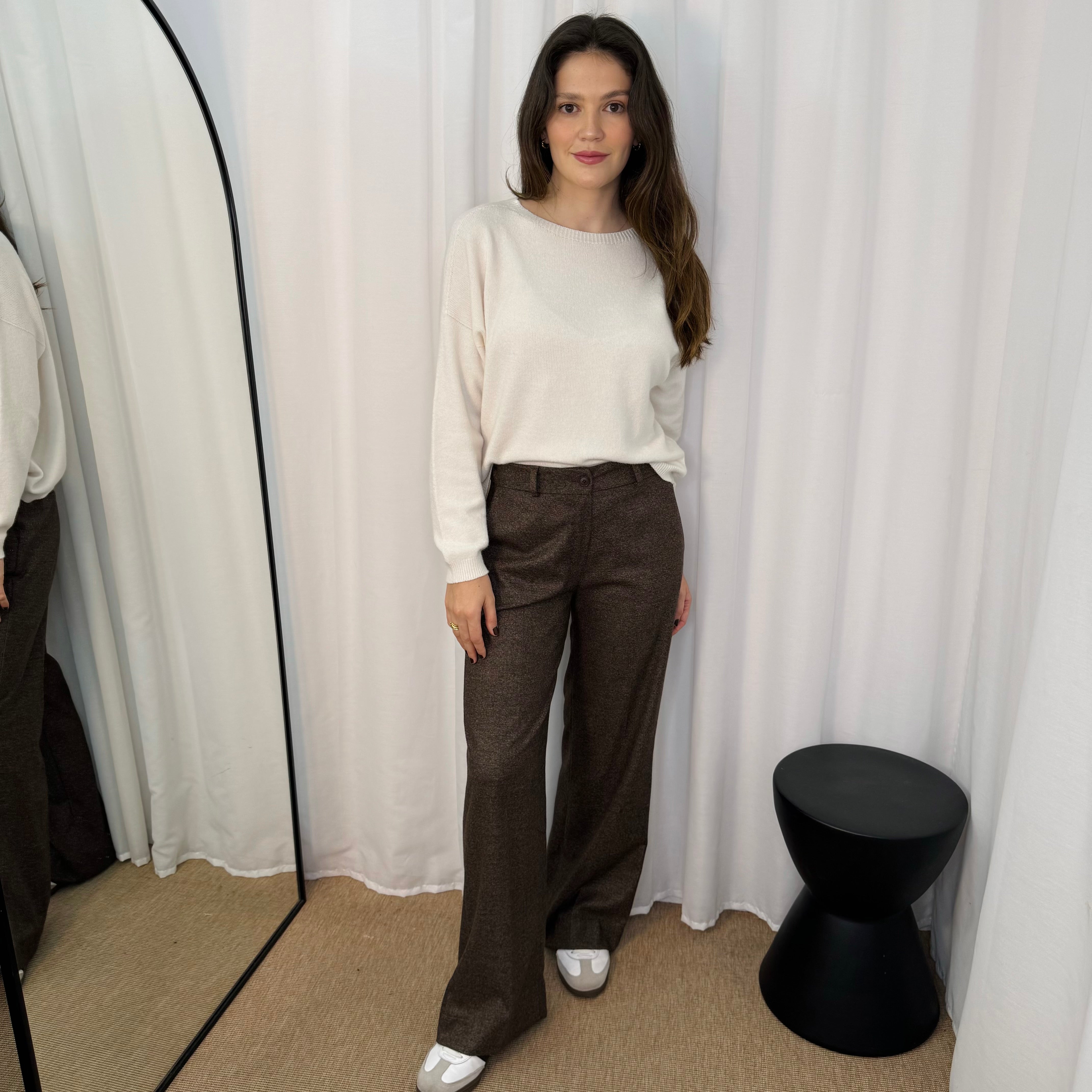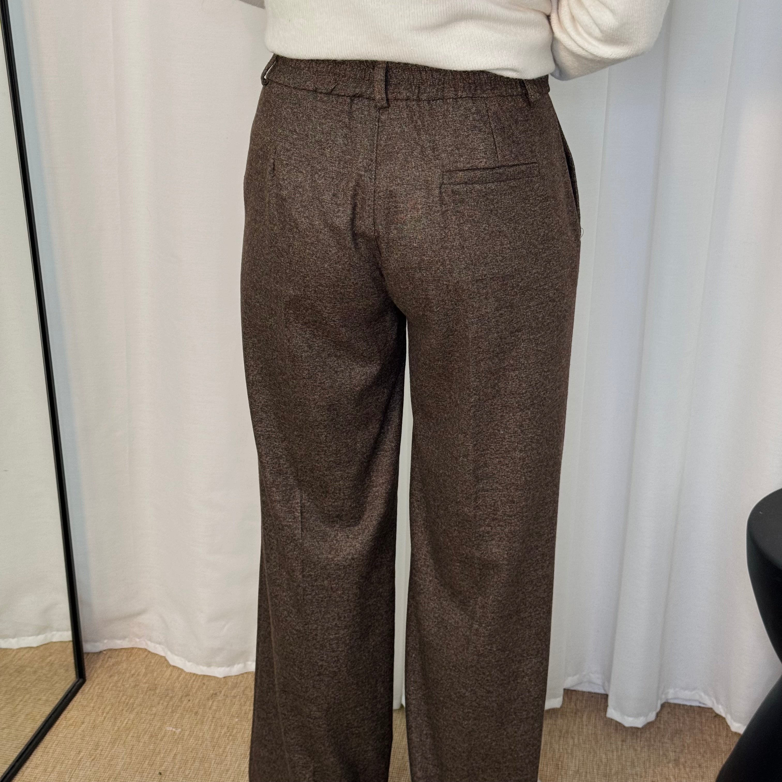 Calças modelo a direito. Aperta com fecho e botão. Bolsos laterais.