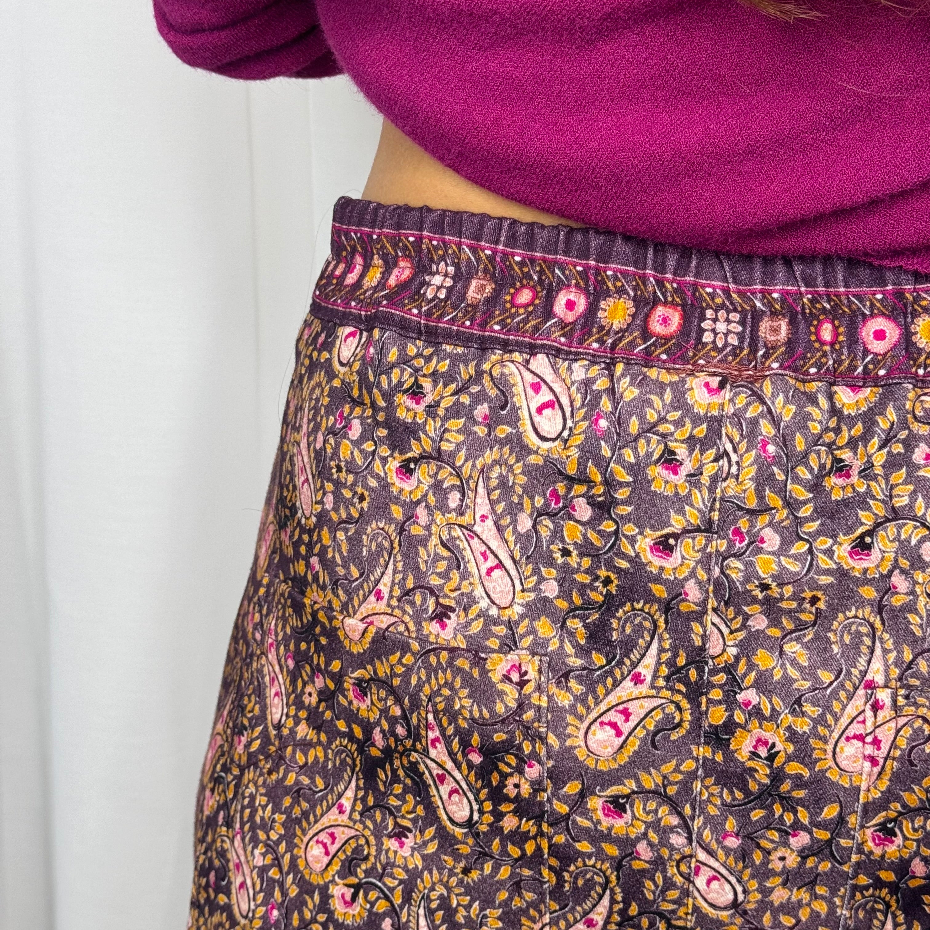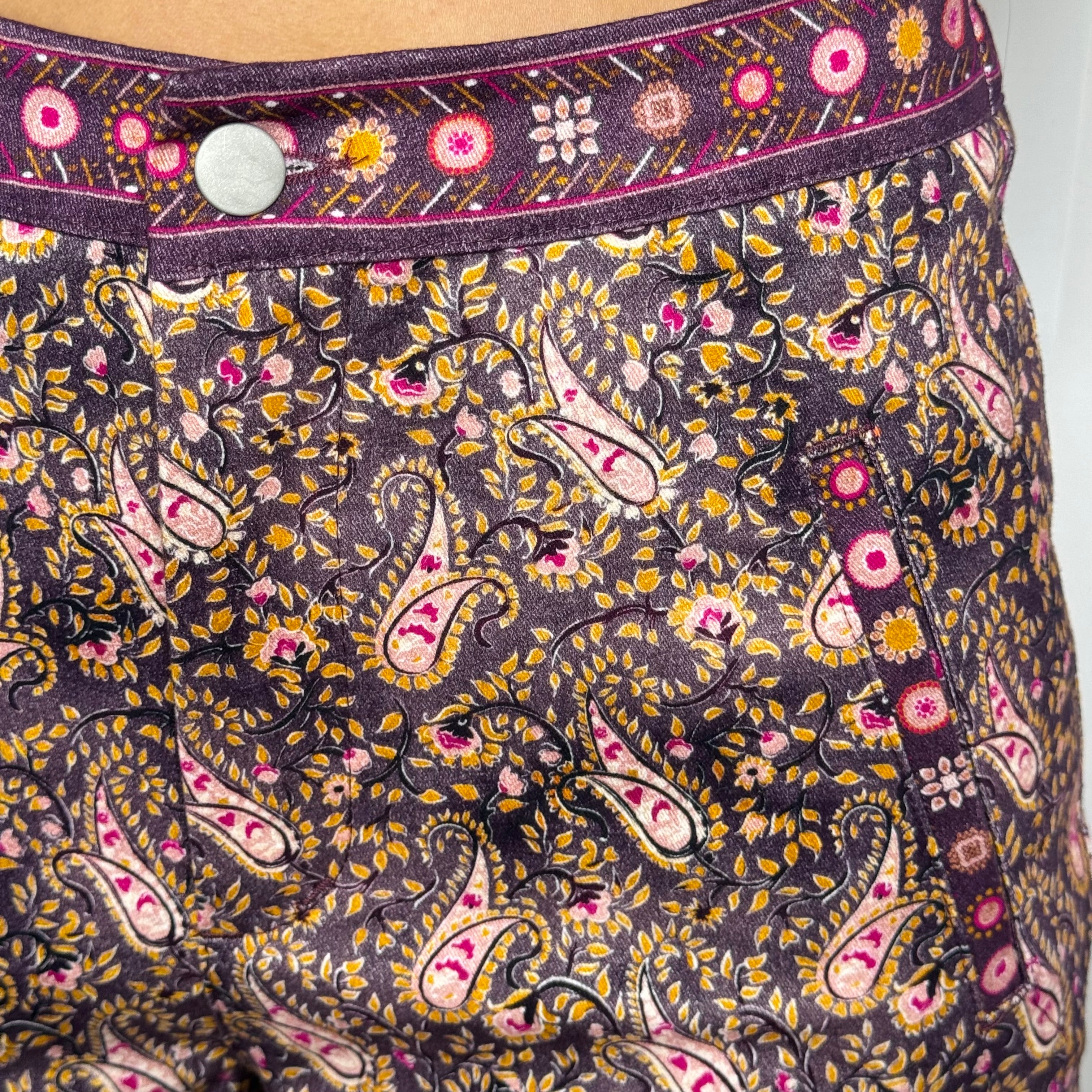Calças modelo baggy. Fundo beringela com estampado cornucópias. Bolsos laterais e traseiros. Aperta com fecho e botão.