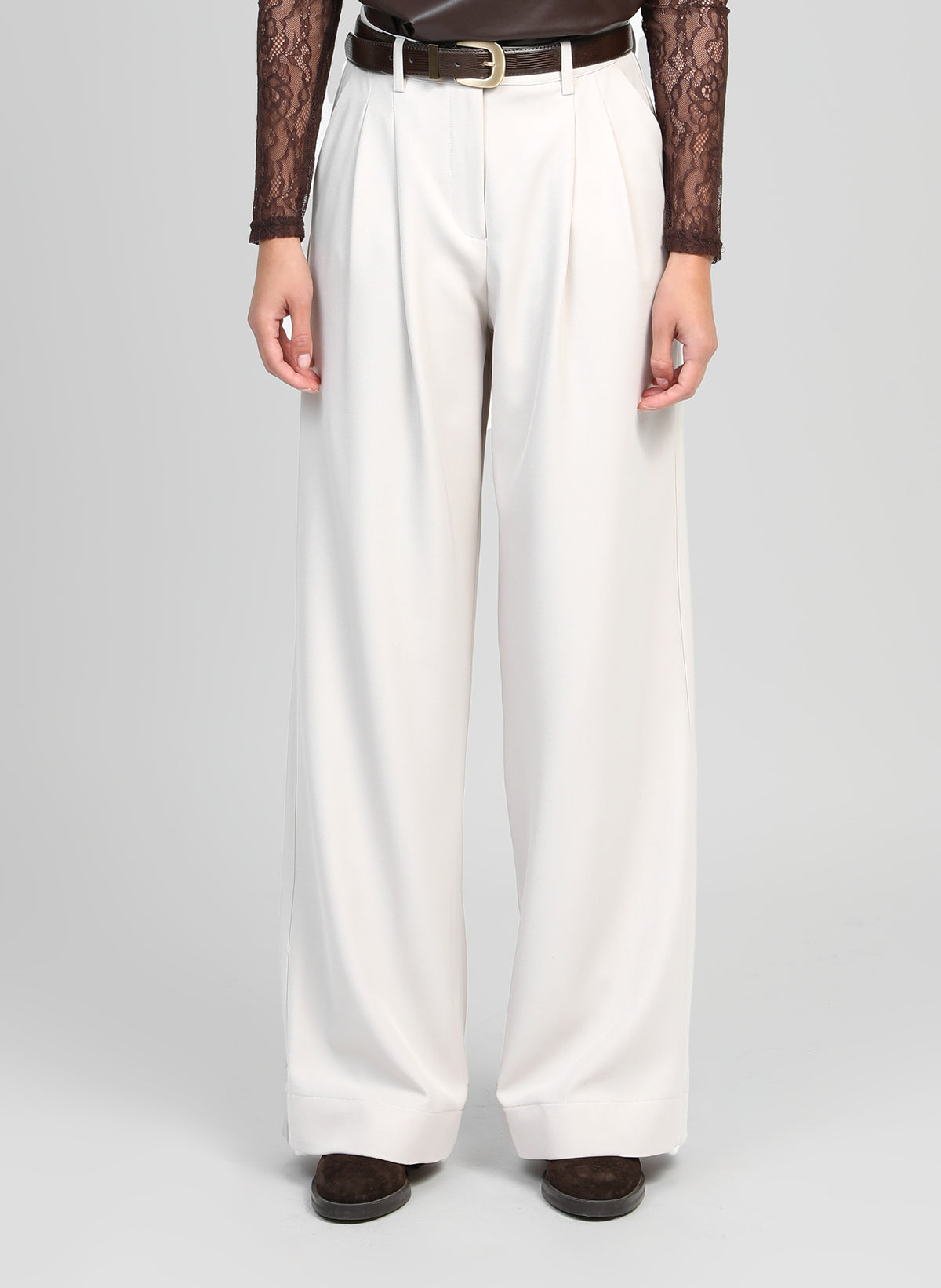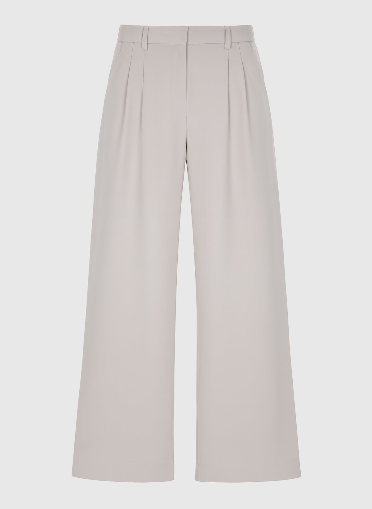 Calças modelo a direito com pregas. Bolsos laterais. Aperta com fecho e botão.