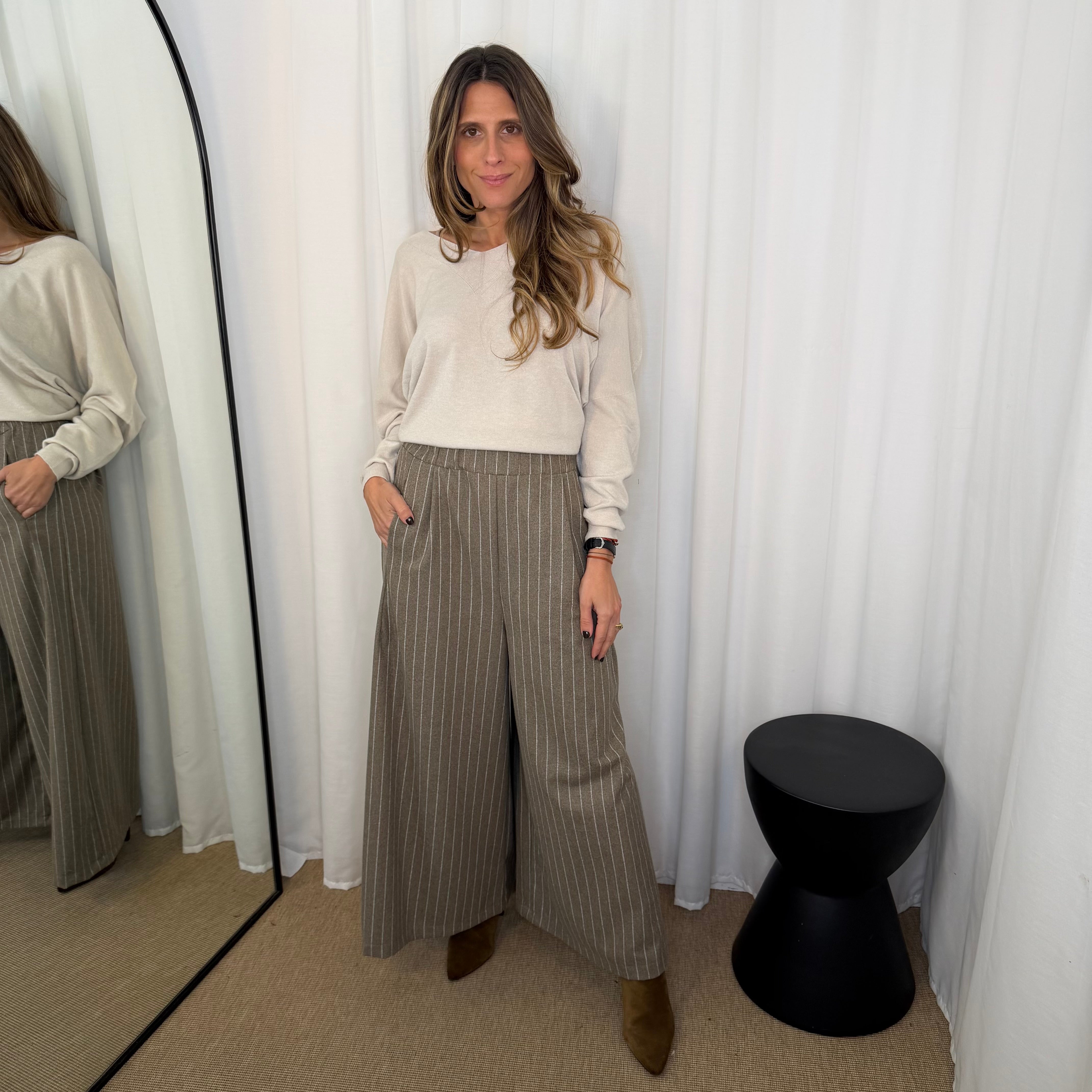 Calças modelo culotte fundo bege com riscas cru. Elástico na cintura. Bolsos laterais.