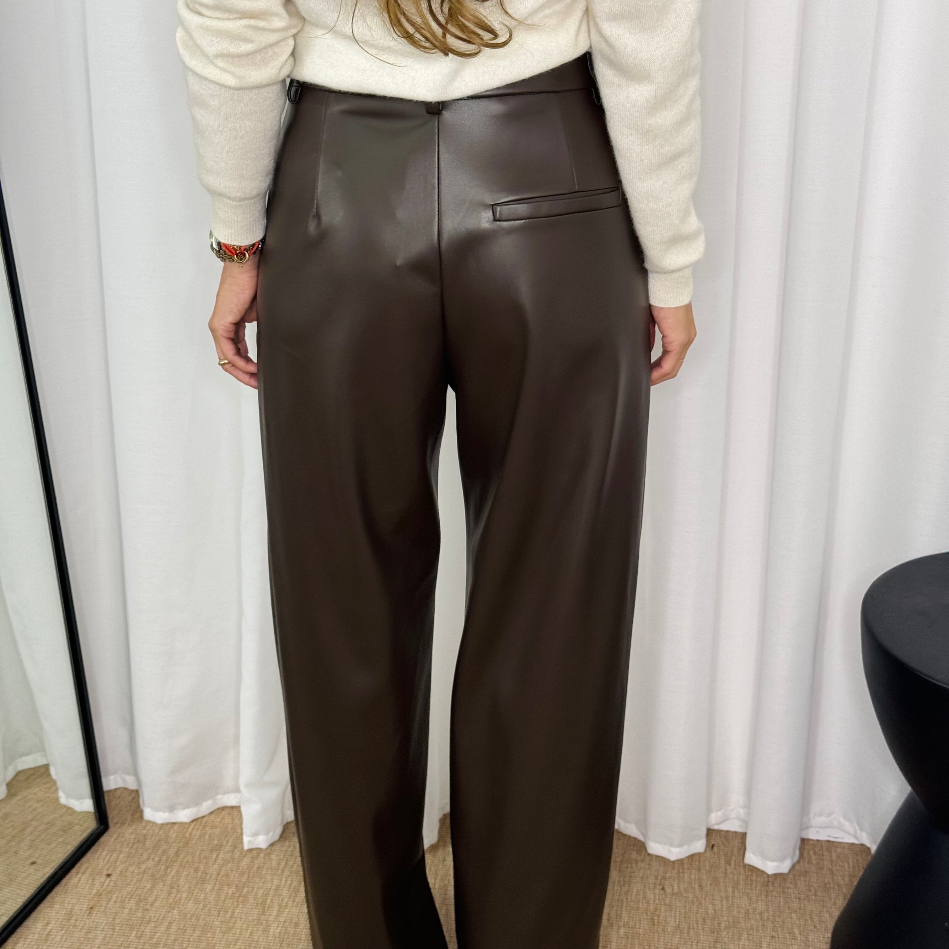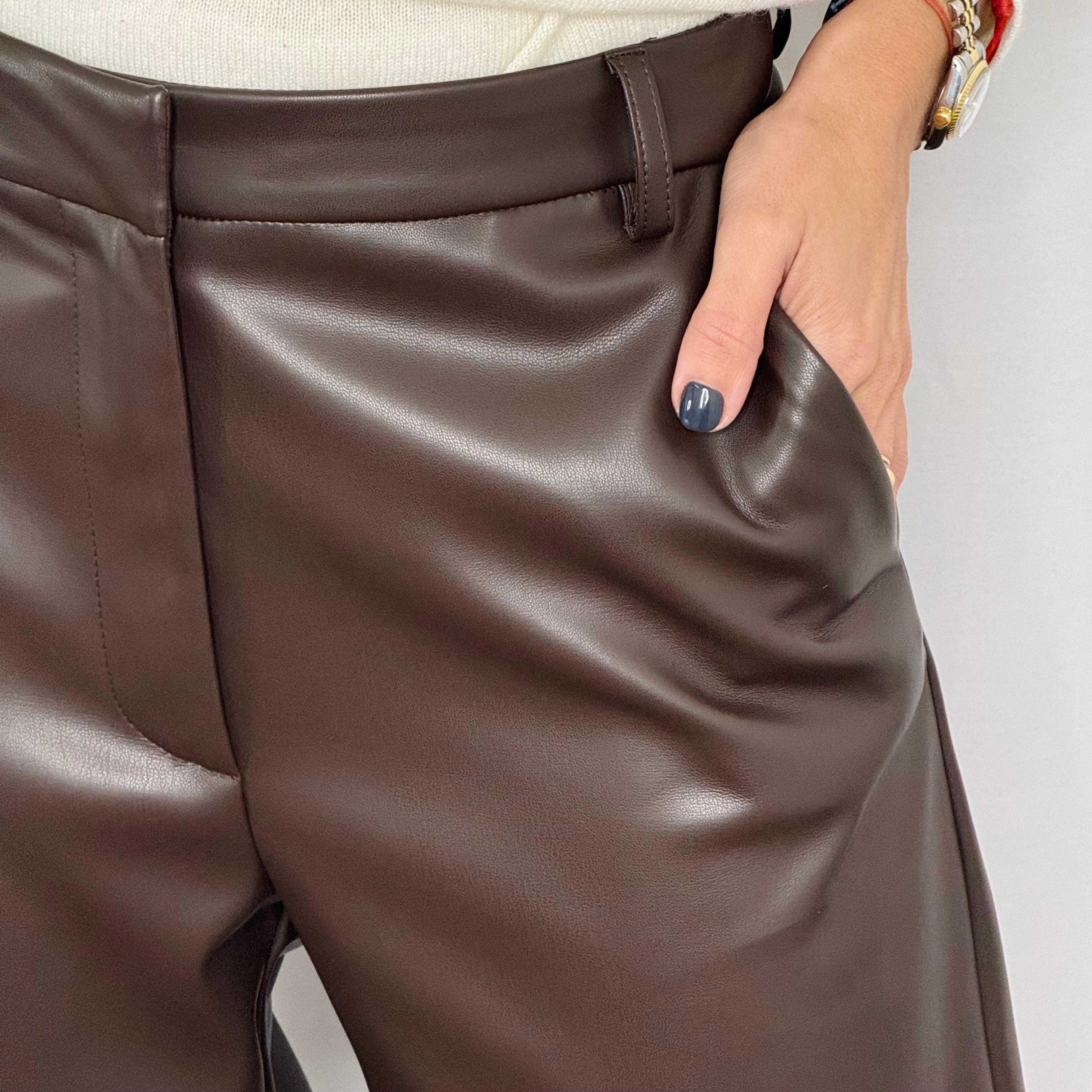 Calças modelo a direito em ecopele castanhas. Bolsos laterais. Presilhas na cintura. Aperta com fecho duplo e botão.