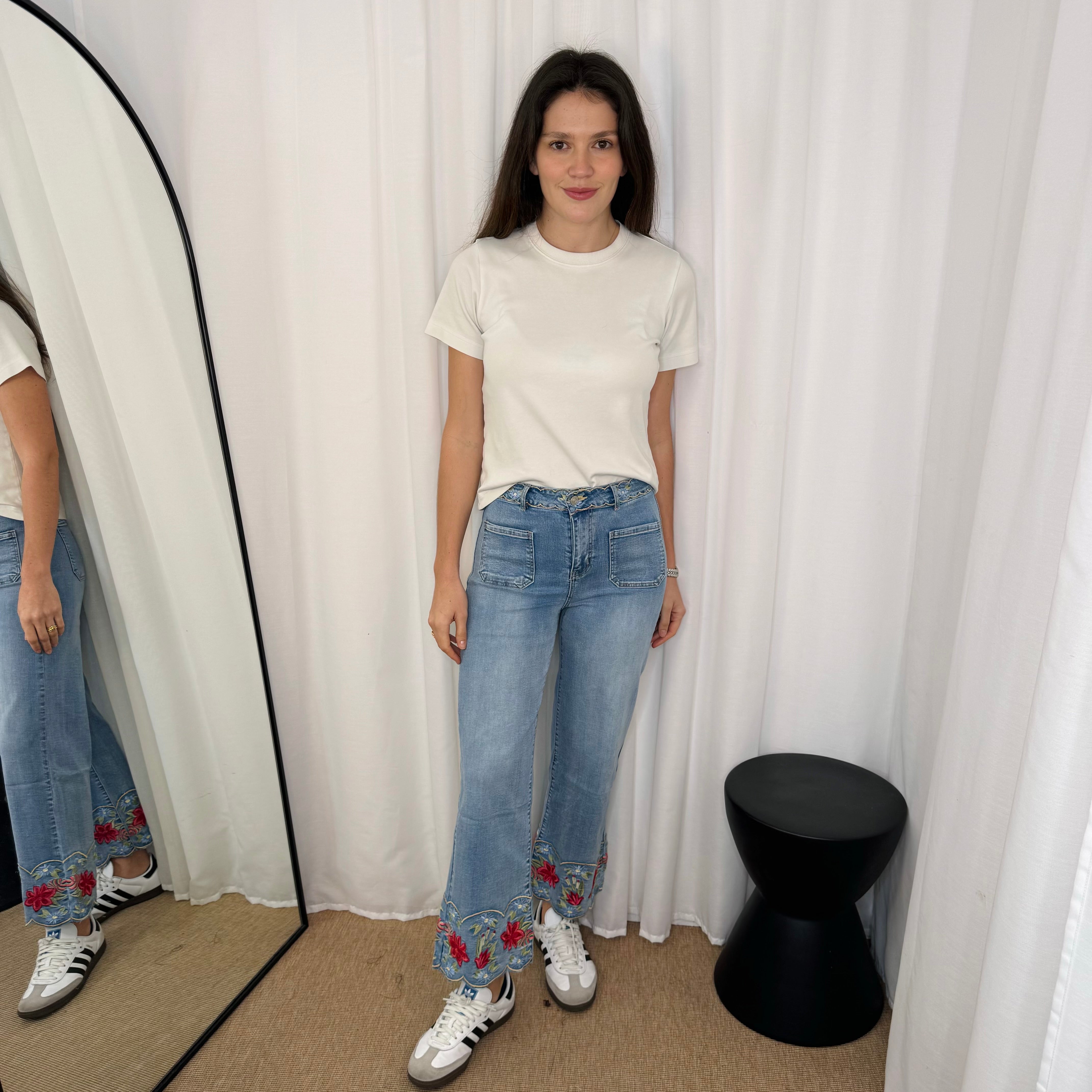 Calças de ganga. Bordados florais coloridos na bainha e cós. Aperta com fecho e botão. Presilha na cintura. Apostos de chapa à frente e traseiros.