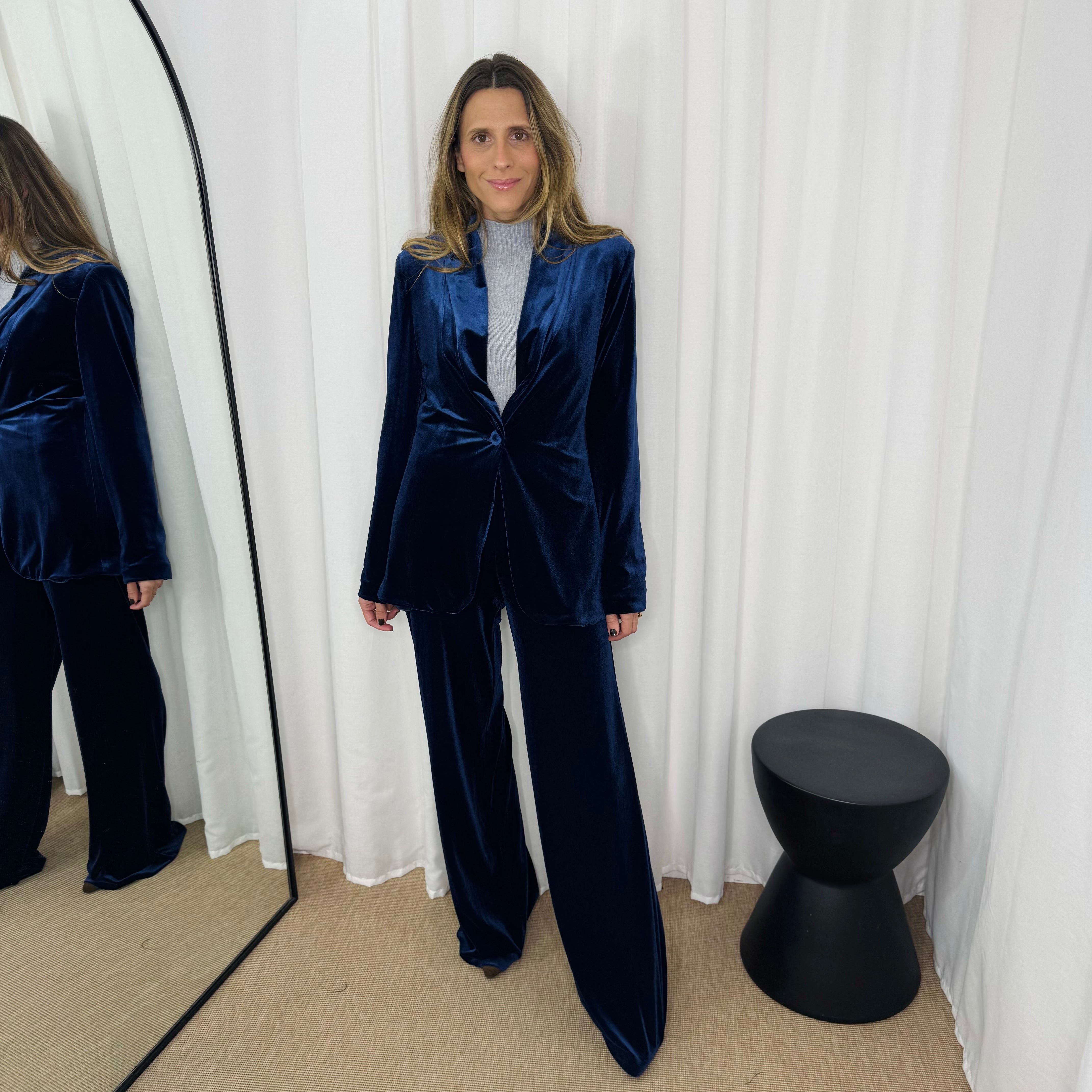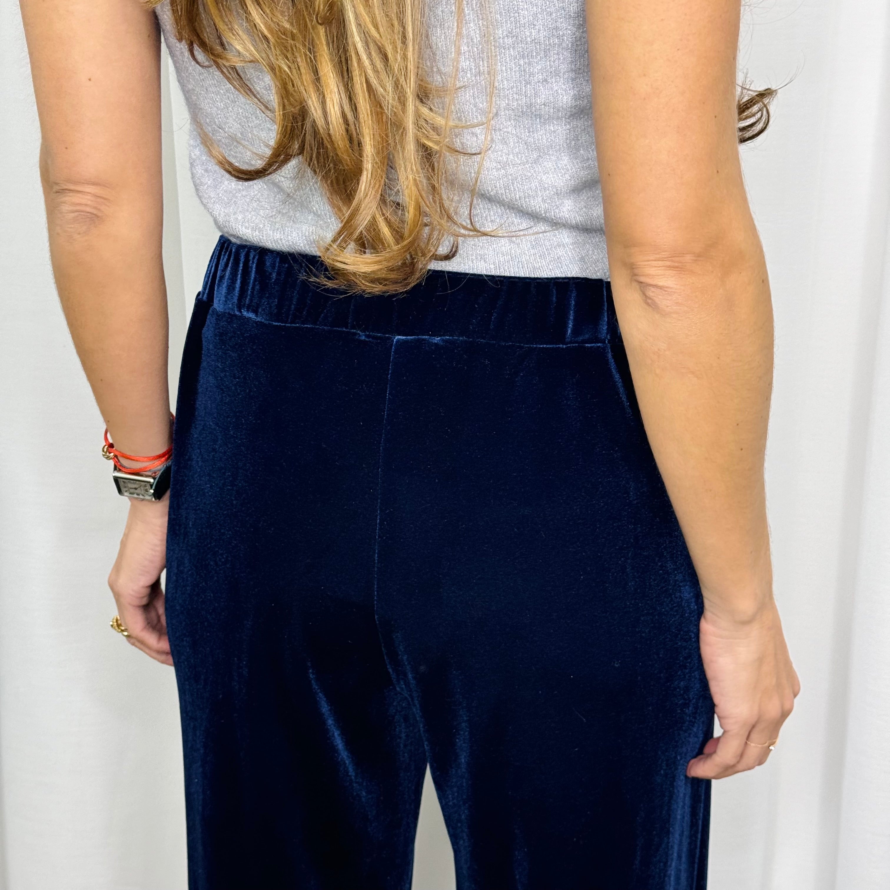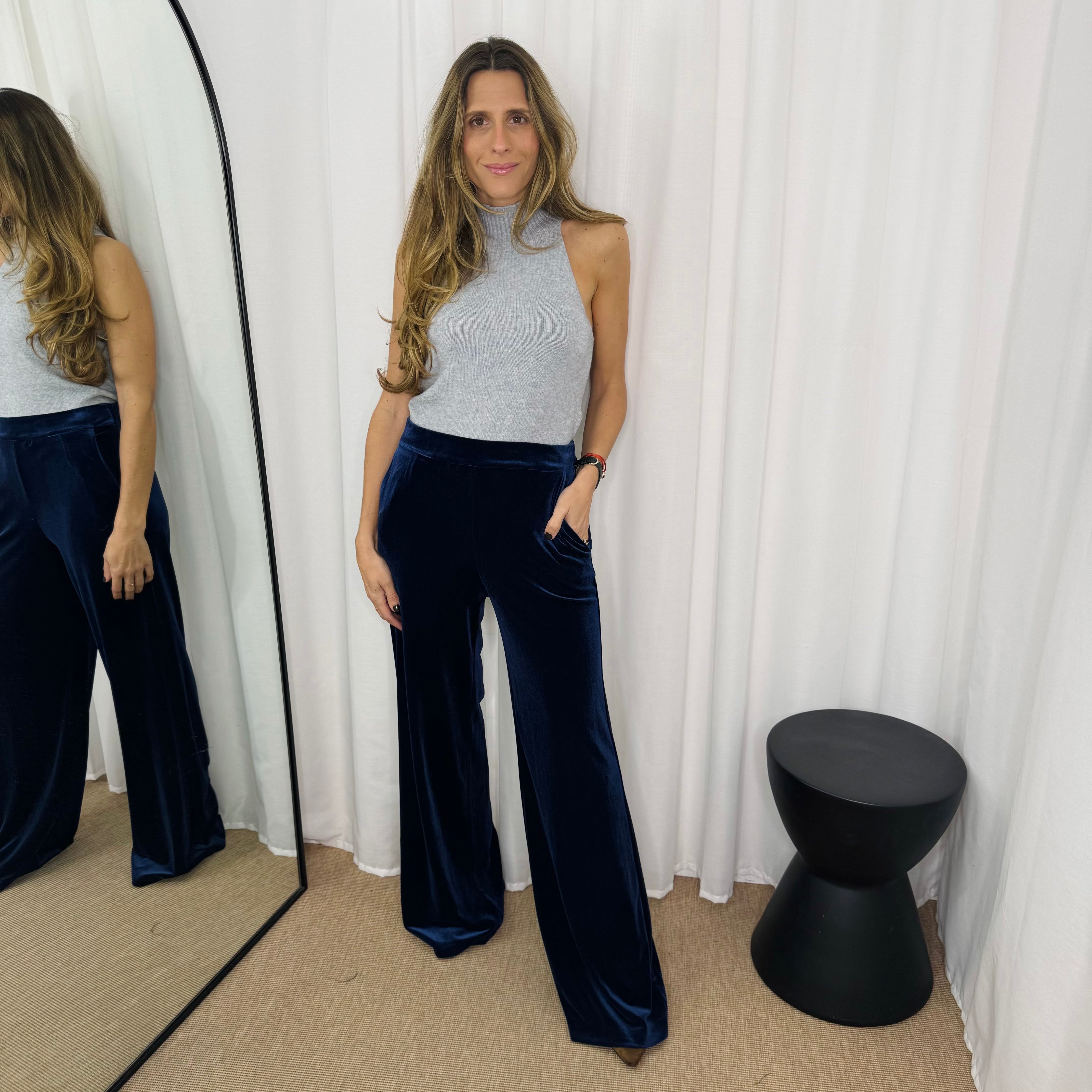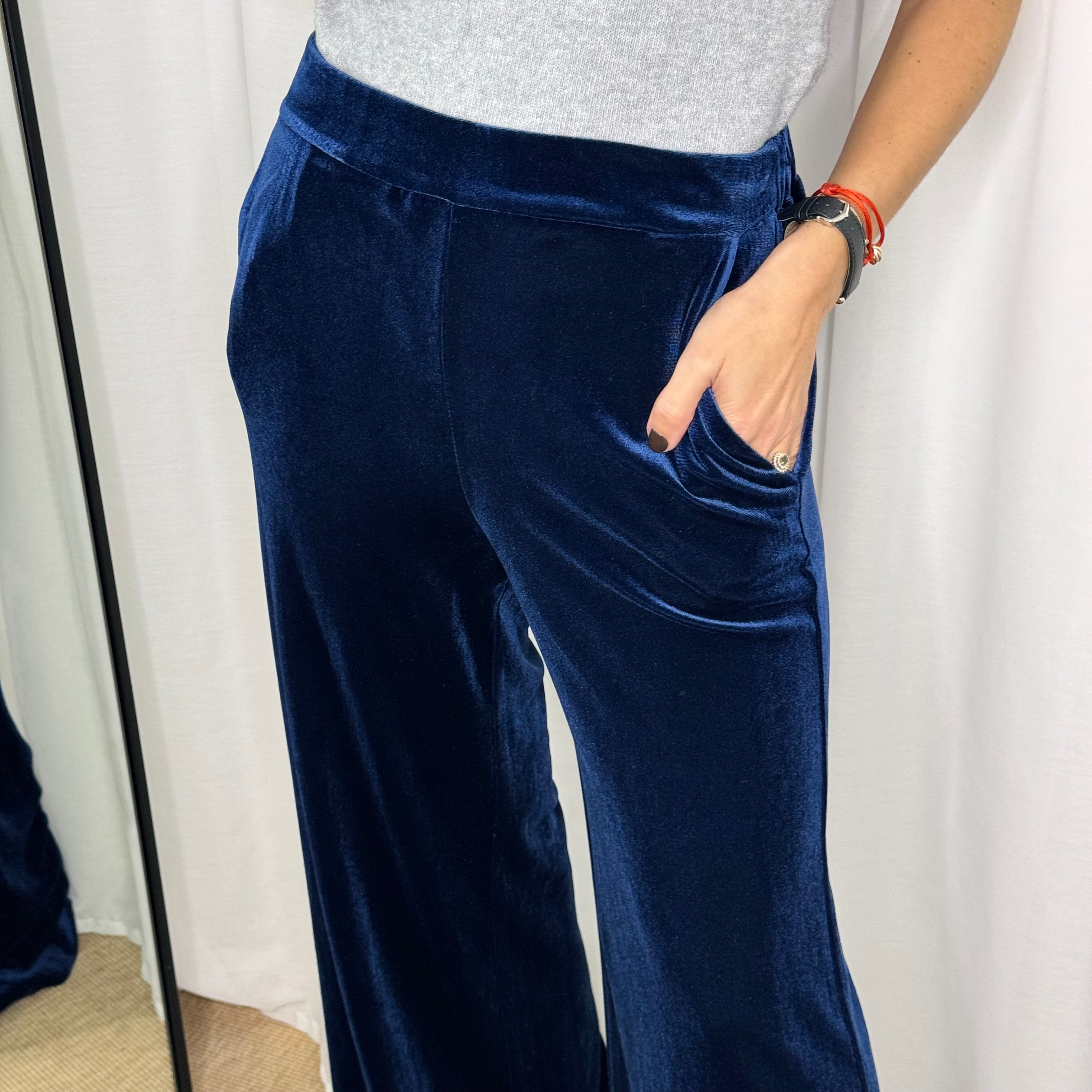 Calças modelo reto em veludo. Bolsos laterais. Elástico na cintura.