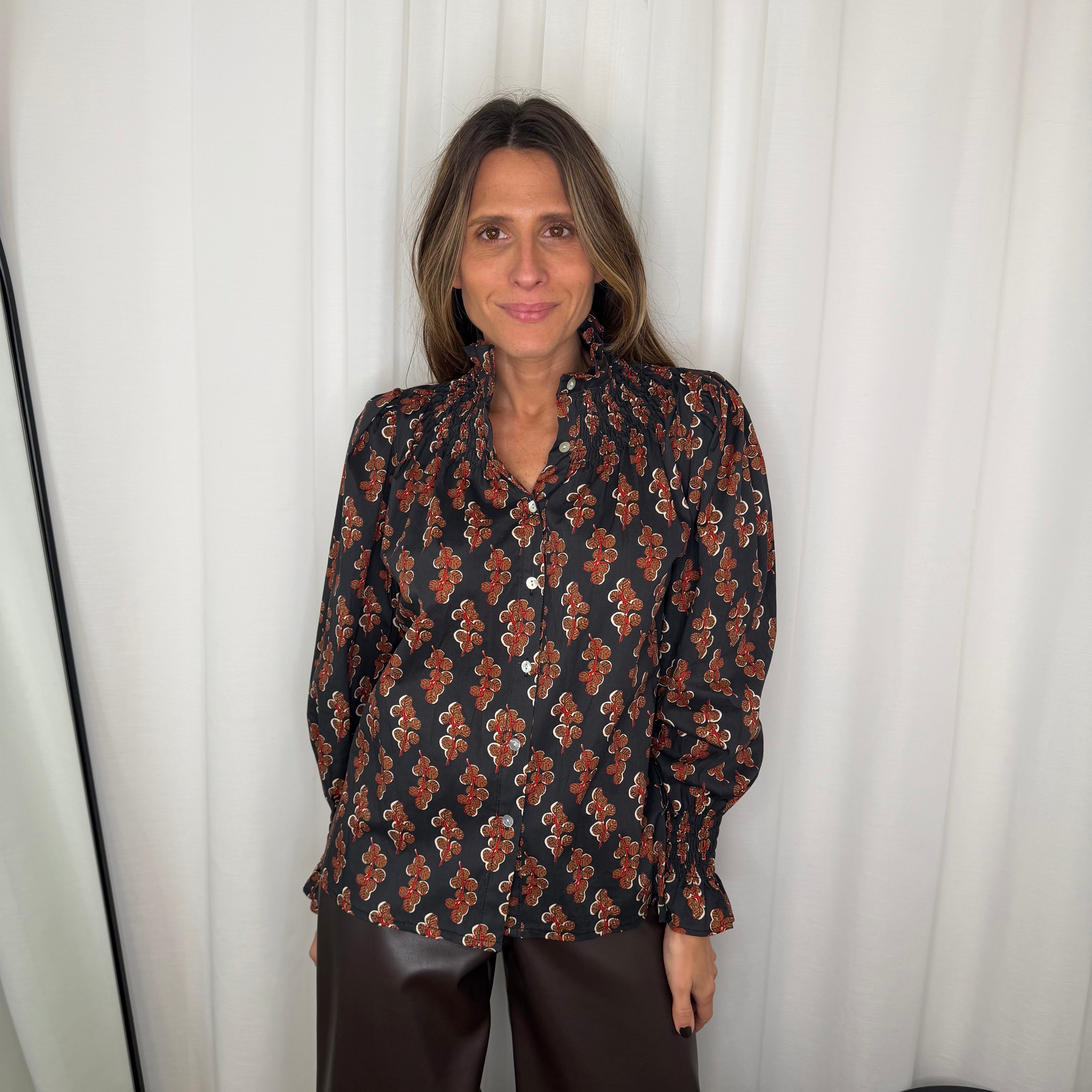 Camisa estampada. Aperta com botões ao centro. Favos na gola e punhos.