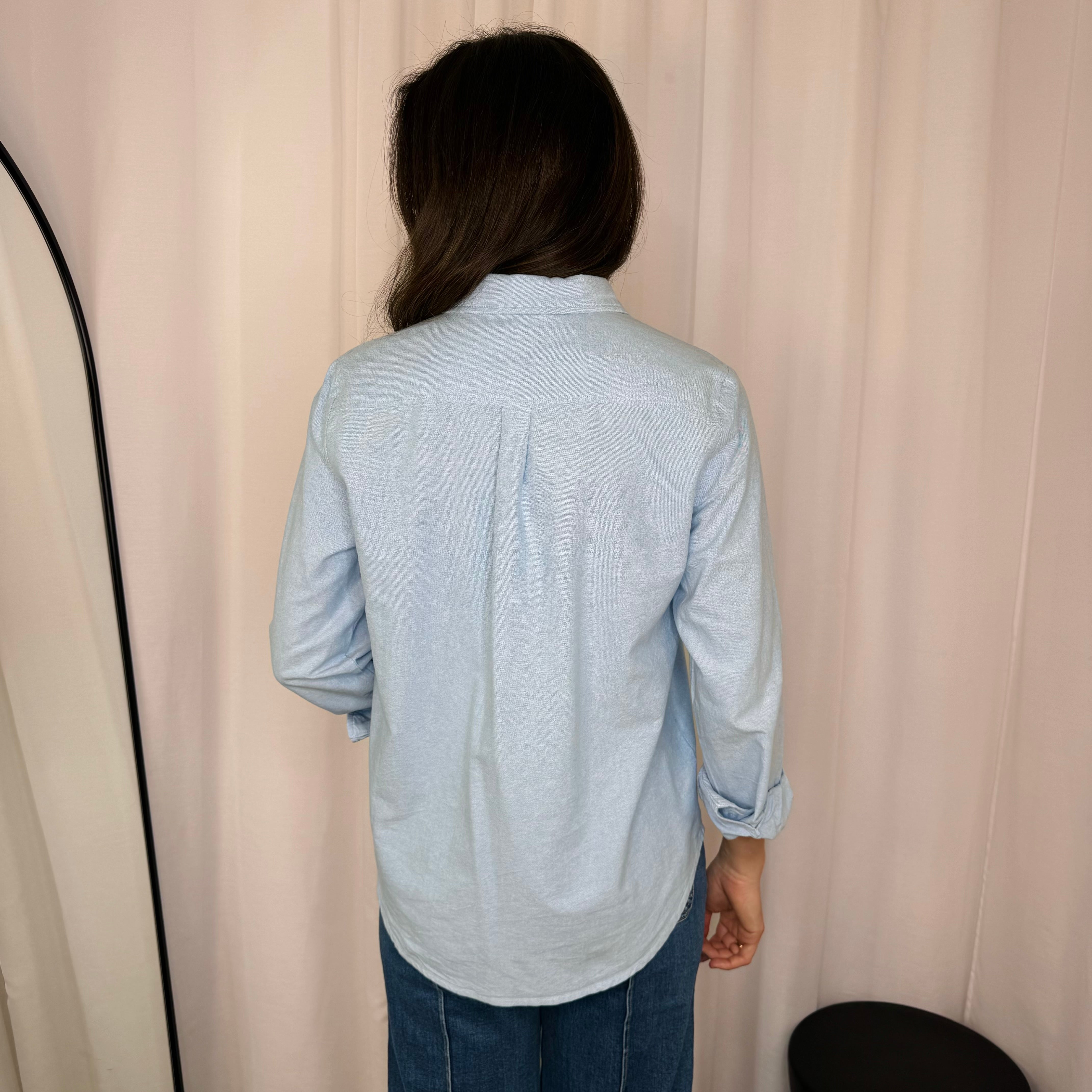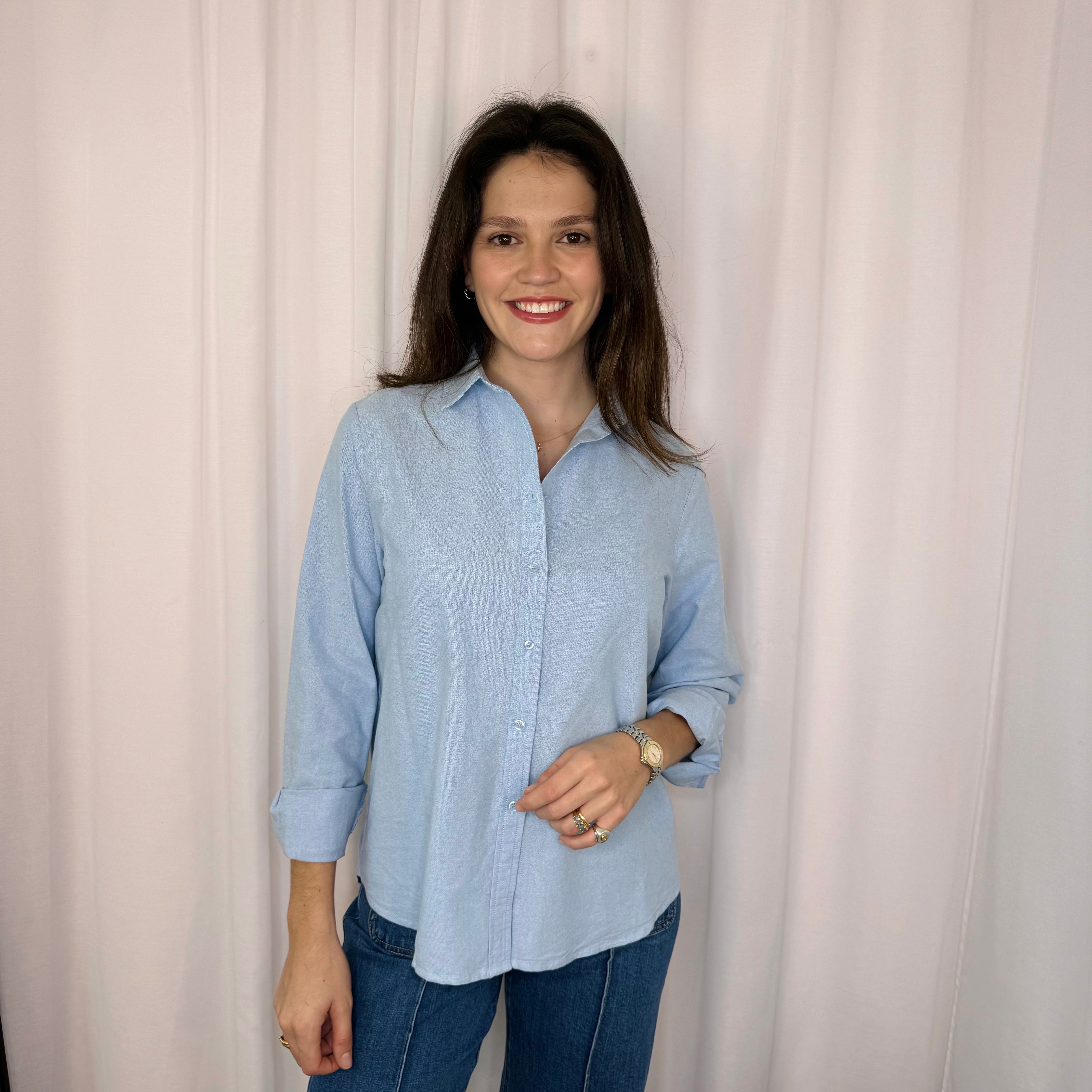 Camisa azul clara. Golas em aba. Aperta com botões ao centro. Botões nos punhos.