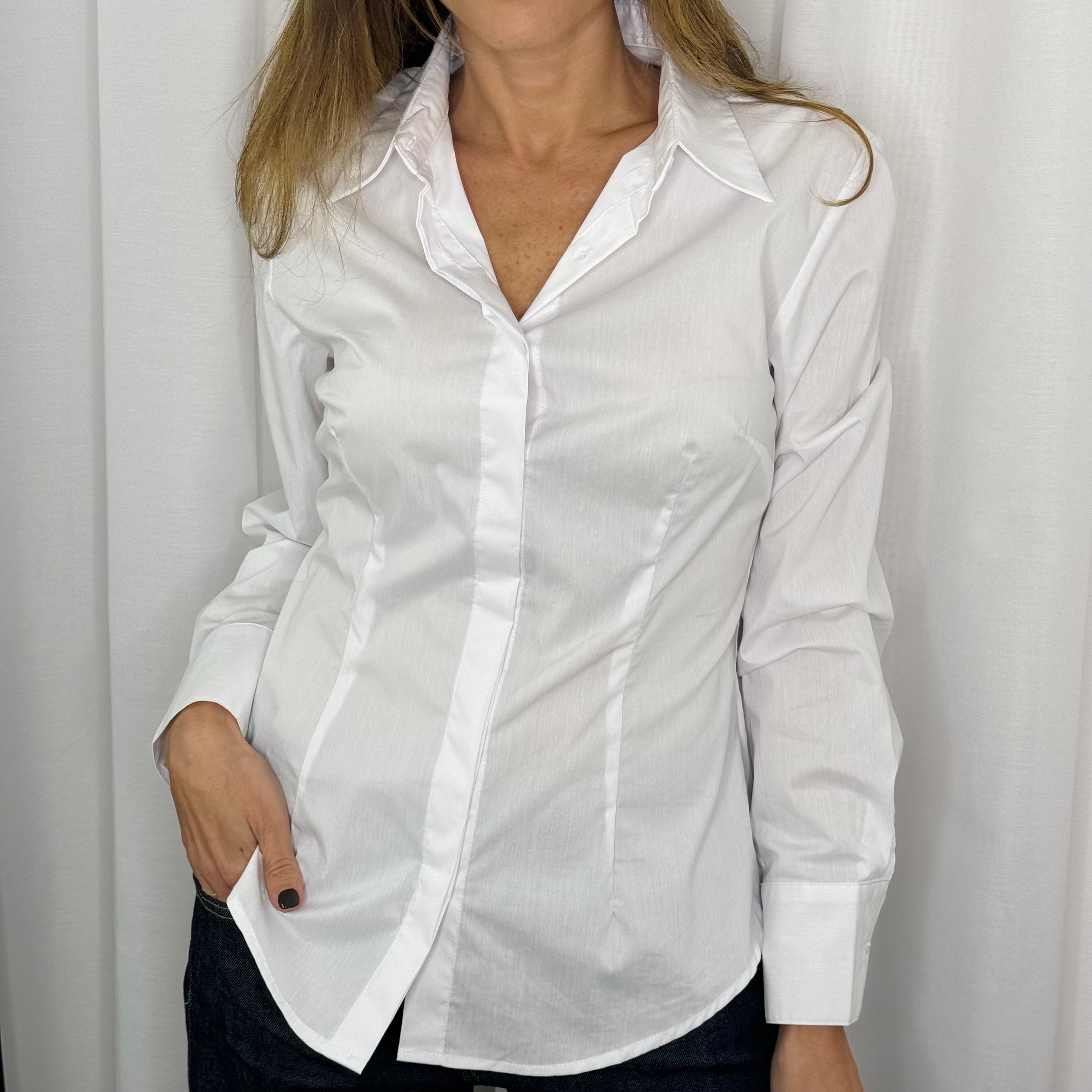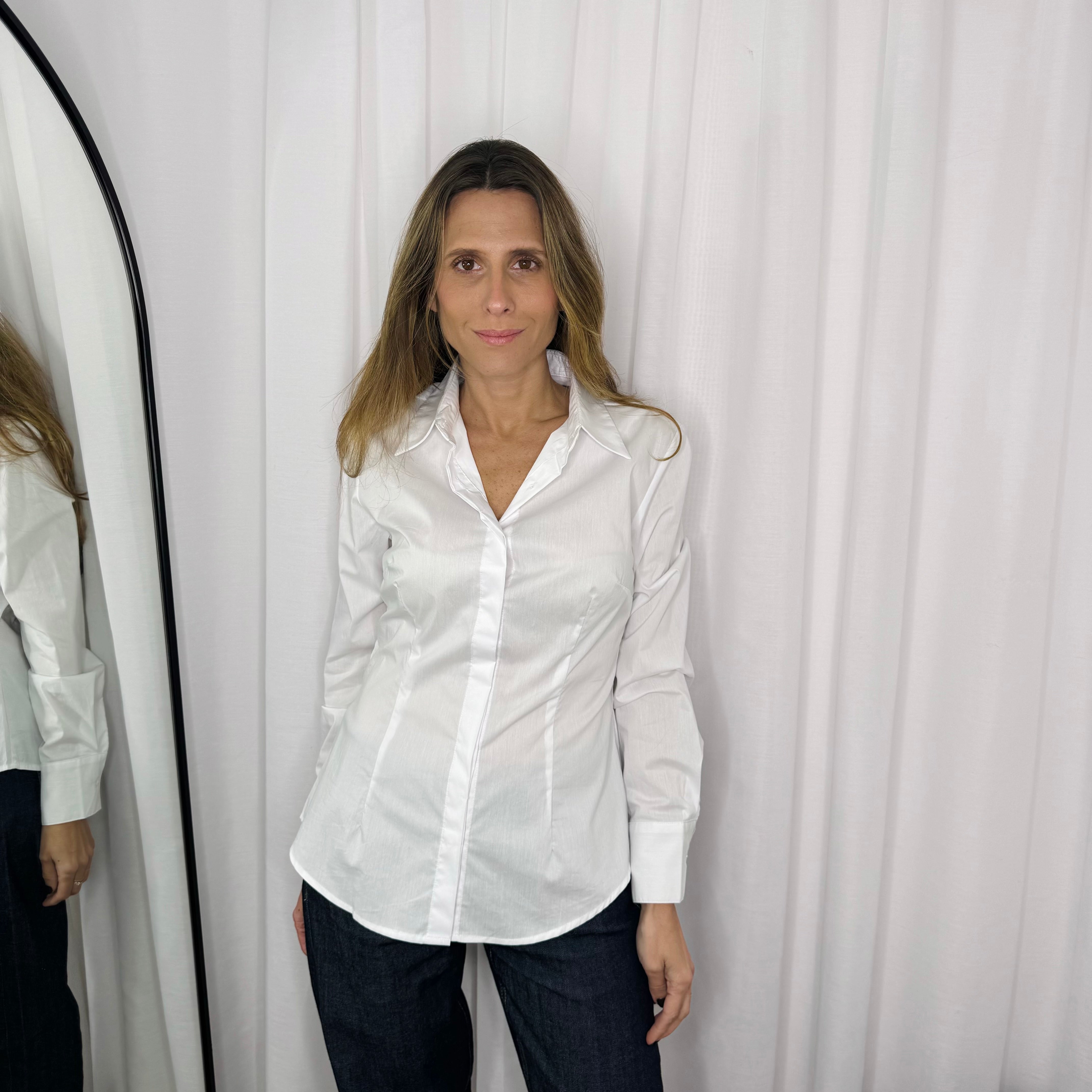Camisa branca slim. Gola em aba. Botões ao centro e nos punhos.