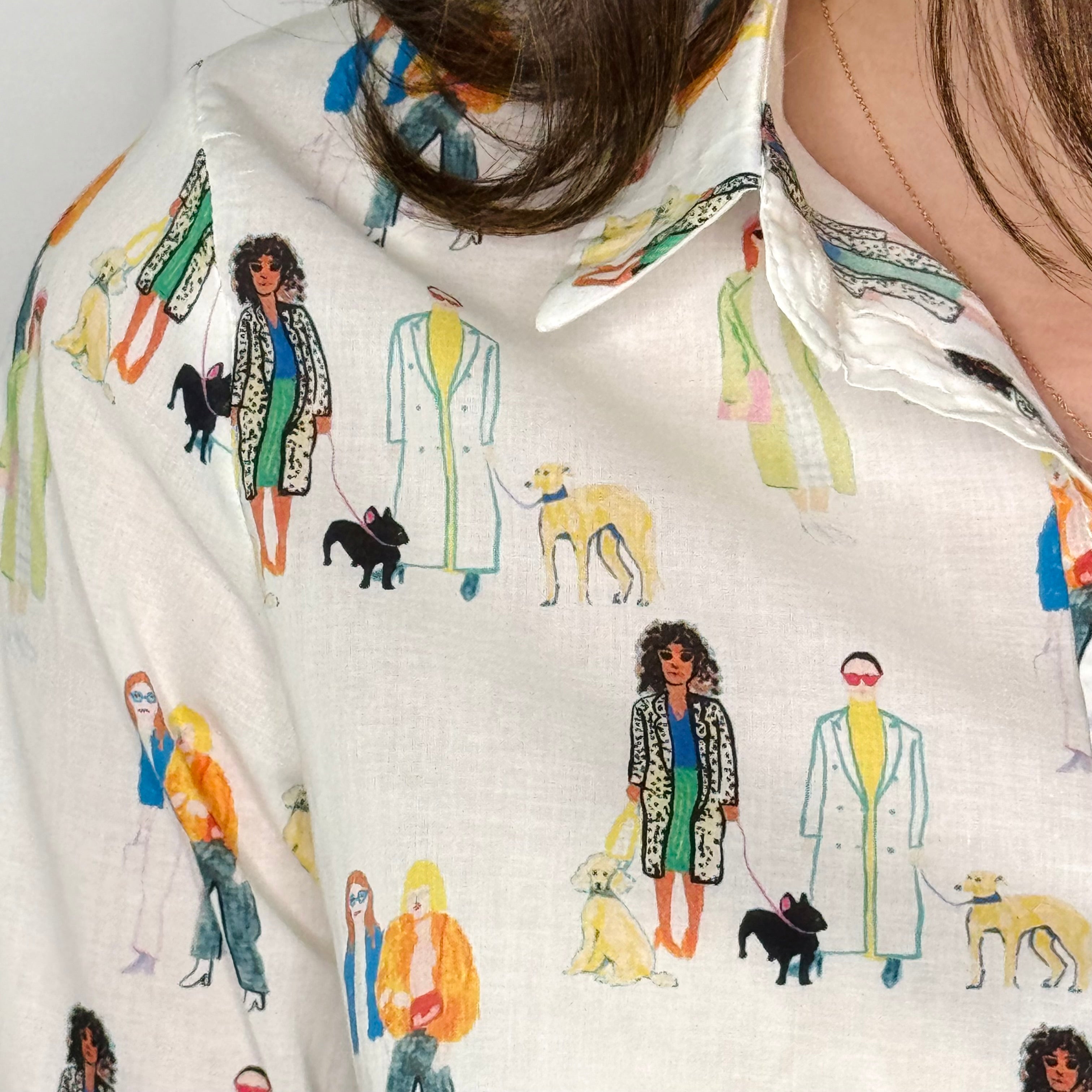 Camisa em algodão fundo branco. Estampado de desenhos de pessoas.